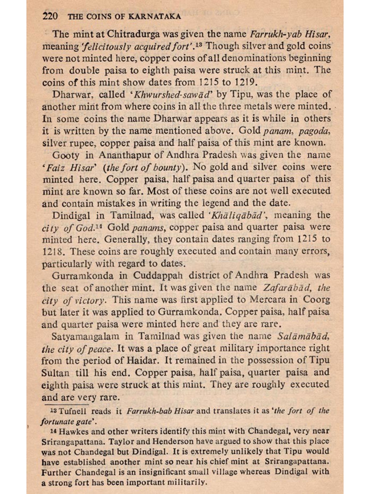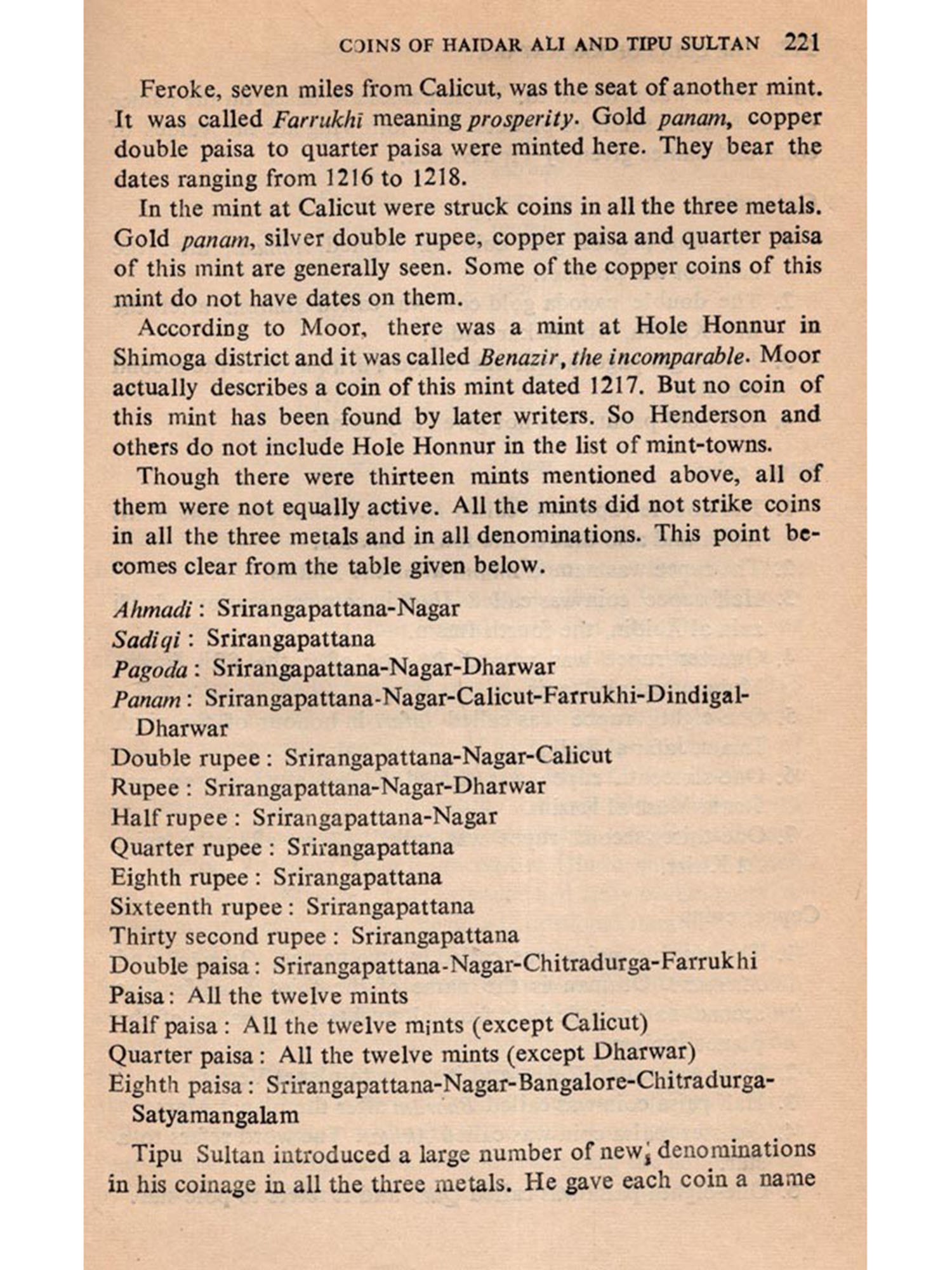 Henderson's Coins of Hyder Ali and Tipu Sultan (1921) is an important work on the subject. He has made a thorough study of the varied aspects of Tipu's coins. Probably it is the most exhaustive and systematic study of Tipu's coins.