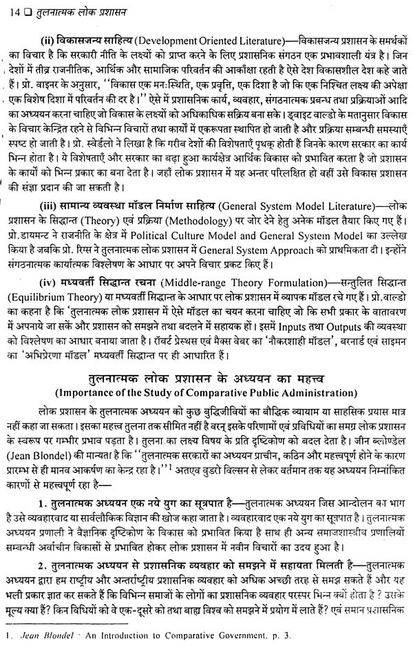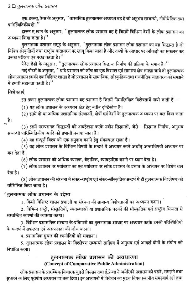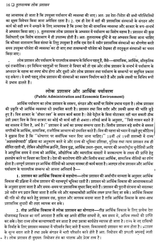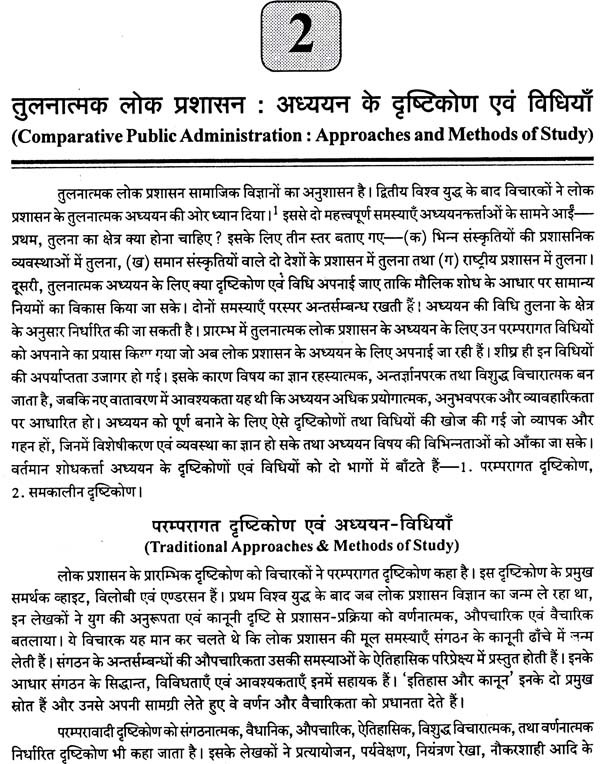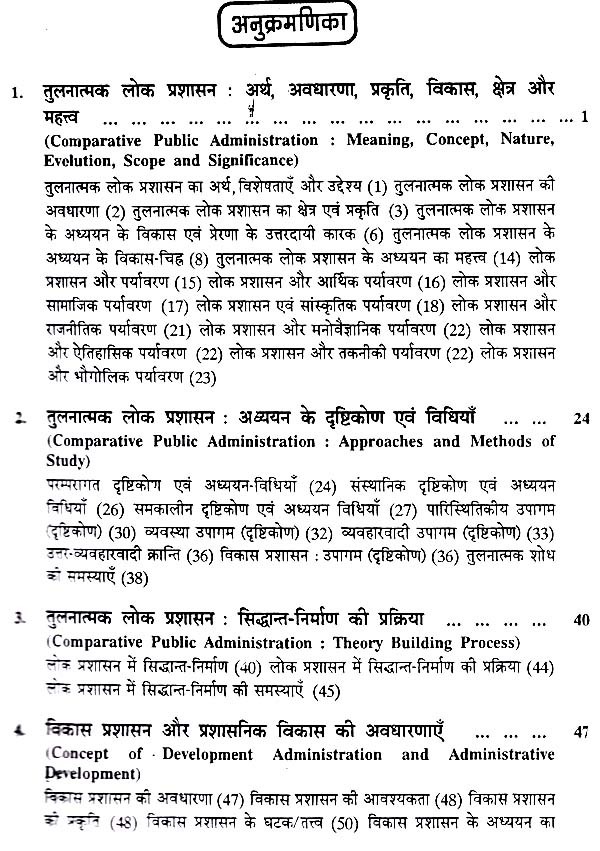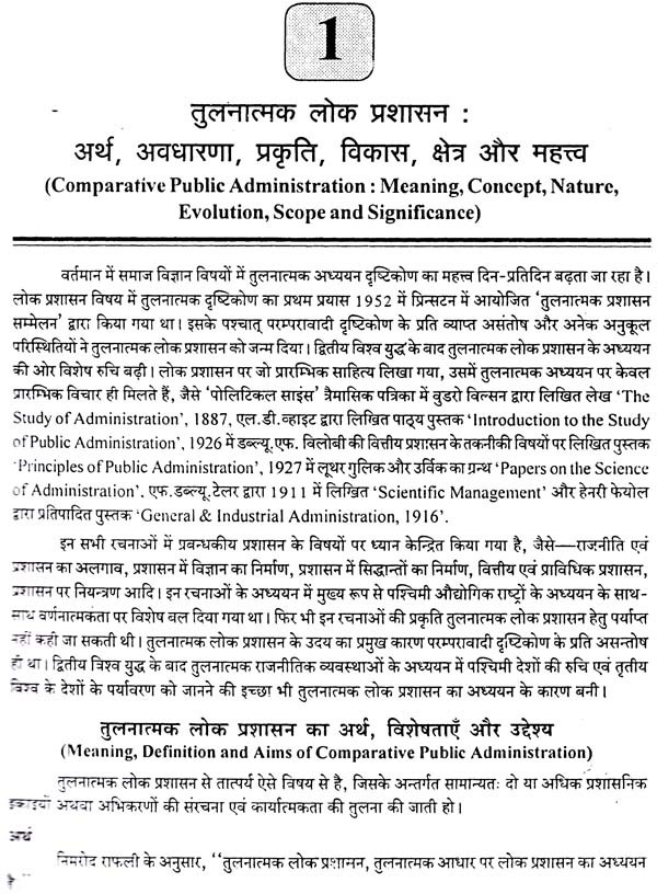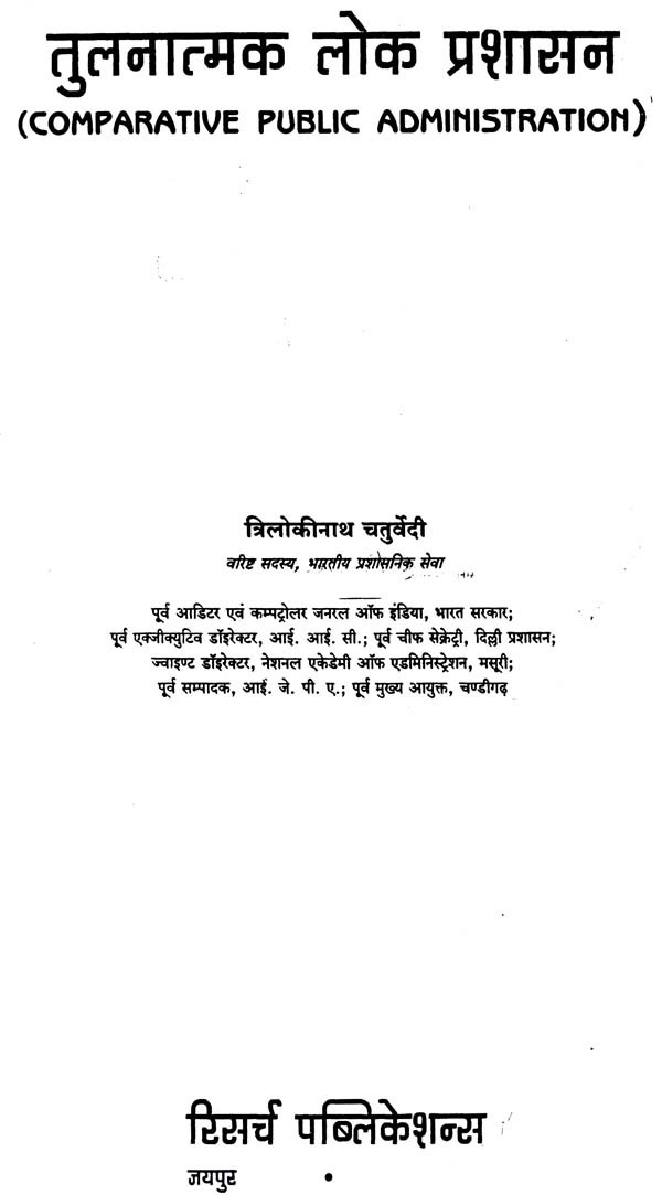 प्रस्तुत पुस्तक में जहाँ ब्रिटेन, अमेरिका और फ्रांस जैसे देशों की उपलब्ध नवीनतम प्रशासनिक संरचनाओं और संस्थाओं से पाठकों को परिचित कराना इसका उद्देश्य रहा है वहीं स्विट्जरलैण्ड, जापान, चीन, श्रीलंका, नेपाल, बंग्लादेश तथा पाकिस्तान की लोक प्रशासन सम्बन्धी व्यवस्था का तुलनात्मक संदर्भ में विवेचन किया गया है। इस प्रकार विश्व के सभी प्रमुख विकसित एवं विकासशील देशों की जानकारी होने के कारण इस पुस्तक की उपादेयता बढ़ गई है। इस दृष्टि से पुस्तक को पाठक पूर्ण उपयोगी पायेंगे। पश्चिमी शोधकर्ताओं ने जो तुलनीय माना है उसे रिग्ज या वीडनर के प्रतिमानों द्वारा विश्लेषित कर विद्यार्थी को समुचित जानकारी दी गई है परन्तु विश्लेषण और विवेचना की दृष्टि से यह पूरा क्षेत्र ही अभी अविकसित है जिस पर गहन शोध की आवश्यकता स्पष्ट एवं गम्भीर है। फिर भी, जानकारी, ज्ञान और उपलब्ध सामग्री के सम्यक् एवं व्यवस्थित नियोजन से प्रस्तुत प्रयांस अधिकतम उपयोगी एवं स्पृहणीय बन पड़ा है। आशा है इसे विज्ञ पाठक उपयोगी पायेंगे।