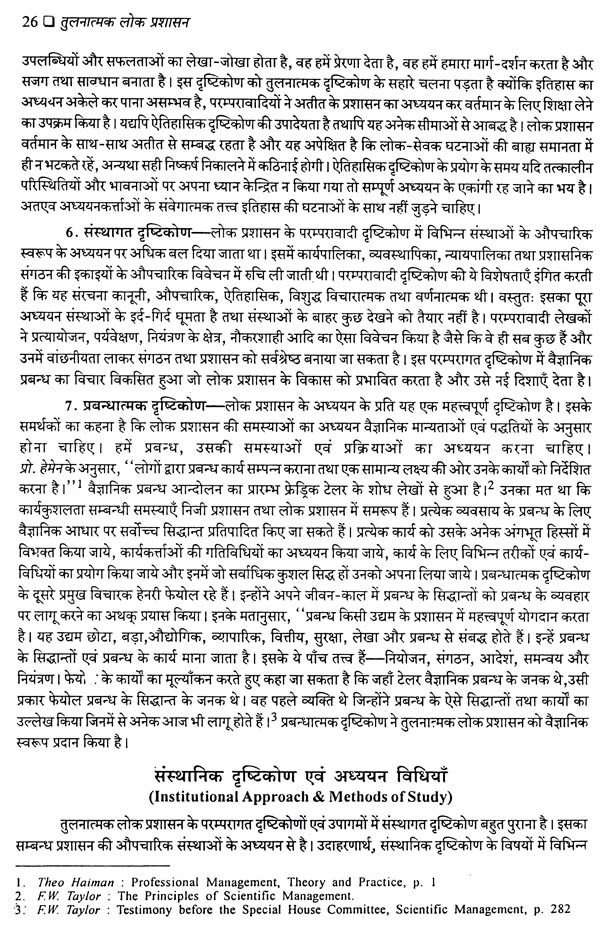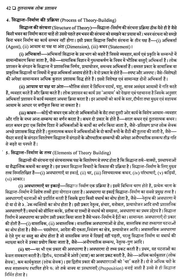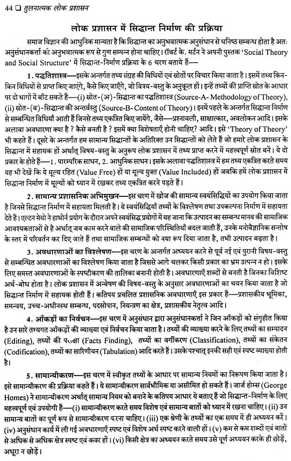 प्रस्तुत पुस्तक अभी इन प्रश्नों से नहीं जूझ रही है। इसमें संस्थागत तुलना पर ही अधिक बल दियाँ गया है और इस दृष्टि से यह अत्यन्त उपयोगी भी है। इन मूल तथ्यों को जाने बिना सिद्धान्त-निर्माण के क्षेत्र की तुलना को किसी प्रकार की सार्थकता नहीं दी जा सकती। लेखक ने तुलनात्मक लोक प्रशासन के विद्यार्थियों के लिए एक आधारभूत अधिसंरचना प्रस्तुत की है। यह ज्ञान उन्हें व्यवहार और प्रक्रियाओं में अन्तर्दृष्टि प्रदान कर तुलनात्मक अध्ययनों के नये अध्याय खोलने में सहायता कर सकेगा। तुलनात्मक ज्ञान स्वयं अपने आप में एक विकासमान उपलब्धि है, रिग्ज हमारा आदि और अन्त नहीं हो सकता। केवल अमेरिका को भी यह अधिकार कैसे दिया जा सकता है कि वह भावी लोक प्रशासन की दशा और दिशा को अपने मापदण्डों से नापे। तुलना में किसकी तुलना, किससे, फिर कैसे और कहाँ तक की जाये, ये अहम् प्रश्न हैं। माडल निर्माण हमारी सहायता करते हैं, पर 'सिद्धान्त निर्माण' को किसी भी अध्ययन शास्त्र की रीढ़ की हड्डी कहा जा सकता है। आज का तुलनात्मक लोक प्रशासन भारी वैचारिक संकट से ग्रस्त और त्रस्त है। इसे इस कीचड़ से निकाल कर नई सम्भावनाओं के द्वार तक पहुँचाना विद्वत वर्ग के लिए चुनौती है। काश हम इसे स्वीकार कर इसकी समस्याओं के समाधान ढूंढ़ सकें।