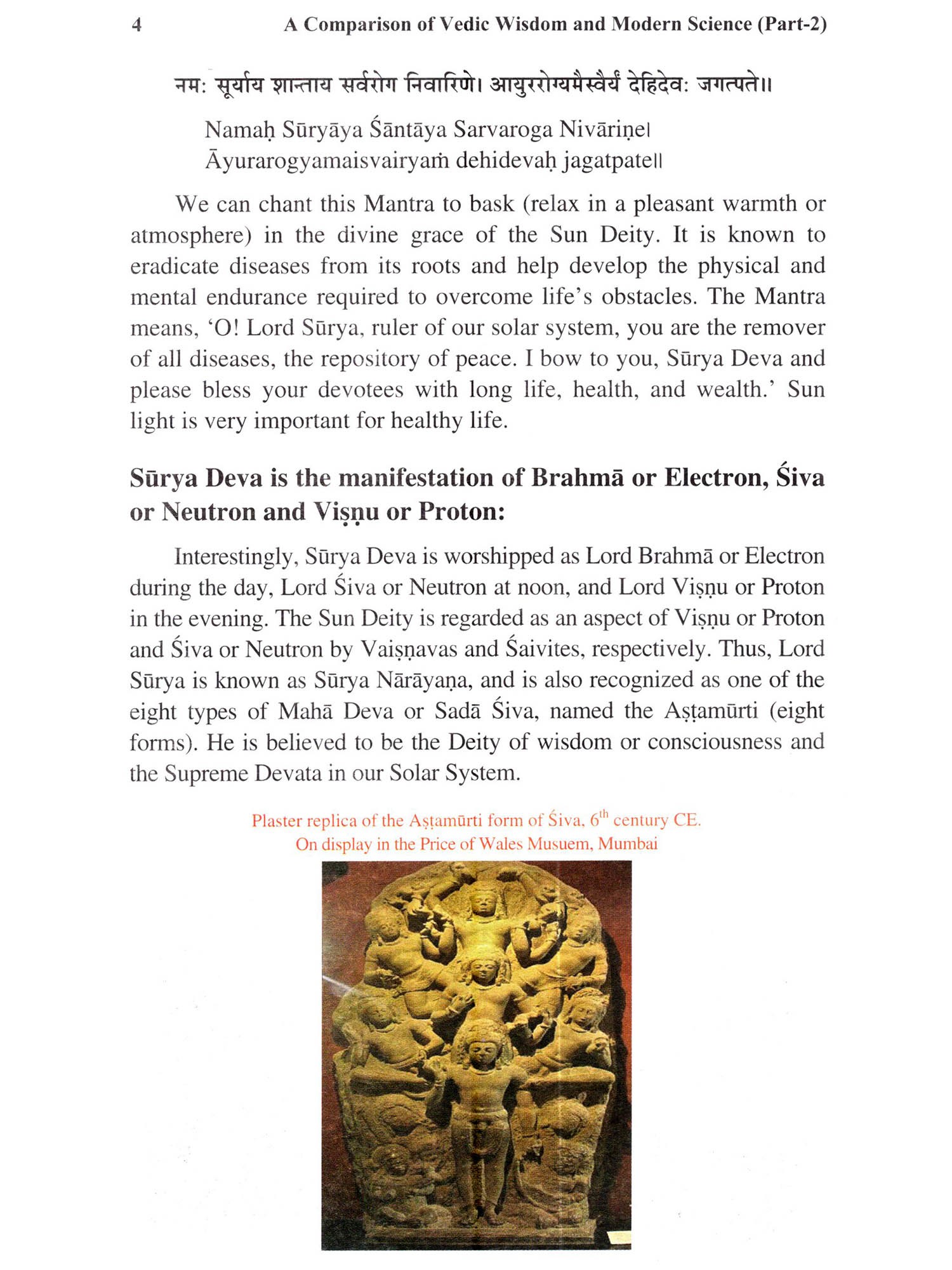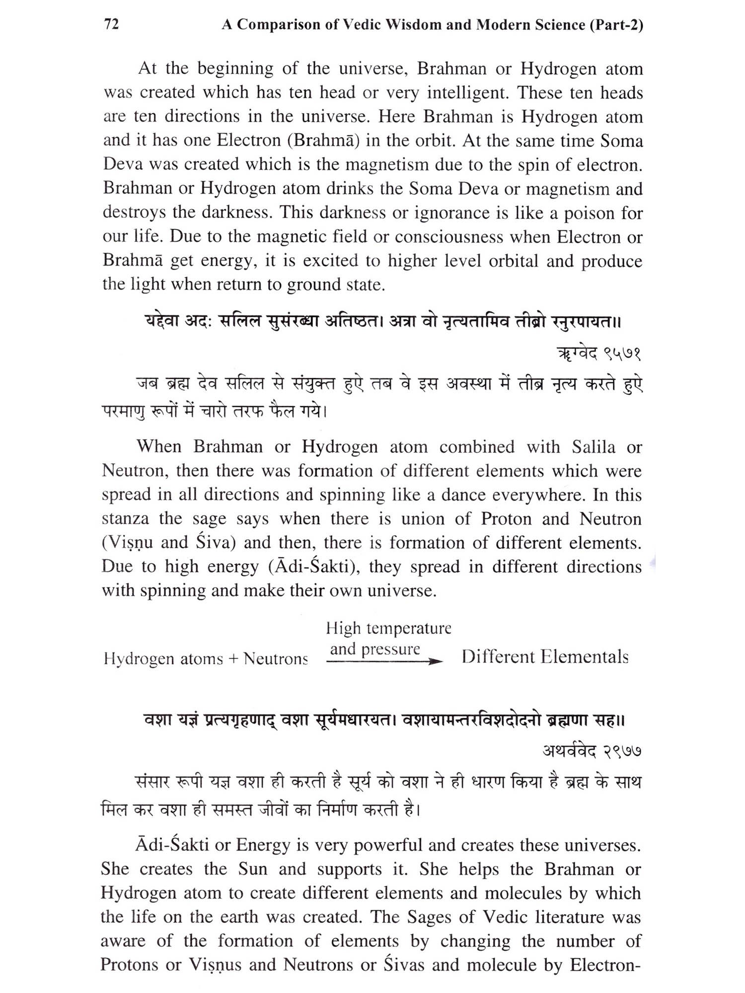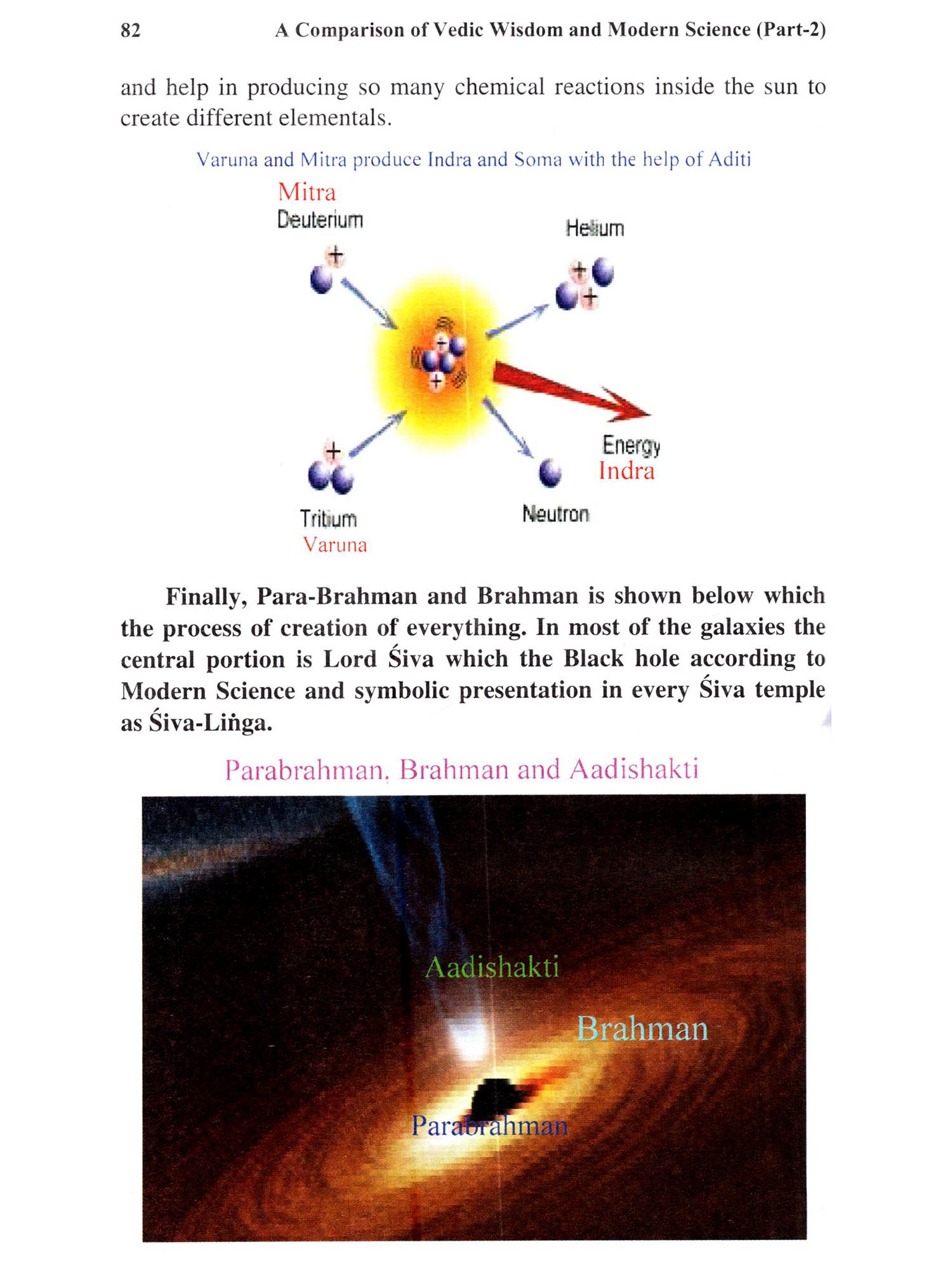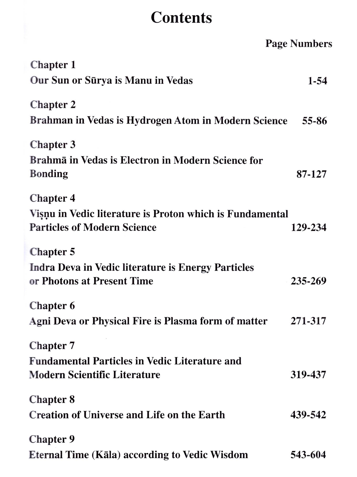 The author's aim to write this book is to of Onenessor single Supreme Entity. As a auman being we all contain in our body five components of nature, Sky or Aether. Air, Energy, Water and Solid material or Earth. If we consider at microlevel of fundamental particles, we ire the combination of Electron, Proton. Neutron and Energy. These four components of Supreme Lord are charge particles which are conserved in the universe. These particles cannot be created or destroy. In Vedic literature these fundamental particles are created from a single entity known as Salila or Quark-Gluon-Soup or Supreme Reality. As these Deities act independently under the guidance of Supreme Reality are known as Brahmä or Electron, Vişnu or proton, Siva or Neutron and Adi-Sakti or Energy Supreme Lord or Salila or Black Hole creates every entity of the universe by his own desire. When Lord Siva in Vedic literature and Neutron in Modern Science have the desire of creation, there is manifestation of Brahman and Adi-Sakti; Brahman is hydrogen atom and Adi-Śakti is Energy. Adi-Sakti has three forms; Käli or high energy particles. Lakşmi or Visible light and Sarasvati or Red shifted light or low energy radiations. Brahman or Hydrogen atom has five components system; Brahmā or Electron, Vişņu or Proton, Seşa-Naga or Serpent or gravitational force, Kşira Sägara or Sky or space and Lakşmi or nuclear binding energy. Śiva or Neutron is Supreme Reality and is present all the elemental except hydrogen atom. In combined form Śiva or Neutron, Vişņu or Proton, Brahmä or Electron and Adi-Sakti or Energy manifest all the entities of the universe. The message to write this book on Vedic Philosophy is that we all are the children of one Reality, but having different nature due to the presence of different amount of charge.