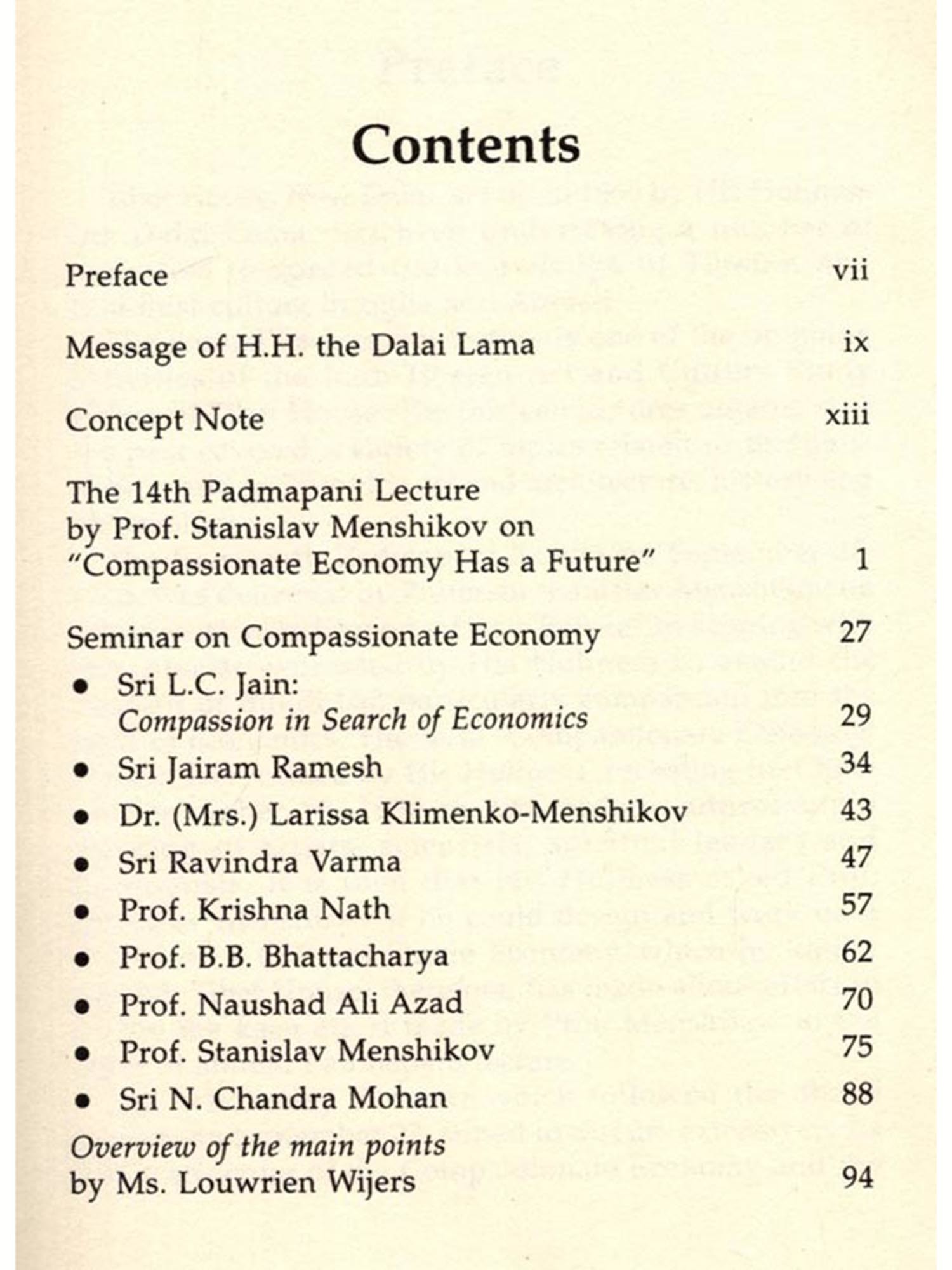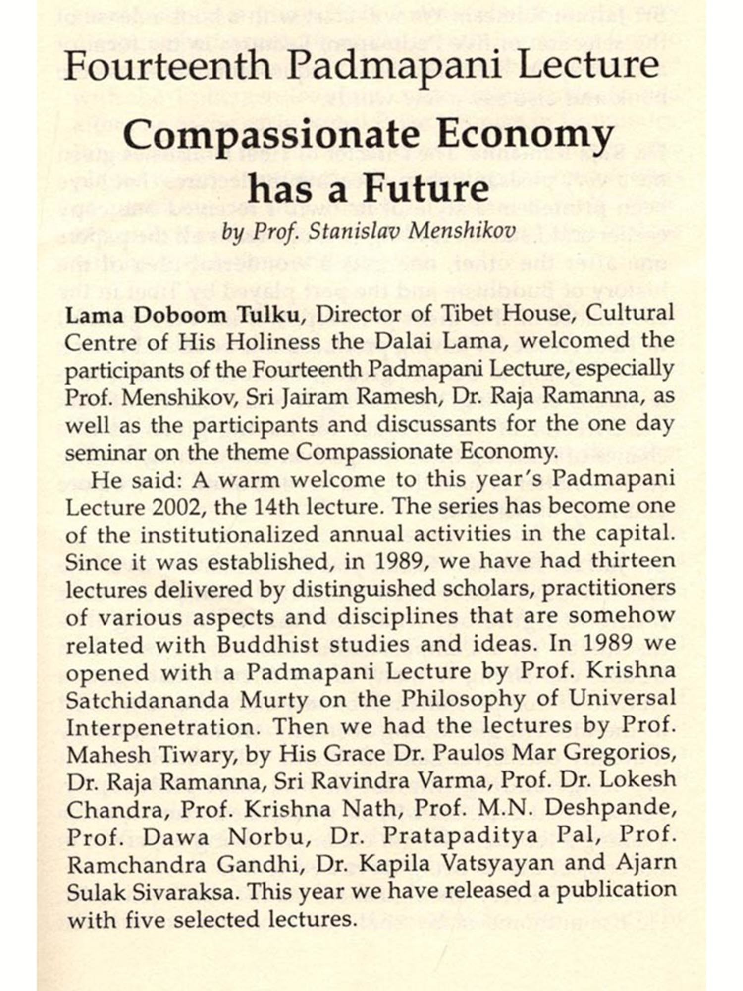 The fourteenth Padmapani lecture on September 26, 2002, was delivered by Professor Stanislav Menshikov on "Compassionate Economy Has a Future" in keeping with the interest expressed by His Holiness to extend the concept of Buddhism particularly compassion into the field of economics. The term 'Compassionate Economy' was, in fact, coined by His Holiness, revealing first time on September 10, 1990 in Amsterdam, addressing a meeting of artists, scientists, spiritual leaders and economists. It is then that His Holiness asked Prof. Stanislav Menshikov if he could design and work on a model on a Compassionate Economy, which he kindly agreed. Tibet House, therefore, has made allout effort to utilise the keen effort made by Prof. Menshikov in the form of annual Padmapani lecture.