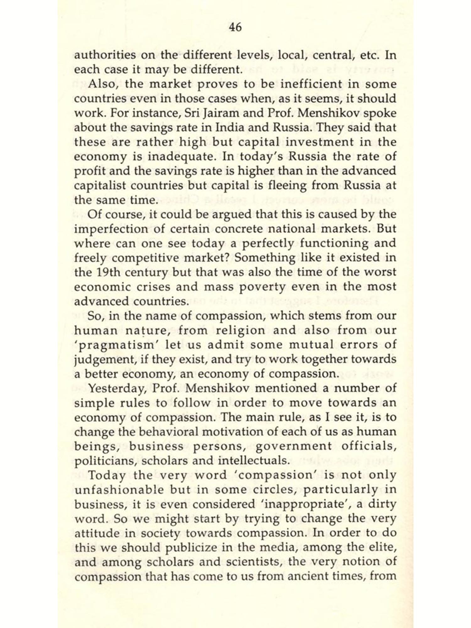 It is hoped that the monograph would help in enhancing awareness and the role of human values notably compassion in economics. It goes without saying that such discussions need to take often, as suggested by His Holiness the Dalai Lama, in order to help reach certain practical steps in this direction.