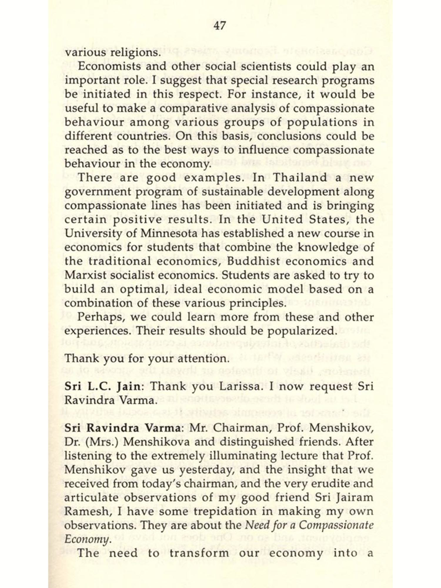 The whole day Seminar which followed the above lecture, on September 27, aimed to discuss extensively its likely structure of the Compassionate Economy and the issues arising in this age of globalisation, making some people happy which many others unhappy. The participants in the Seminar included renowned economic and social thinkers and were moderated by Sri L.C. Jain, former Member, Planning Commission. Dr. (Mrs.) Larissa Klimneko Menshikova, Sri Jairam Ramesh, Sri Ravindra Varma, Prof. Krishna Nath, Prof. B.B. Bhattacharya, Prof. Naushad Ali Azad, and Sri N. Chandra Mohan, besides Prof. Menshikov, gave their frank views on the concept and structure.