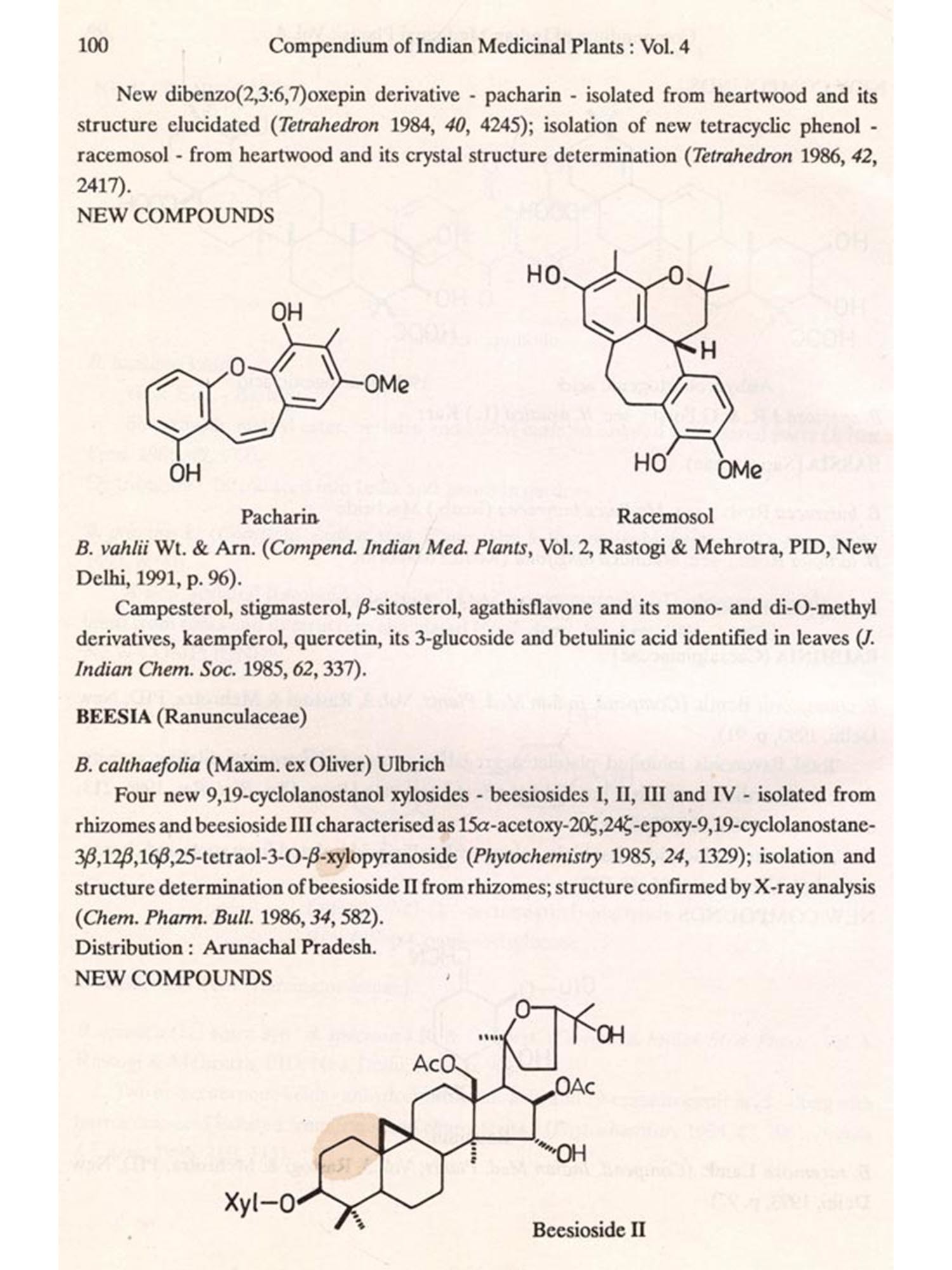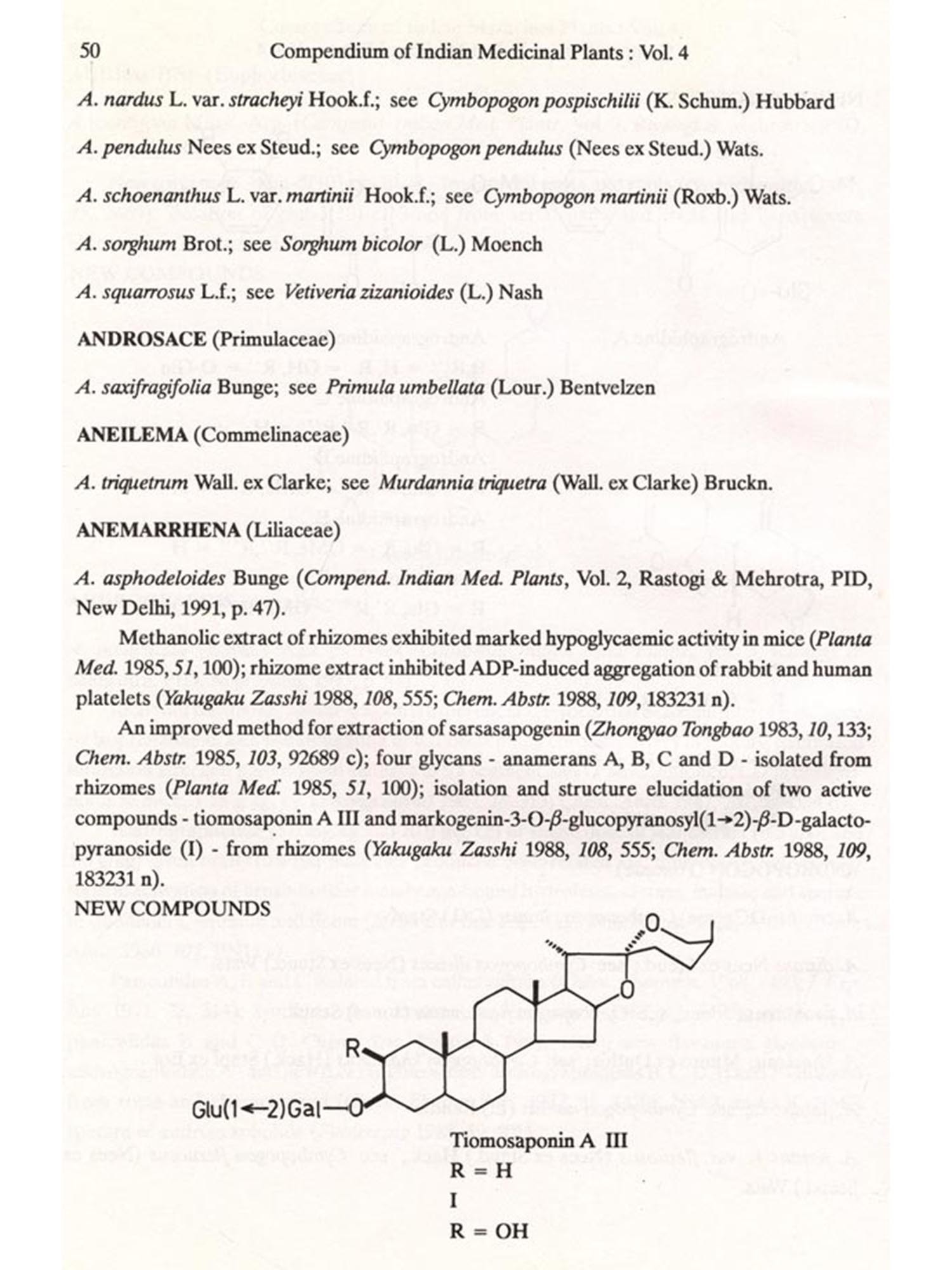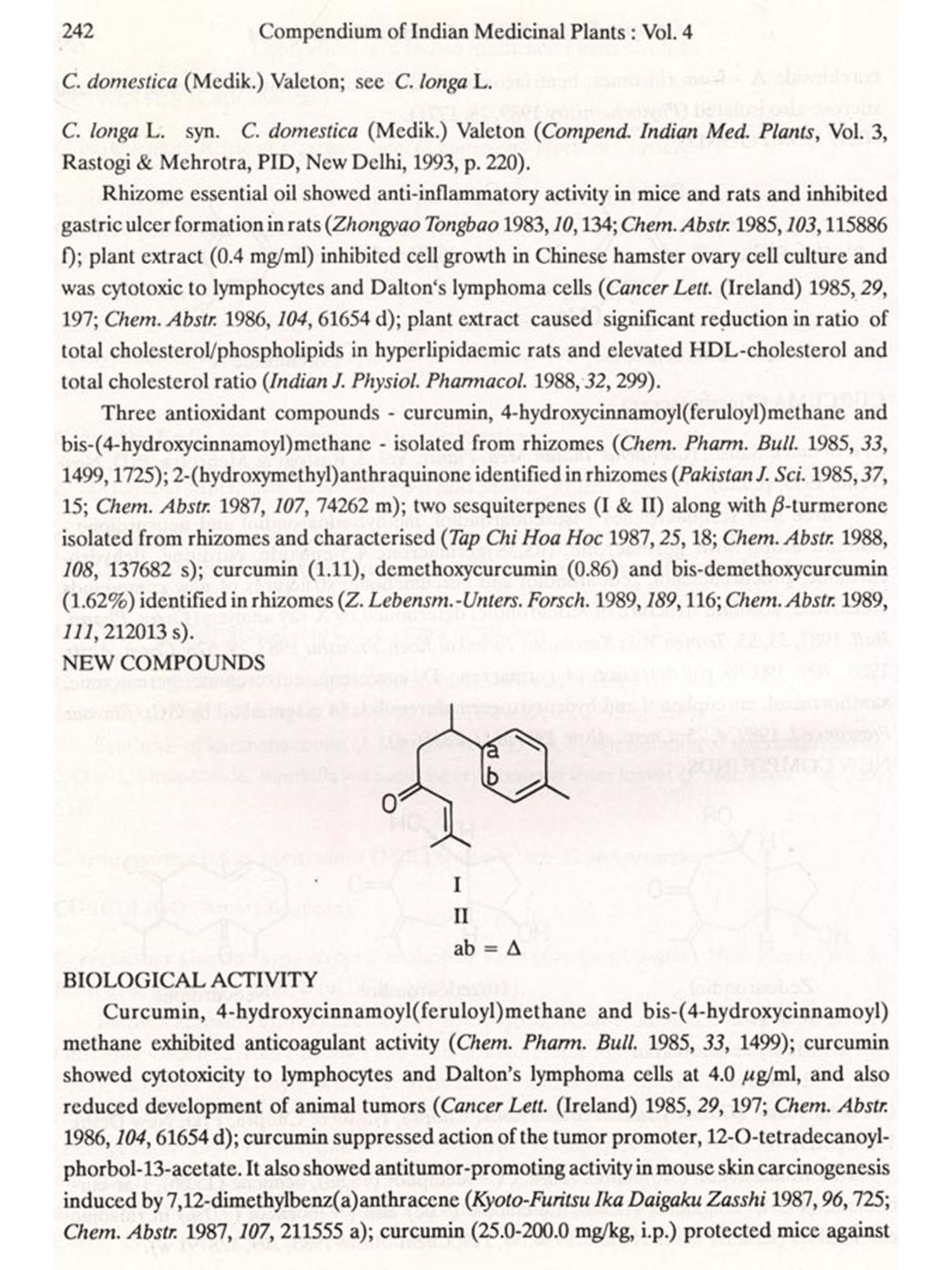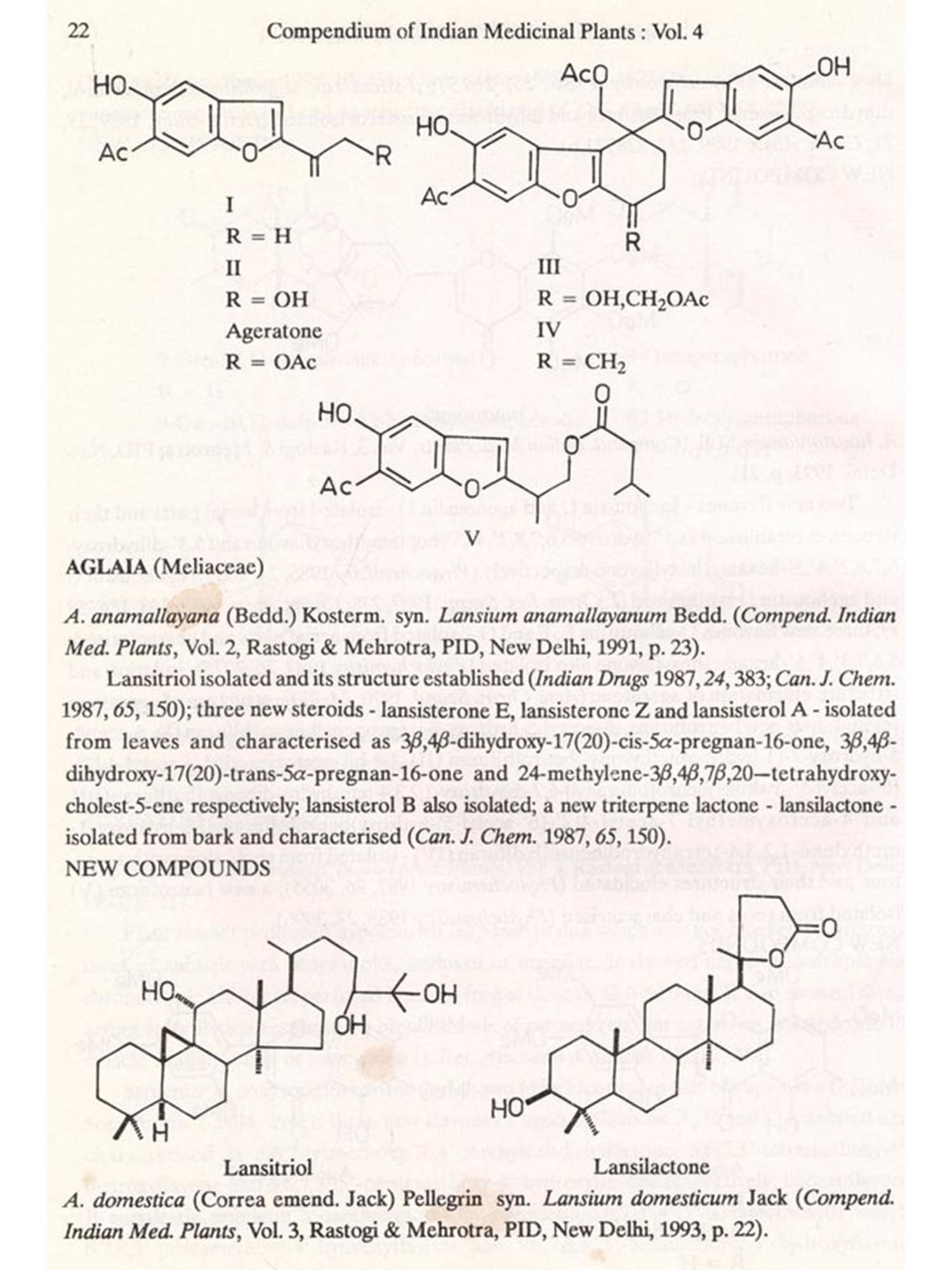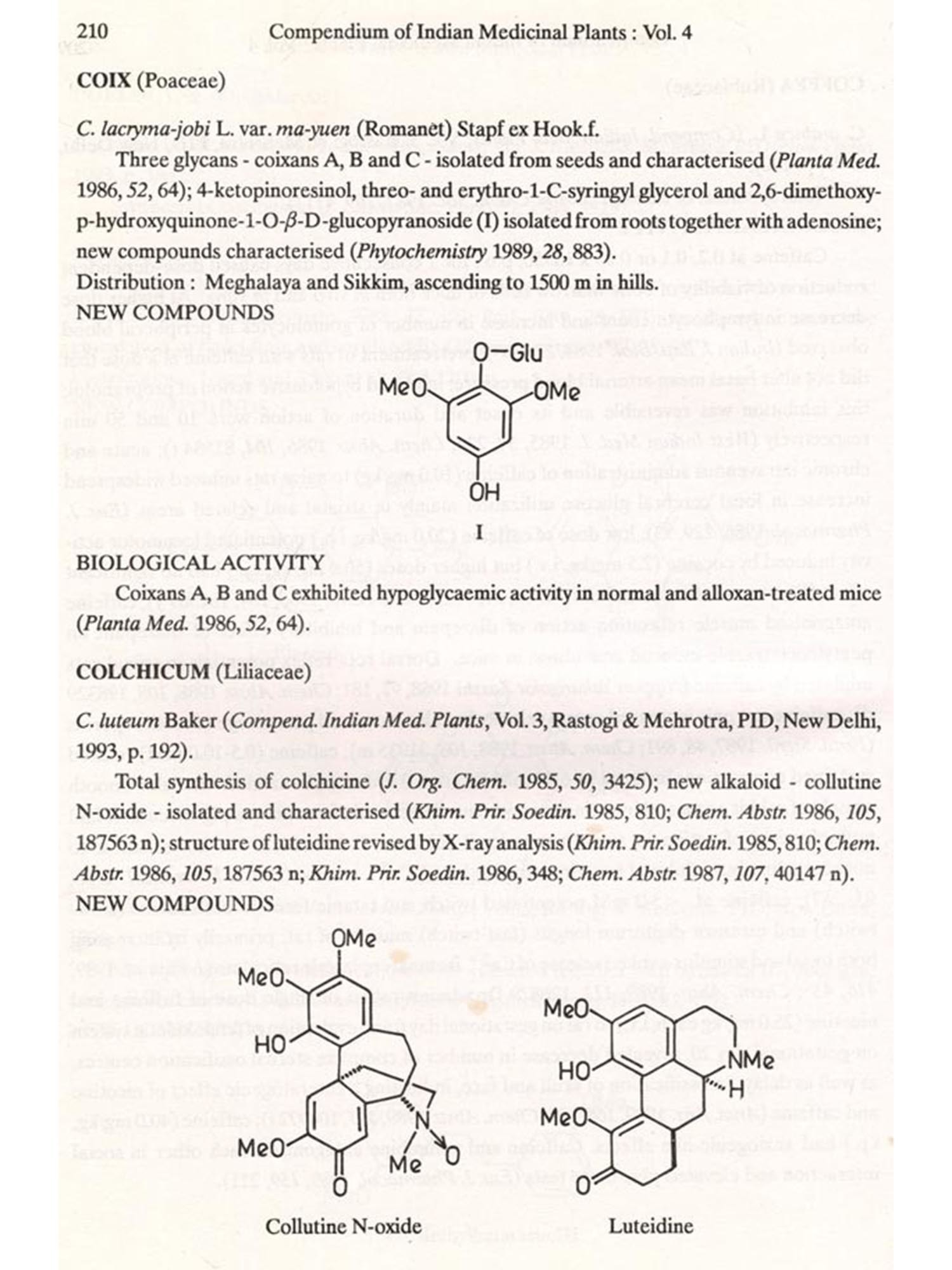 The format followed for Vol.4 is similar to that of Vols 1, 2 and 3, i.e. the write-up on each plant also includes new type of data/information, viz. chemical structures of new compounds isolated and the biological work on pure constituents isolated from a plant.