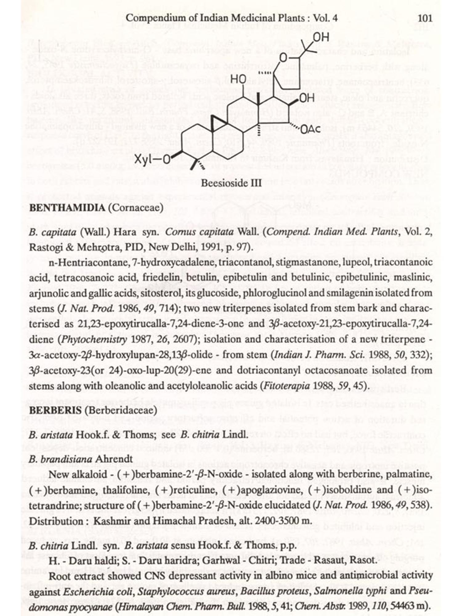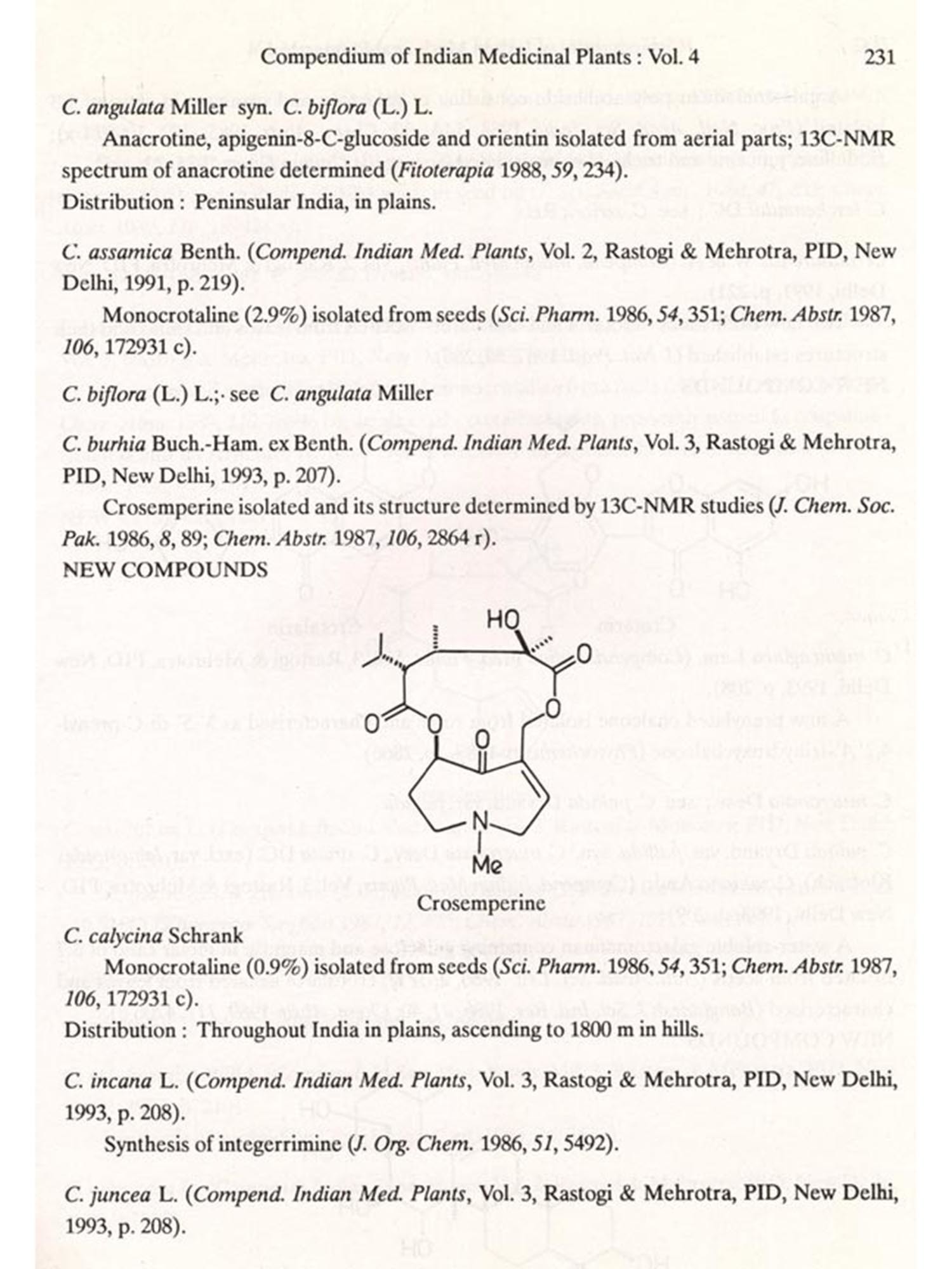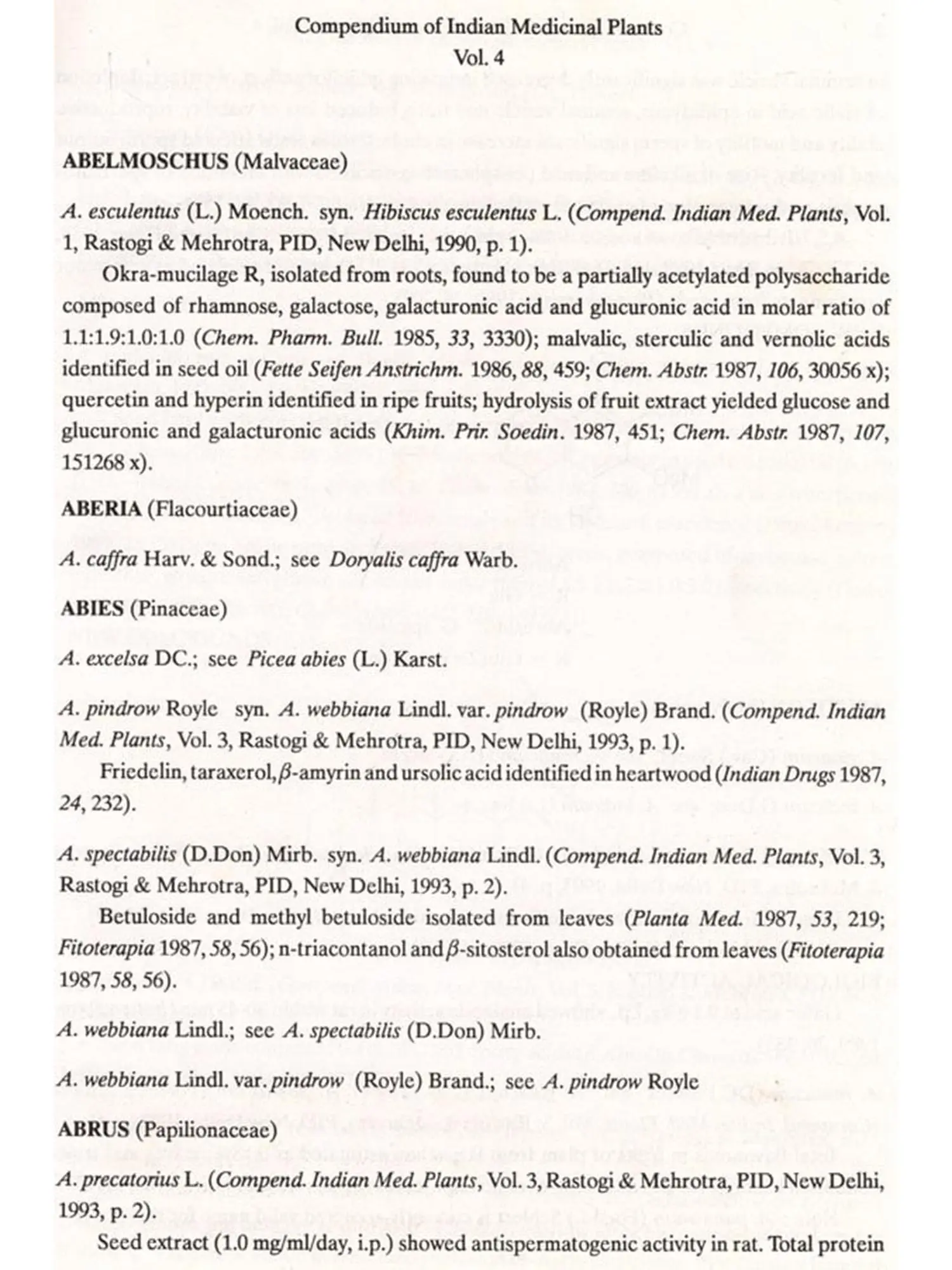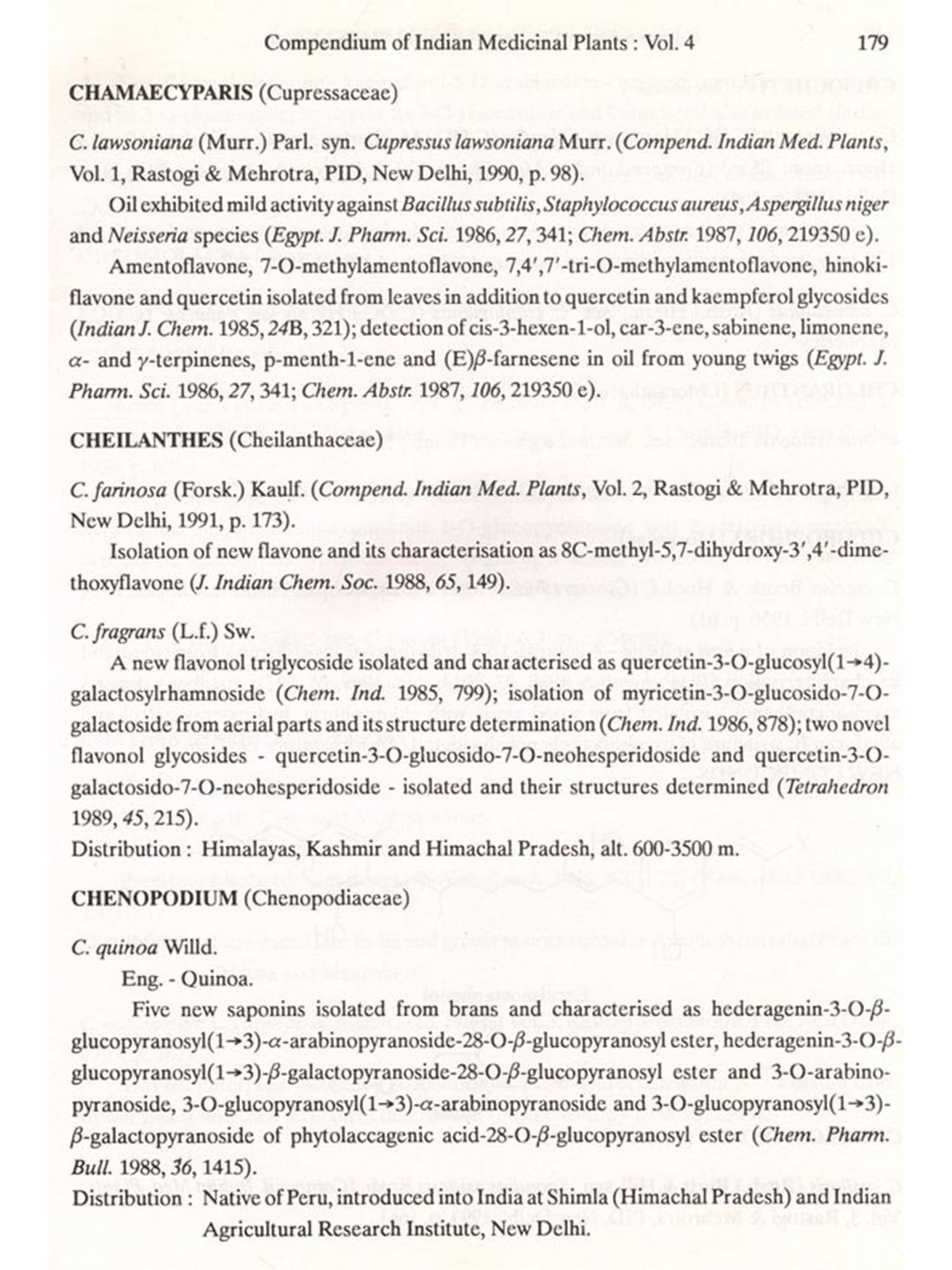 The format followed for Vol.4 is similar to that of Vols 1, 2 and 3, i.e. the write-up on each plant also includes new type of data/information, viz. chemical structures of new compounds isolated and the biological work on pure constituents isolated from a plant.