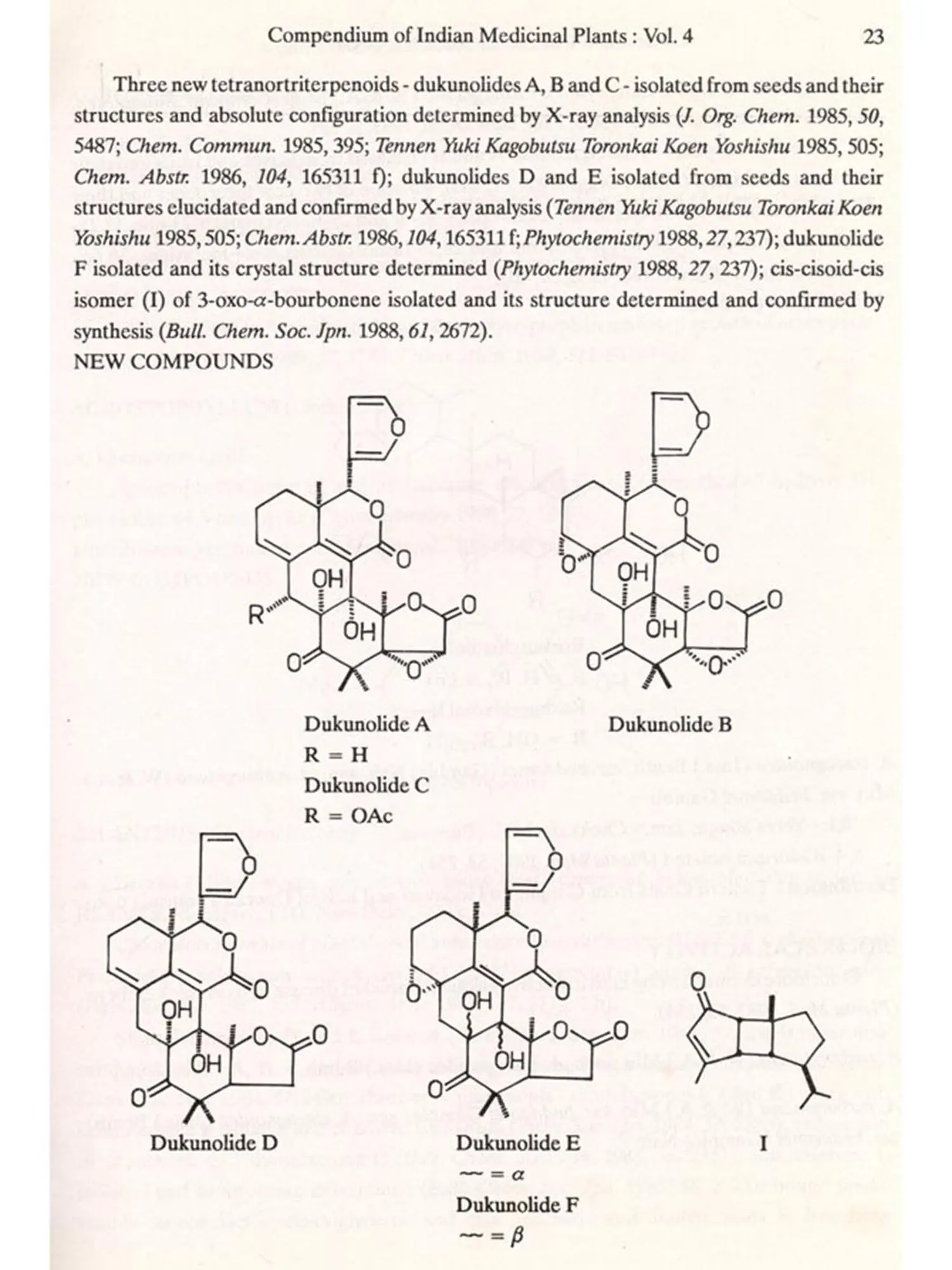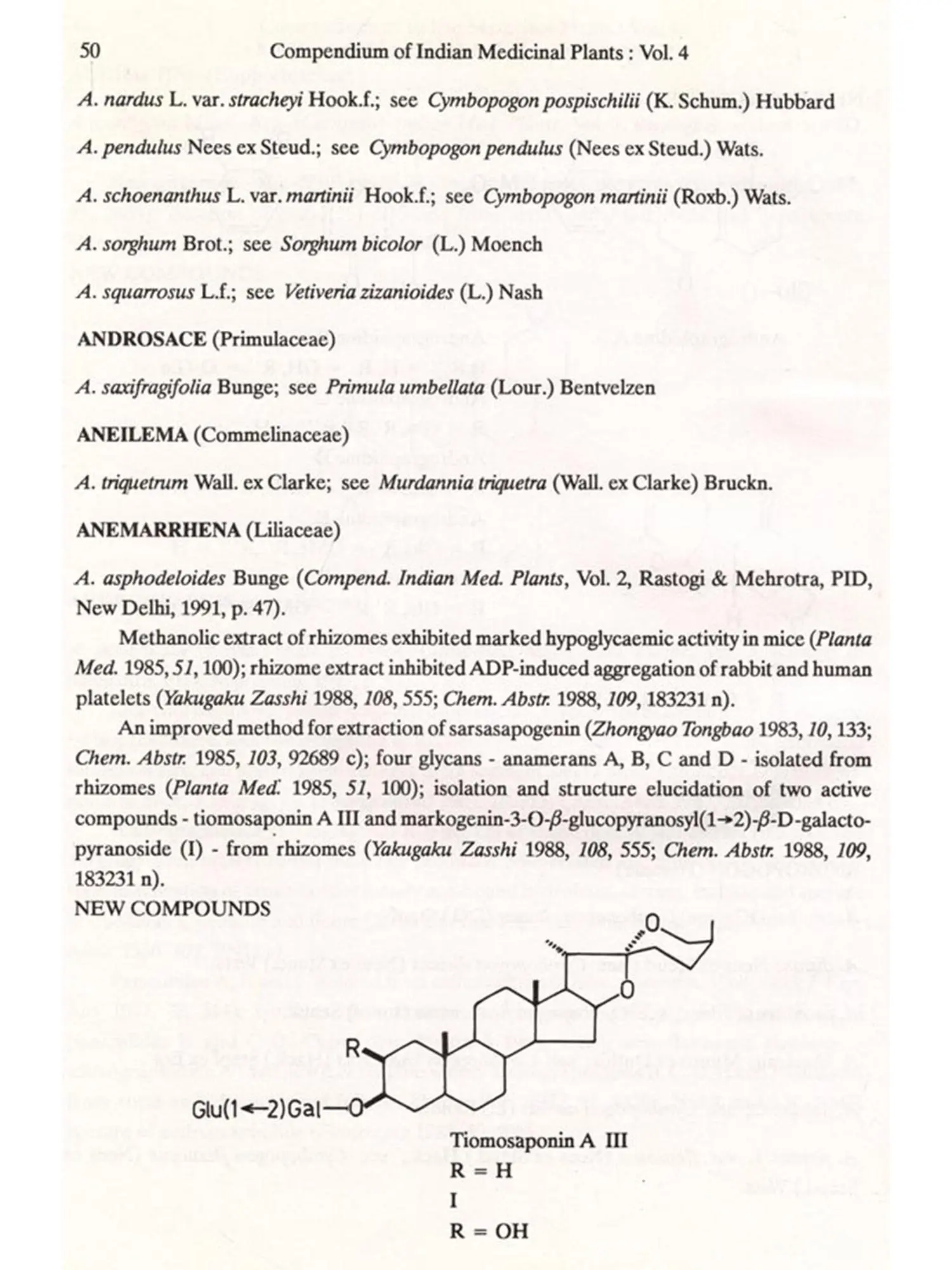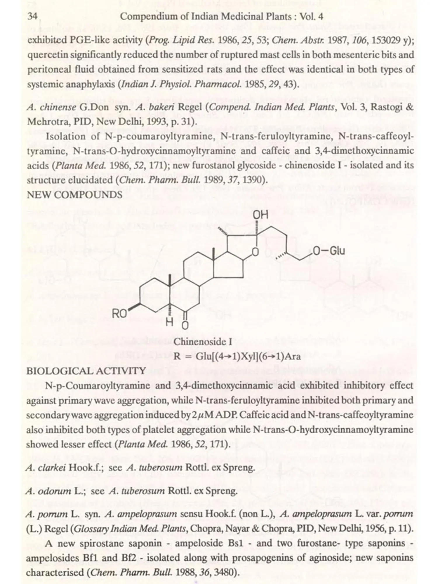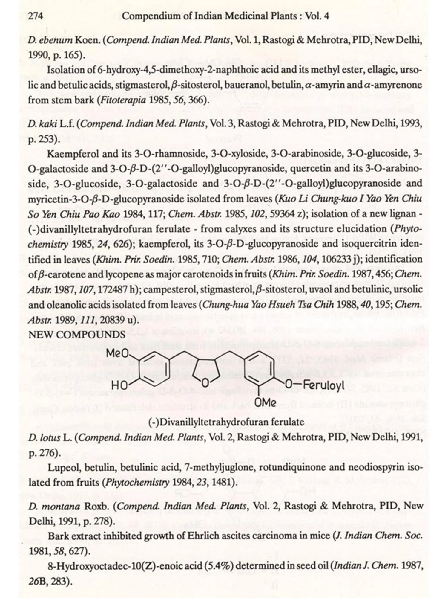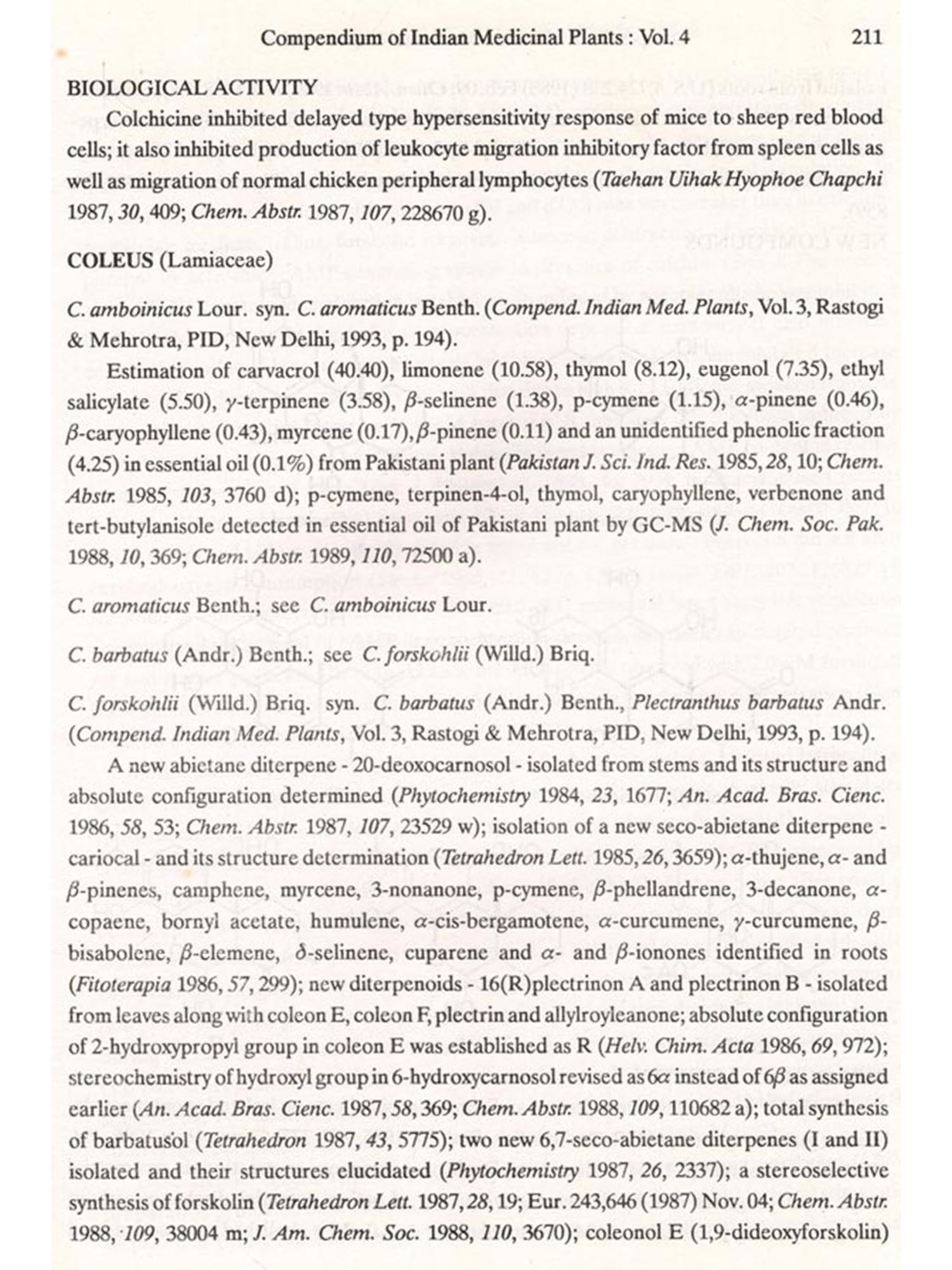 The format followed for Vol.4 is similar to that of Vols 1, 2 and 3, i.e. the write-up on each plant also includes new type of data/information, viz. chemical structures of new compounds isolated and the biological work on pure constituents isolated from a plant.