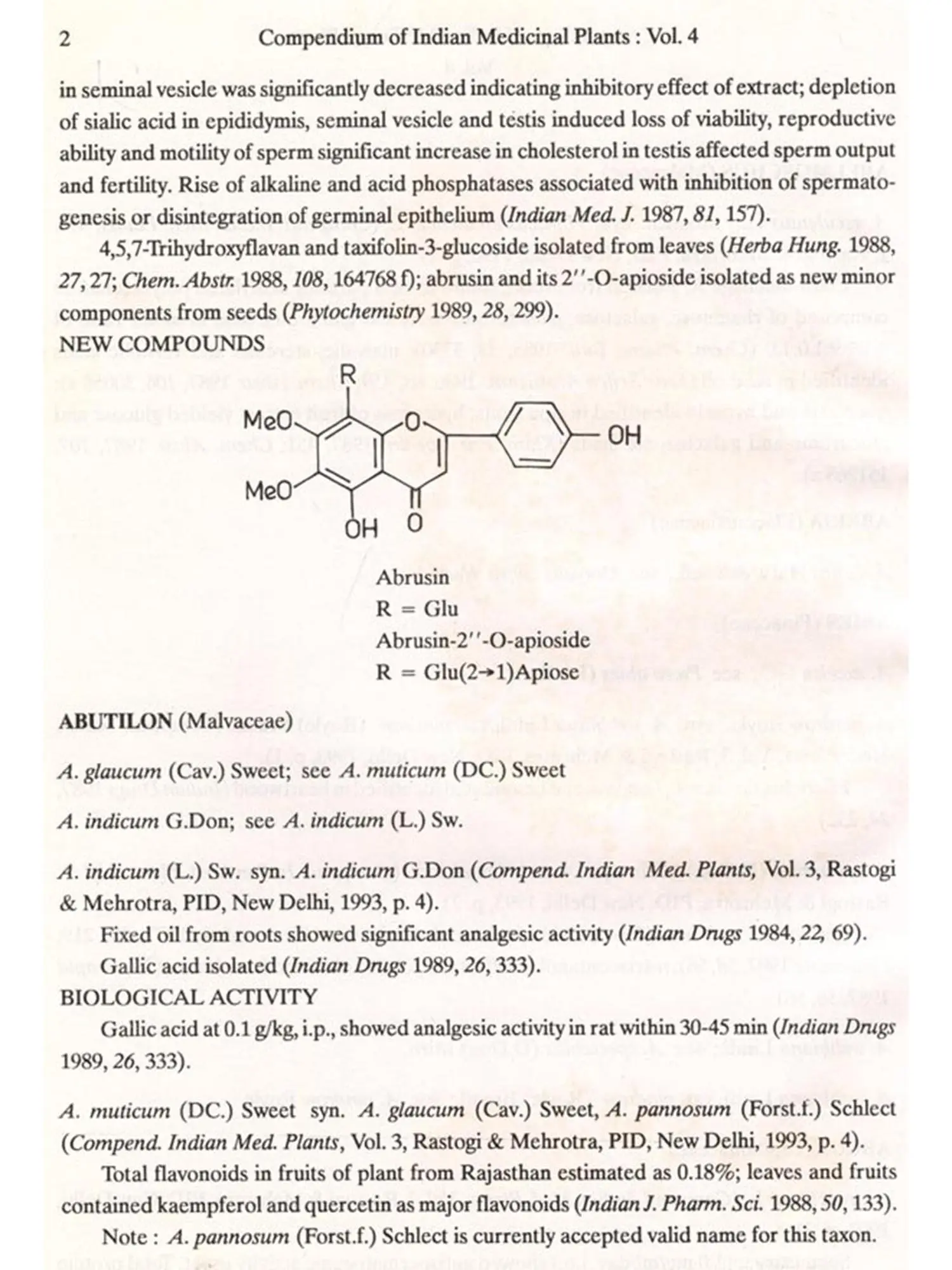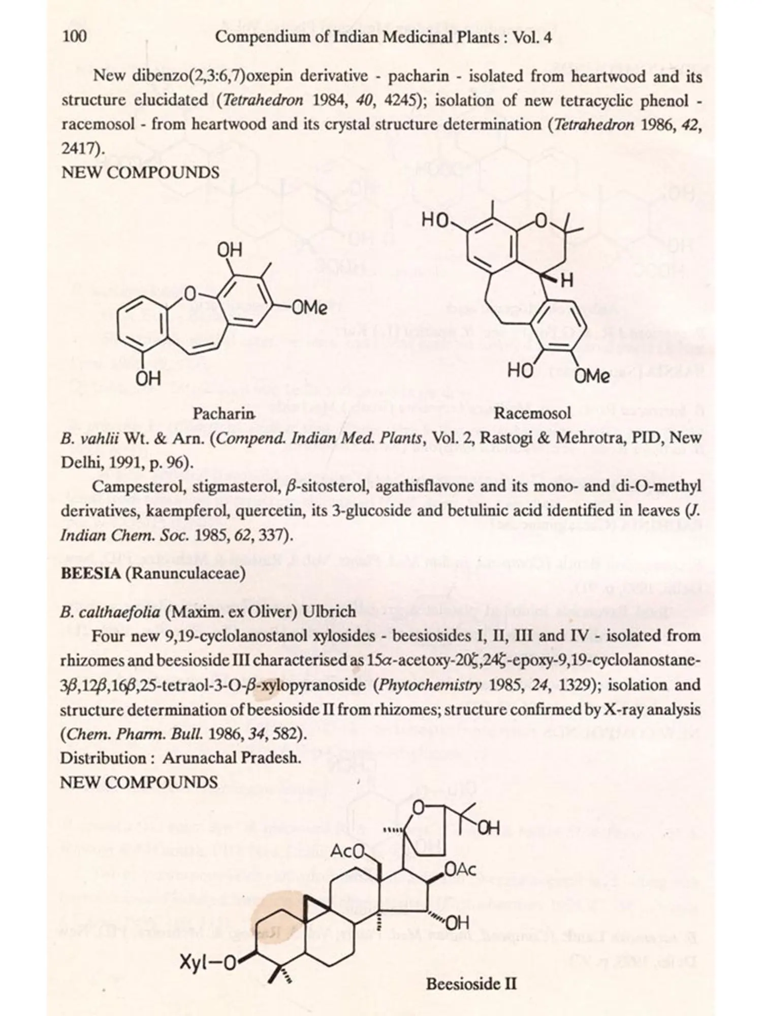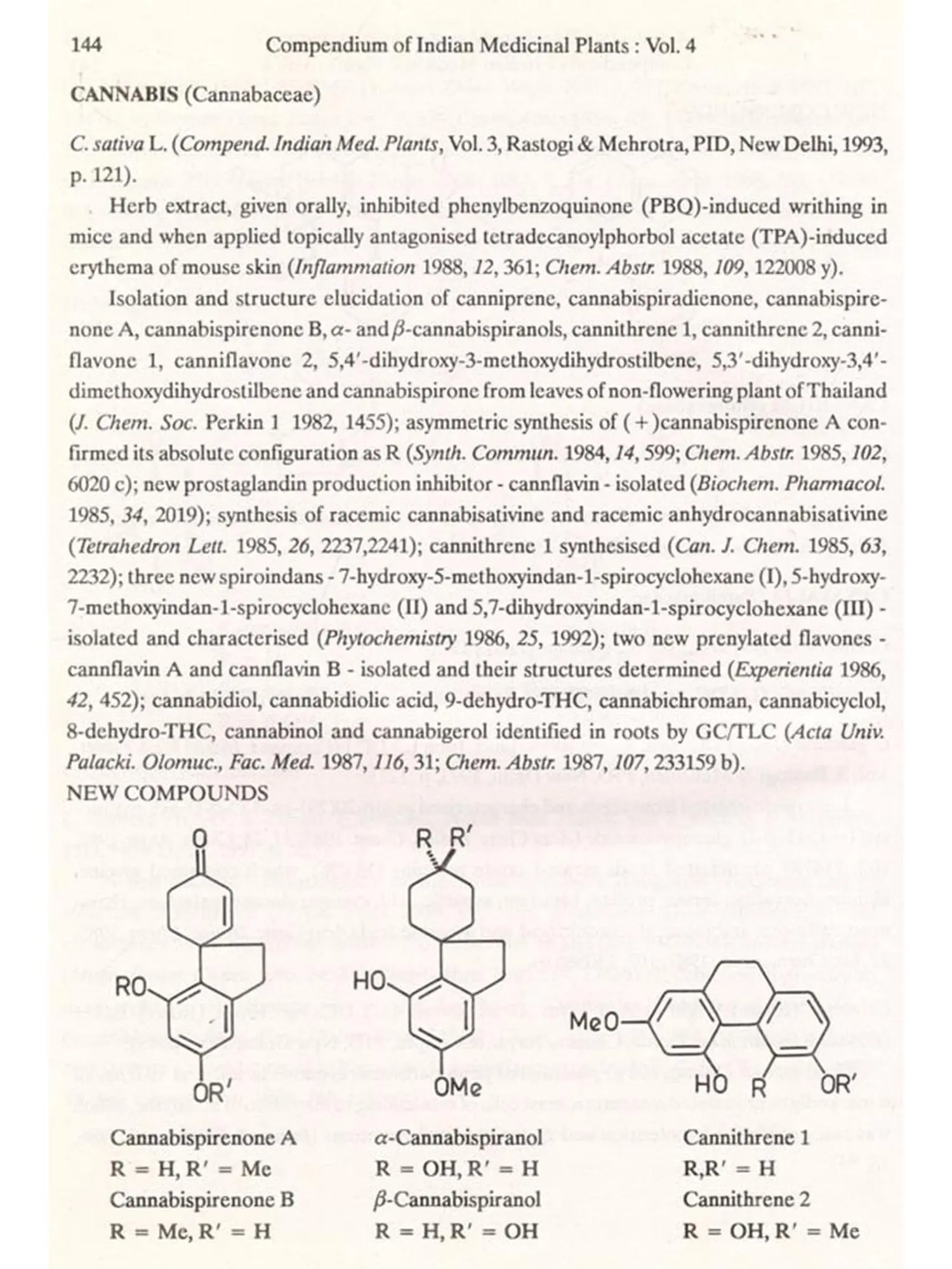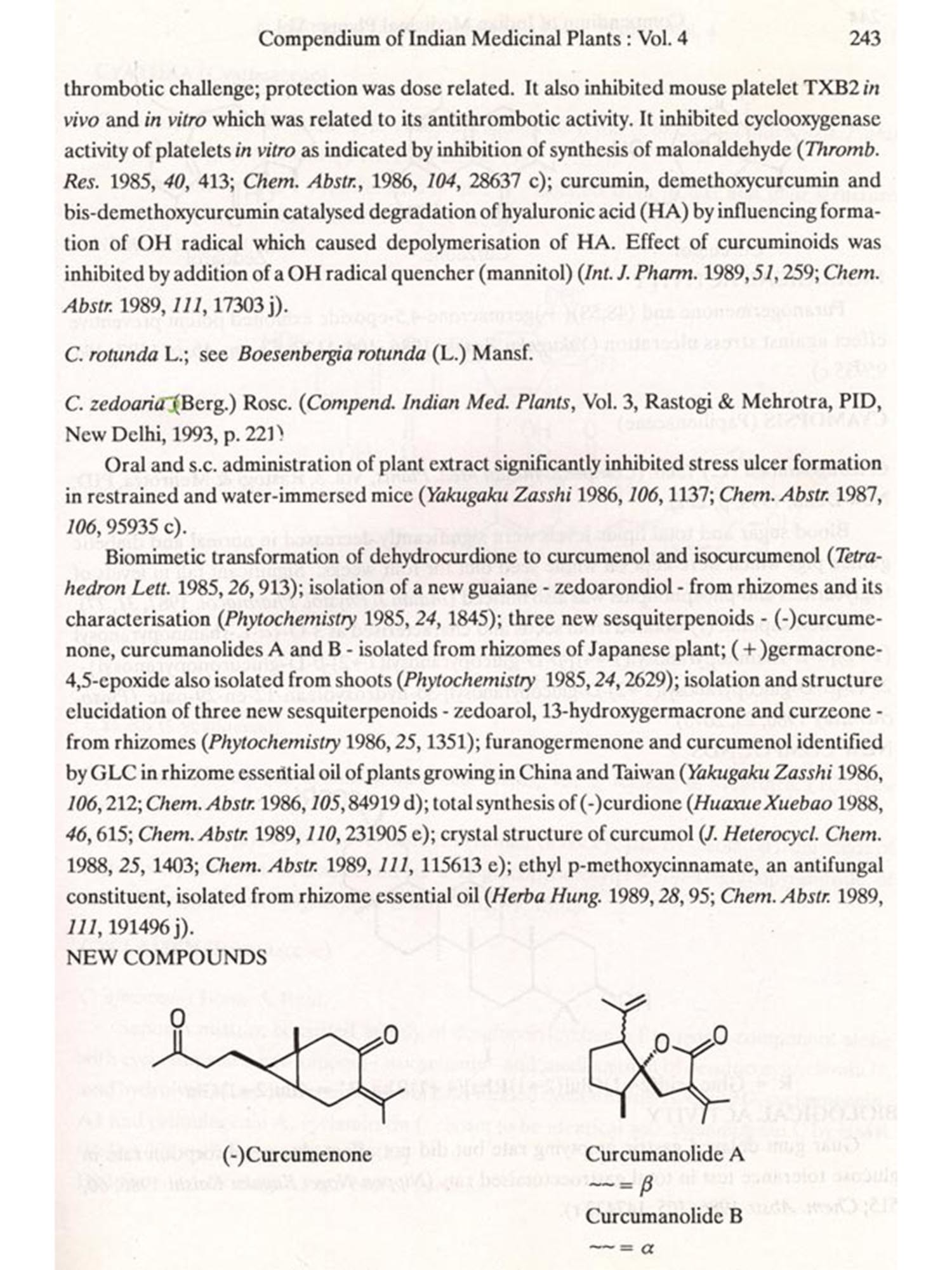 The format followed for Vol.4 is similar to that of Vols 1, 2 and 3, i.e. the write-up on each plant also includes new type of data/information, viz. chemical structures of new compounds isolated and the biological work on pure constituents isolated from a plant.