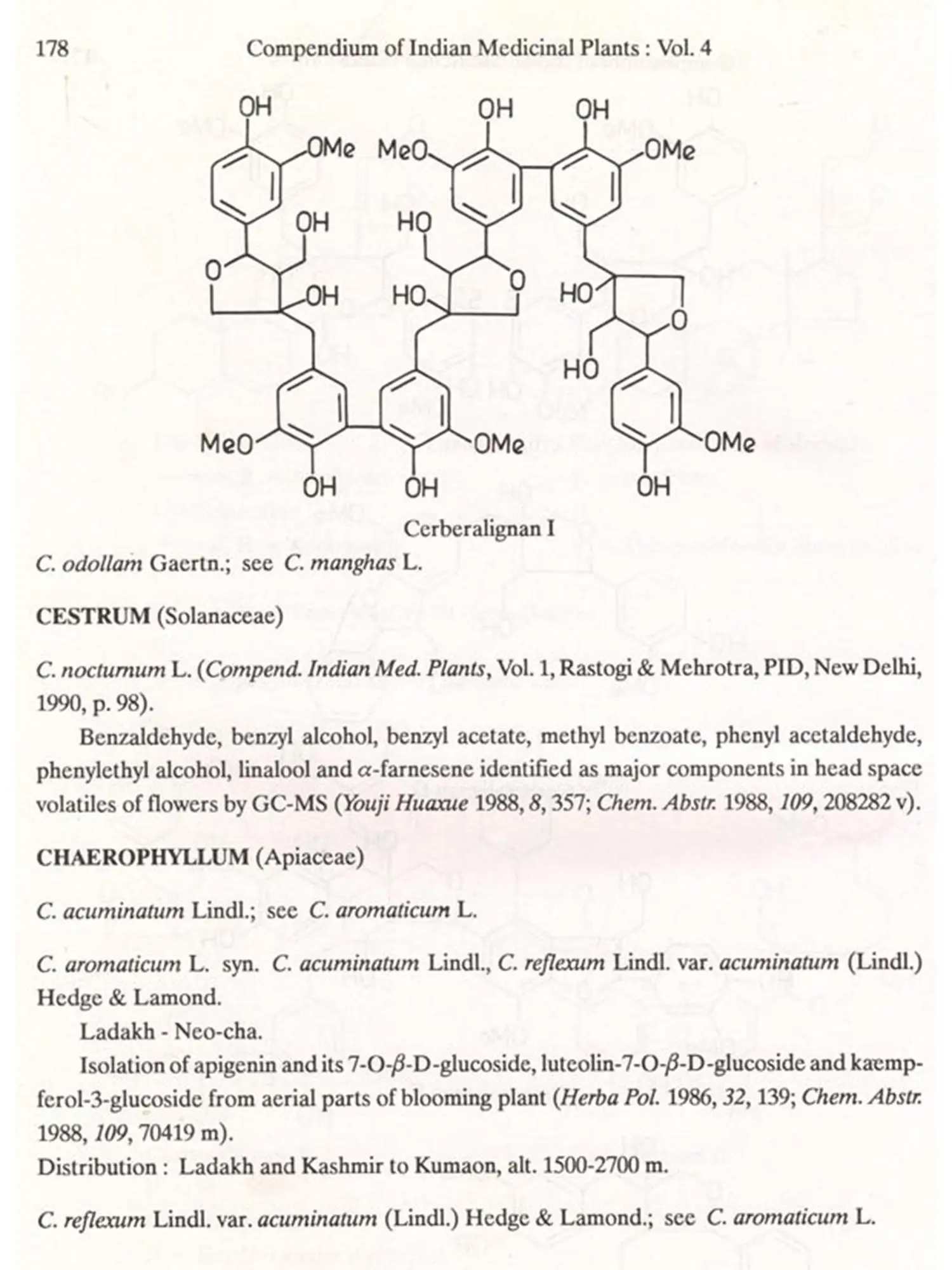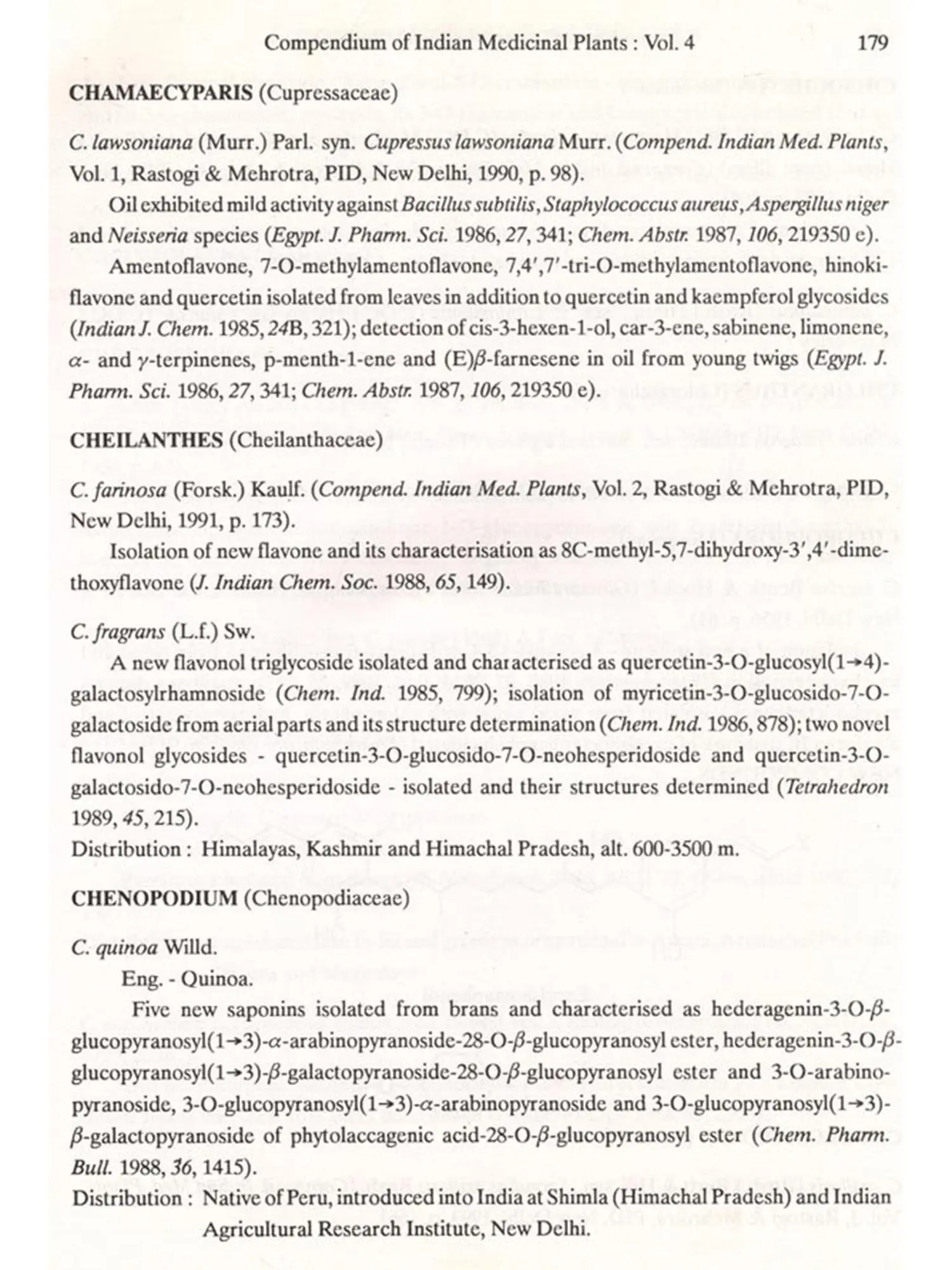 The first part of Vol.4, like preceding volumes, presents the logistics of the write-up in an 'Explanatory Introduction', which is followed by the description of 1650 plants in 780 pages. Finally, four indexes (150 pages) comprising local names, chemical constituents, biological activities and chemical structures have been provided.