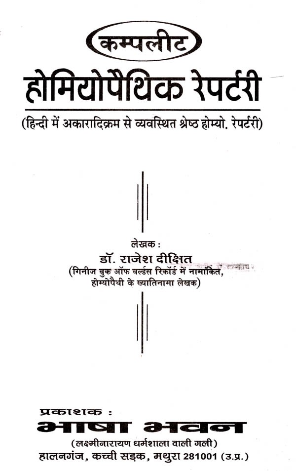 कम्पलीट होमियोपैथिक रेपर्टरी (हिन्दी में अकारादिक्रम से व्यवस्थित श्रेष्ठ होम्यो. रेपर्टरी): Complete Homeopathic Repertory (Hindi Mein Akaaradikram Se Vyavasthit Shreshth Homyo. Repertory)