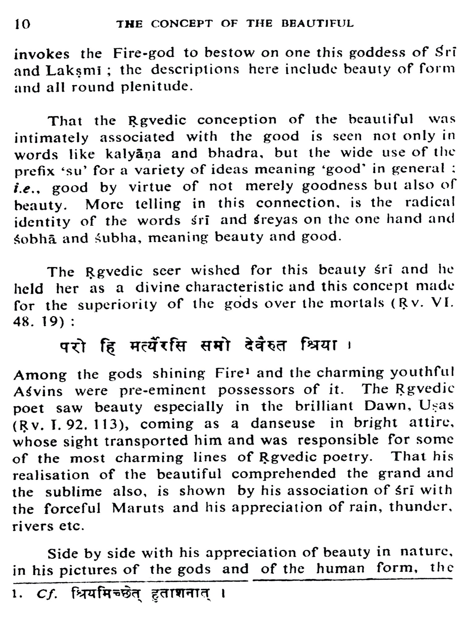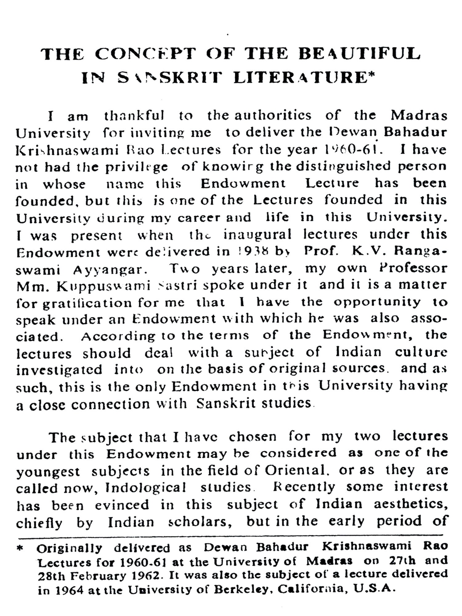 It is a pleasure to accede to Dr. S.S. Janaki's request that I should write a Foreword to the late Prof. V. Raghavan's lectures on The Concept of the Beautiful in Sanskrit Literature, originally delivered under the Dewan Bahadur Krishnaswami Rao Foundation at the Madras University on 27 and 28 February 1962. While I do not claim any deep knowledge of Sanskrit or of aesthetics, I too have been intrigued and held in fascination by the phenomenon of Beauty (in fact, my booklet On Beauty was published as early as 1945, three years after Prof. P. Ν. Srinivasachari's The Philosophy of the Beautiful); and, besides, being exact contemporaries, I was privileged to know and enjoy the friendship of Prof. Raghavan from the carly thirties to the time of his sudden passing in 1979. These were inducements enough to make me overcome my initial reluctance and agree to contribute this Foreword.