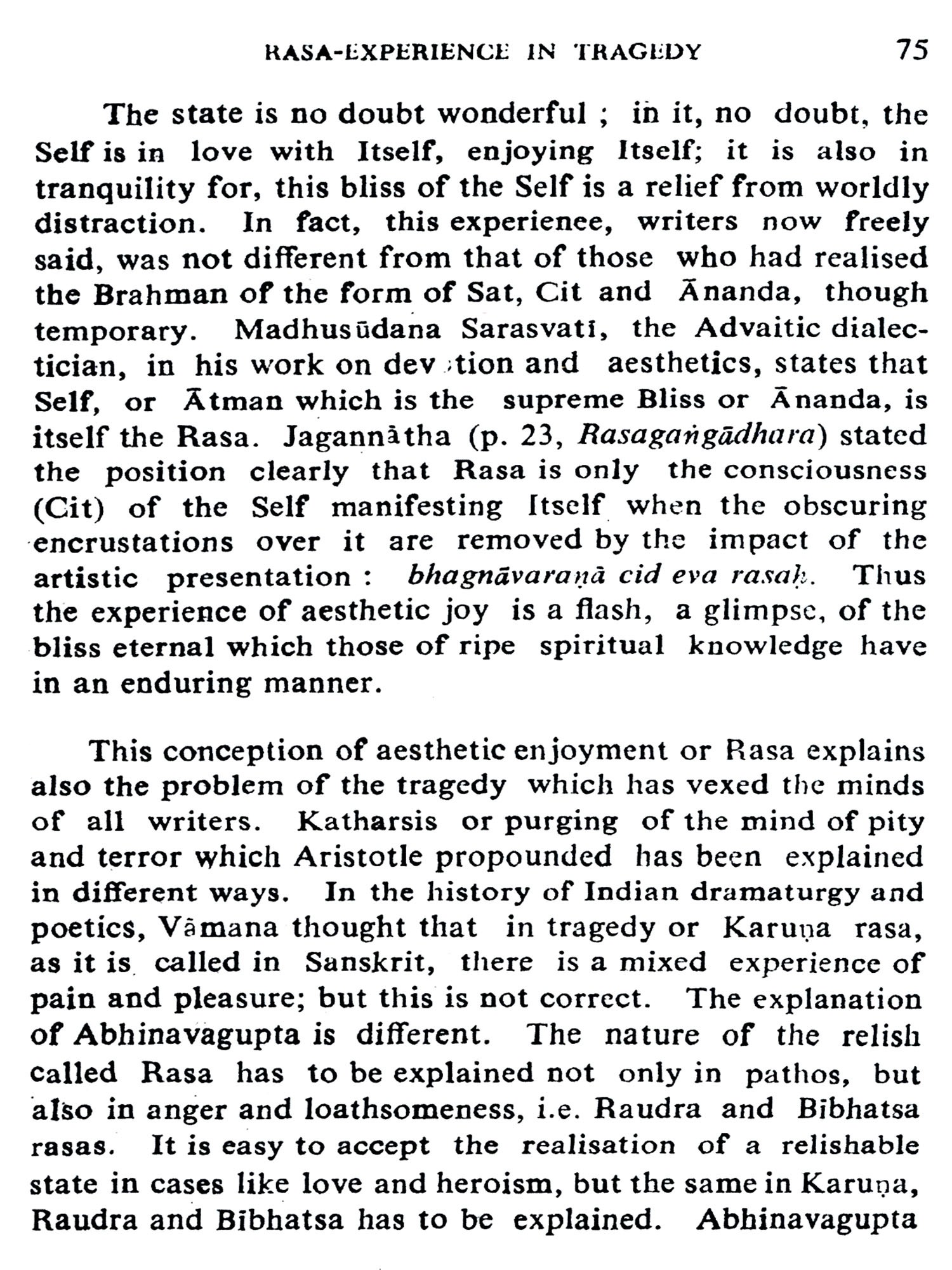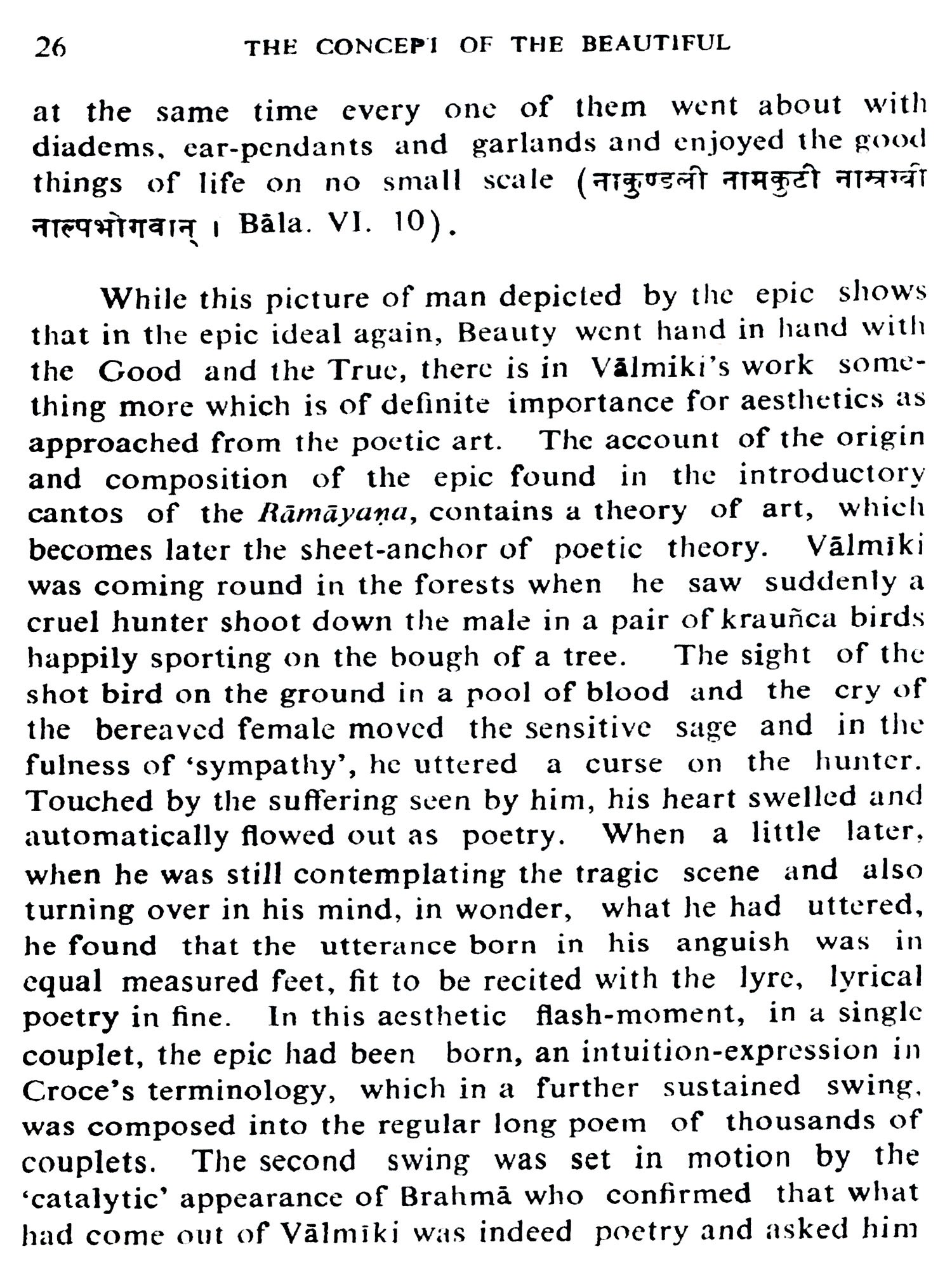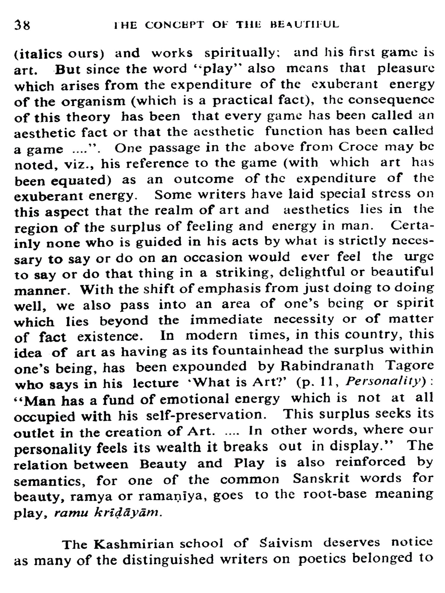 It is likely Prof. Raghavan left these lectures unpubli-shed because he had hoped to revise, and perhaps enlarge them. His Concepts of Alankara Sastra appeared in 1942, his study of Bhoja's Srngaraprakasa won the Sahitya Akademi award in 1966, and he presented a learned paper on Sri Aurobindo's Acsthetics at the Sri Aurobindo Birth Centenary National Seminar in 1972. Dr. Raghavan was always full of the subject, and his dual allegiance to Sanskrit literature and Karnatak music (notably as exemplified in Tyagaraja) constantly provoked lively speculation on the concept of Beauty and the impact of the Beautiful on seasoned human sensibility. Further, Raghavan was widely read in Western aesthetics from Plato, Aristotle, Plotinus and Longinus to modern thinkers and critics like Ruskin, Lascelles Abercrombie, Jaques Maritain and Benedetto Croce. Had Prof. Raghavan found the time to turn his two lectures into a structured monograph with all the weight of his learning and experiential knowledge, he would doubtless have given us almost a definitive mono-graph on the subject. But that was not to be. Even so, these two lectures constitute an excellent historical and critical overview of the tantalising subjects of his choice.