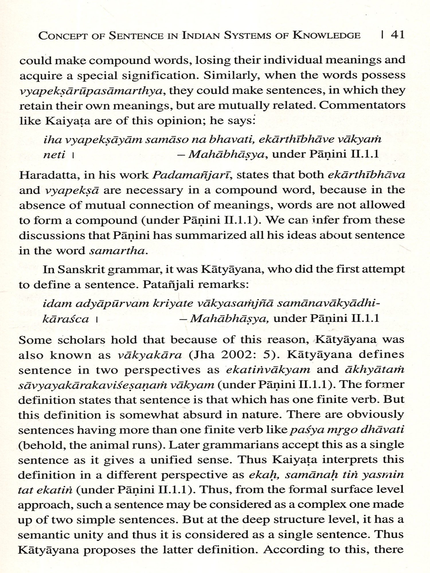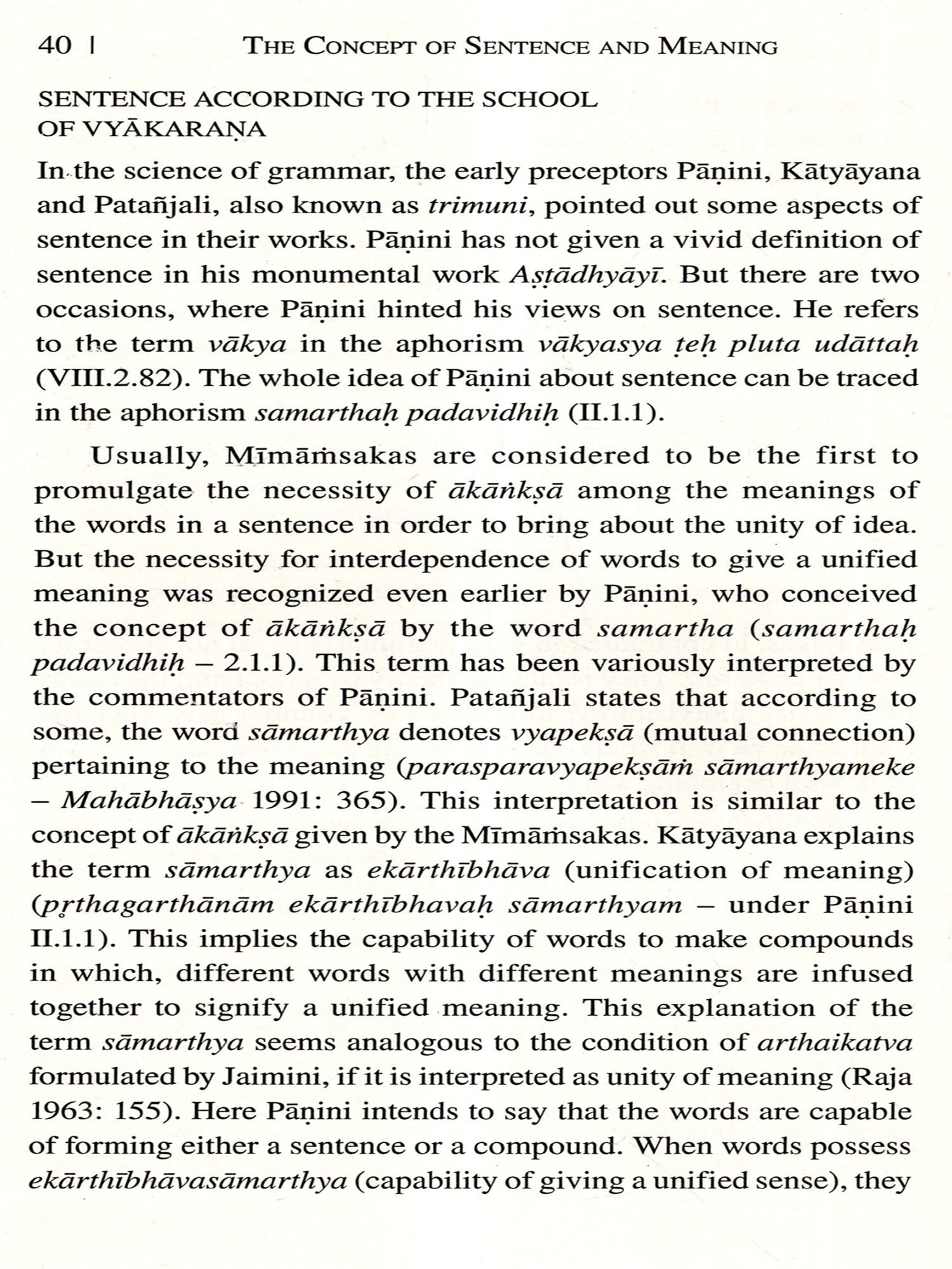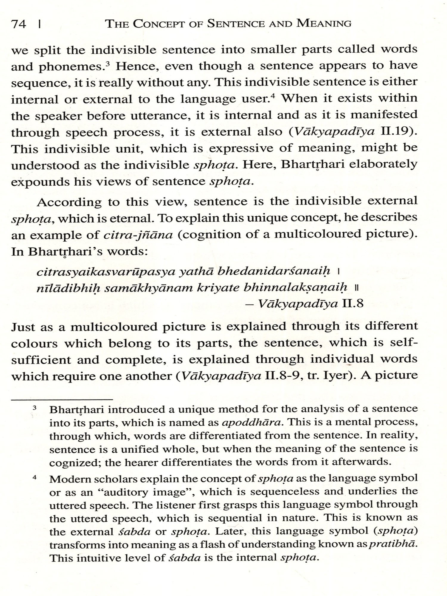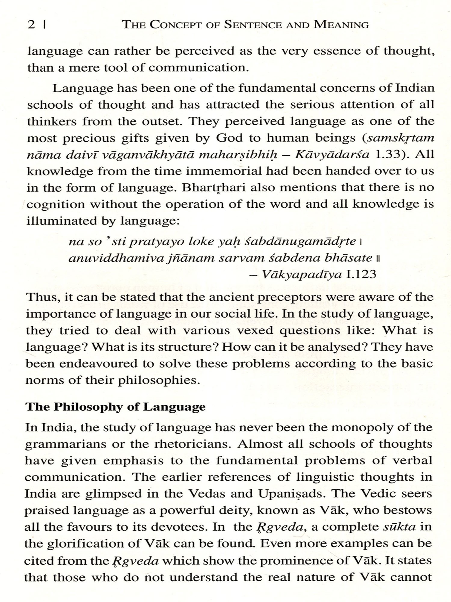 One of the fundamental problems in the philosophy of language, that has attracted the serious attention of all thinkers, is the relation between sabda (linguistic element) and its artha (meaning). The term sabda is normally used to refer to a linguistic element, which is the meaningful unit of speech. Indian thinkers uphold different views on the linguistic element that is referred to by the term śabda. According to various thinkers, it is the articulated phoneme (varna) or the word (pada) or the sentence (vākya). But all of them emphasize the role of sentence in communicating the ideas conceived by the speaker. Therefore the study of sentence and sentence-meaning became one of the major concerns of linguists, grammarians and philosophers.