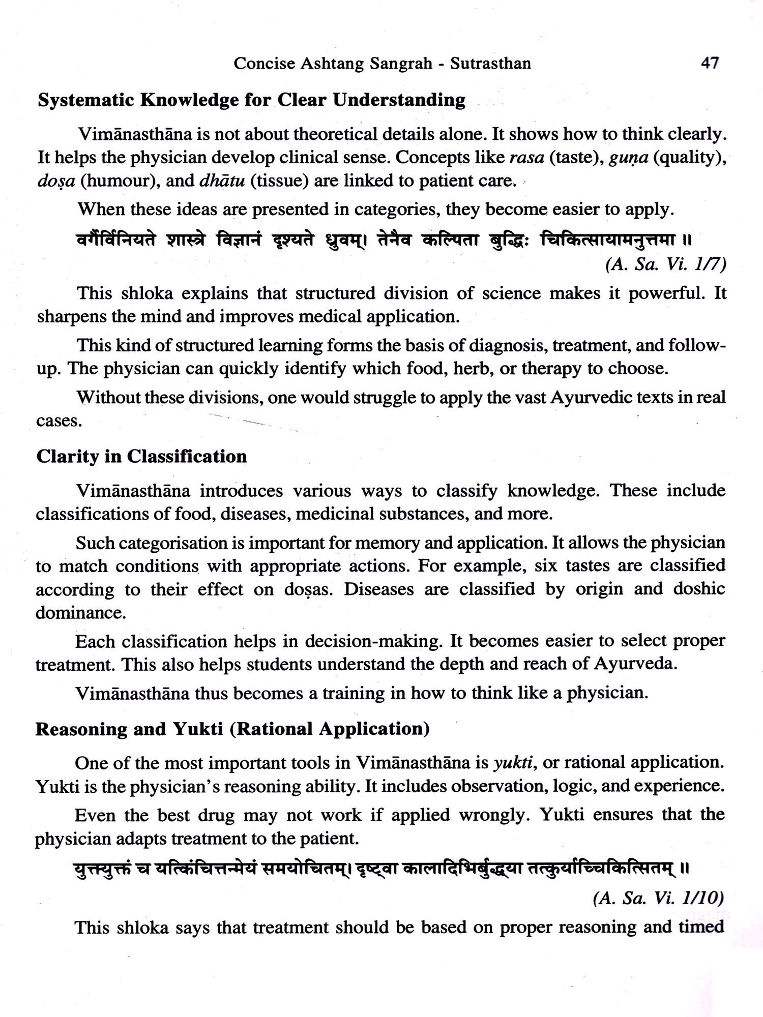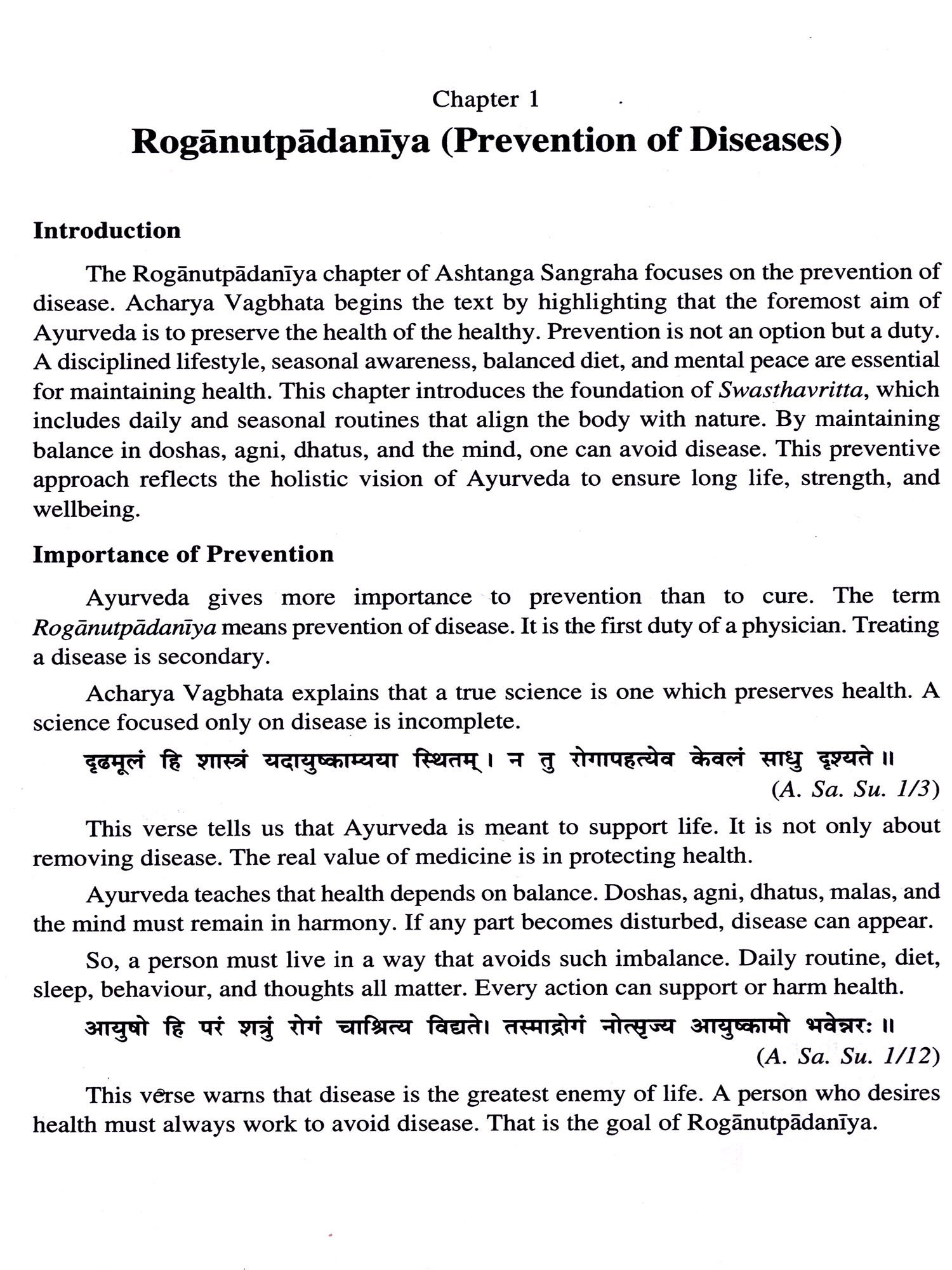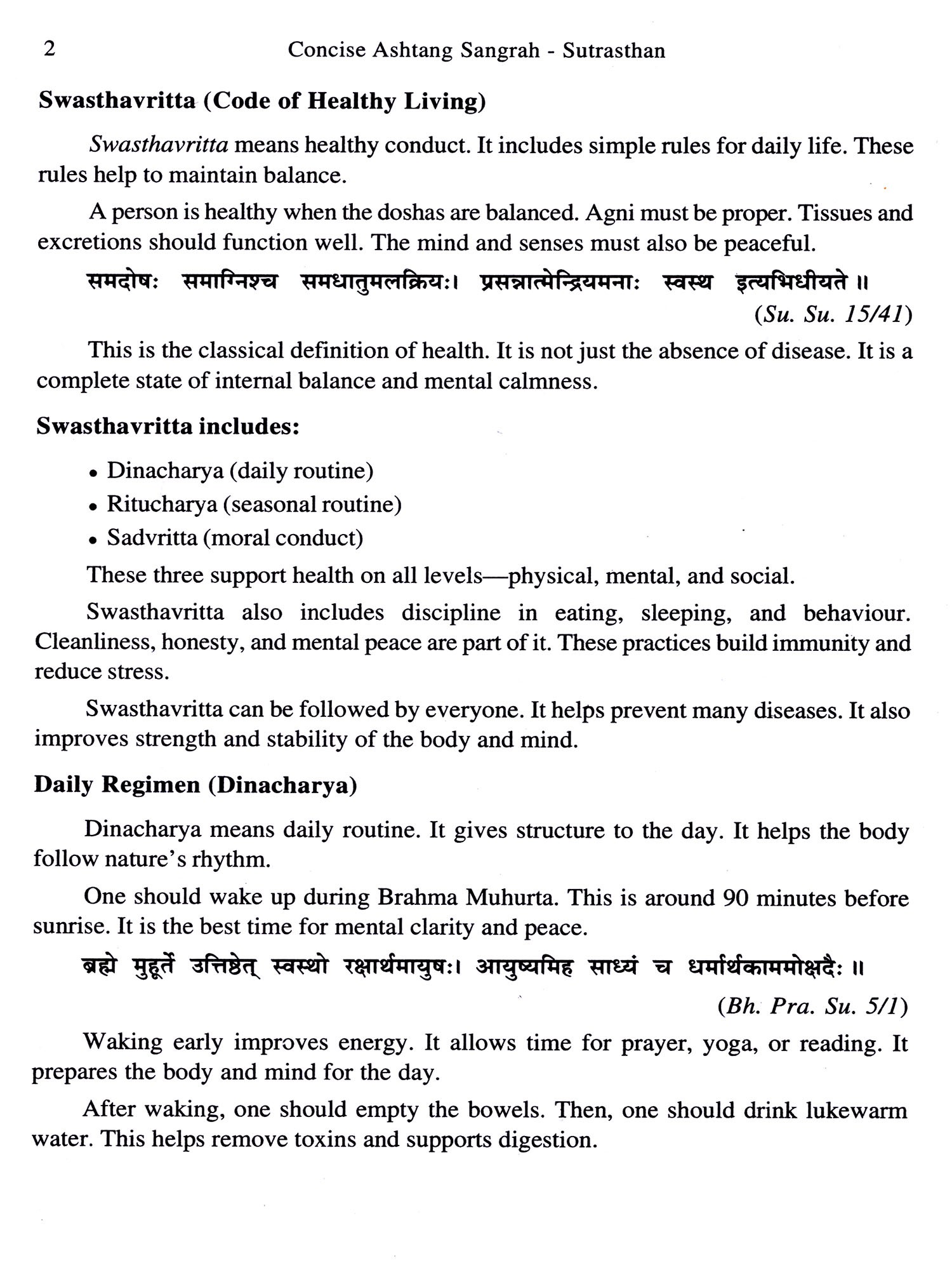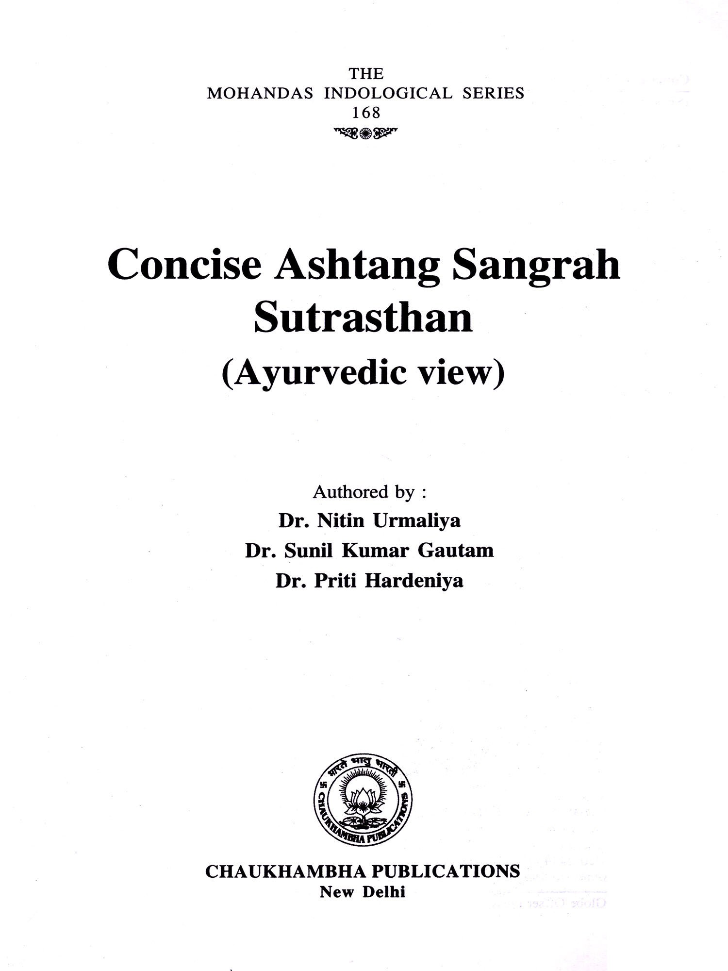 This book, Sankshipt Ashtanga Sangrah (Sutra Sthana), is a sincere effort to present the ancient wisdom of the Sutra Sthana in a simplified, structured, and student-friendly format. The content has been carefully curated to meet the acadernic and practical needs of undergraduate students of Ayurveda in India. Authentic Sanskrit shlokas have been quoted directly from the text, with clear and concise English explanations to aid understanding. At every stage, the integrity of classical knowledge has been maintained, while ensuring clarity and accessibility for the modern learner.