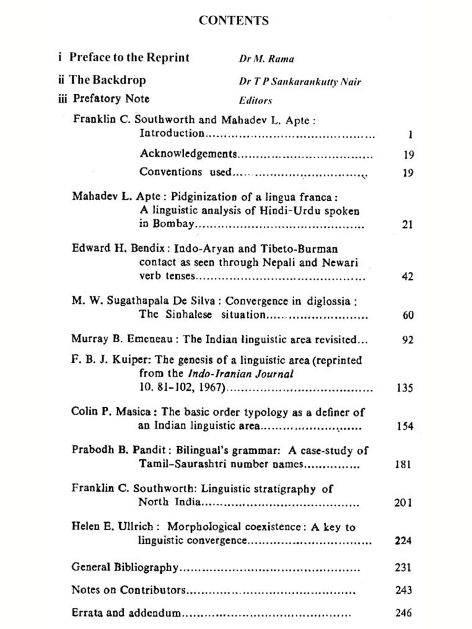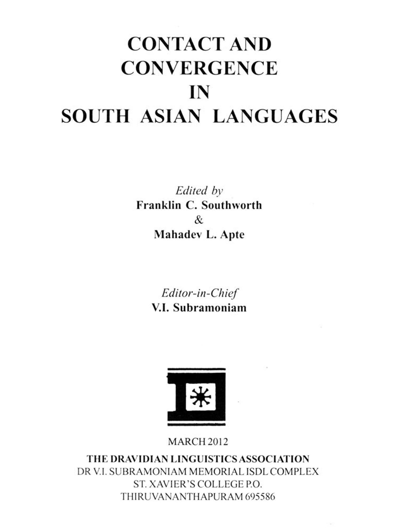 The book edited by Professor Franklin C. Southworth and Professor Mahadev L. Apte entitled "Contact and Convergence in South Asian Languages" was part of a series of publications brought out from DLA/ISDL/IJDL under the leadership of Dr V.I. Subramoniam, the Editor in Chief. Infact the papers have been published in IJDL in Vol III Numbers I & II. But even after the lapse of about three dozen years there is considerable demand for the book. Further we thought it fit to reprint the same without any further editing.