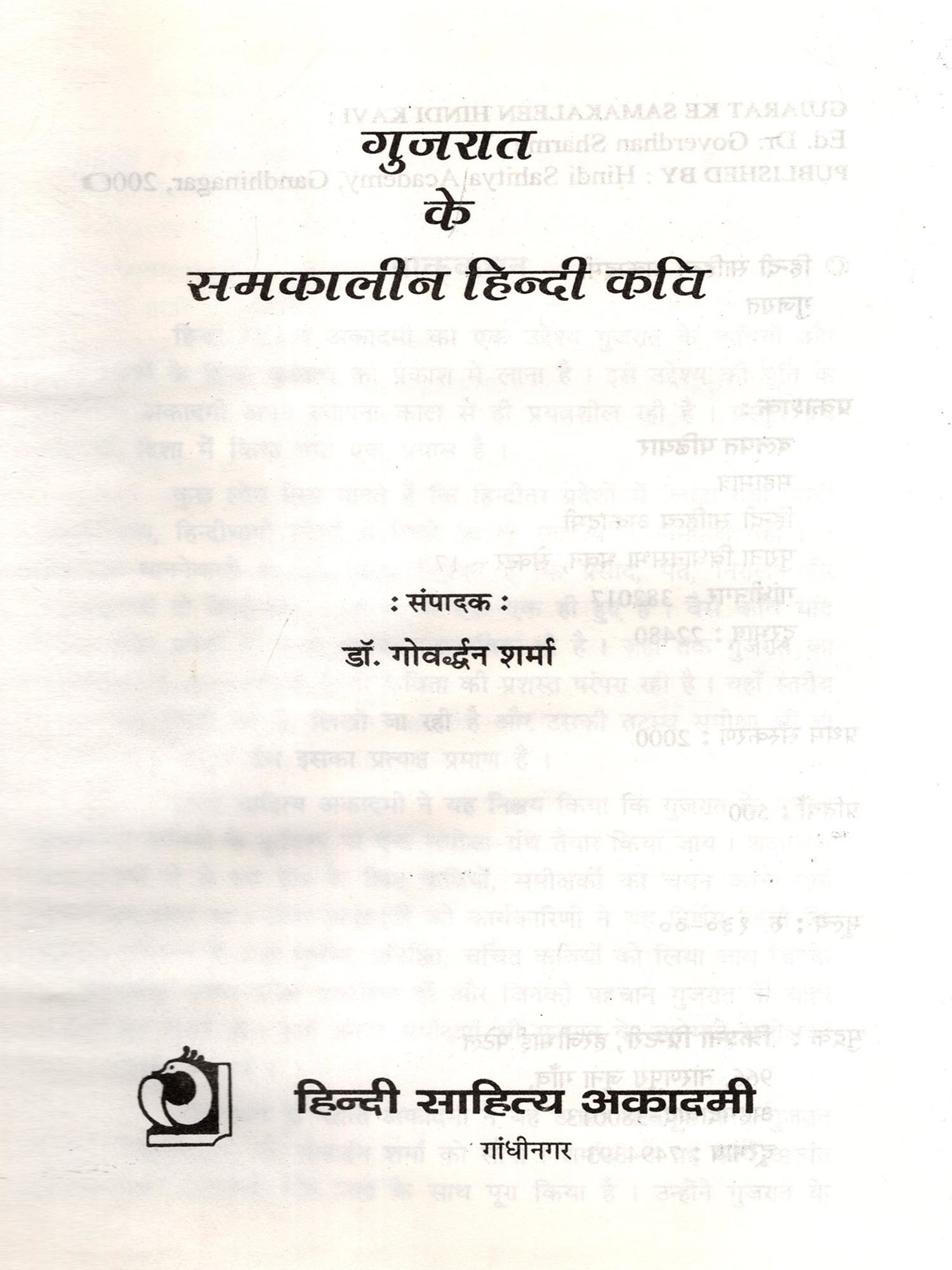 हिन्दी साहित्य अकादमी का एक उद्देश्य गुजरात के कवियों और लेखकों के हिन्दी कृतित्व को प्रकाश में लाना है। इस उद्देश्य की पूर्ति के लिए अकादमी अपने स्थापना काल से ही प्रयत्नशील रही है। प्रस्तुत ग्रंथ इसी दिशा में किया गया एक प्रयास है।
