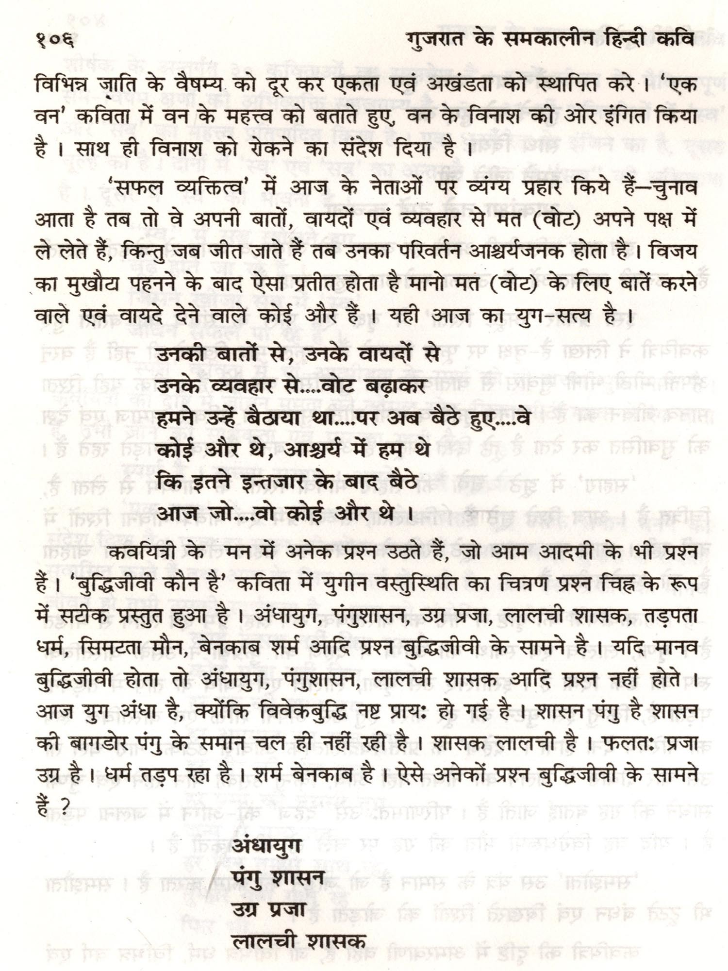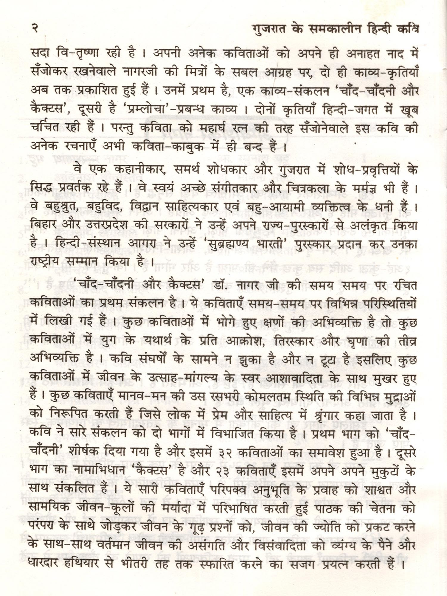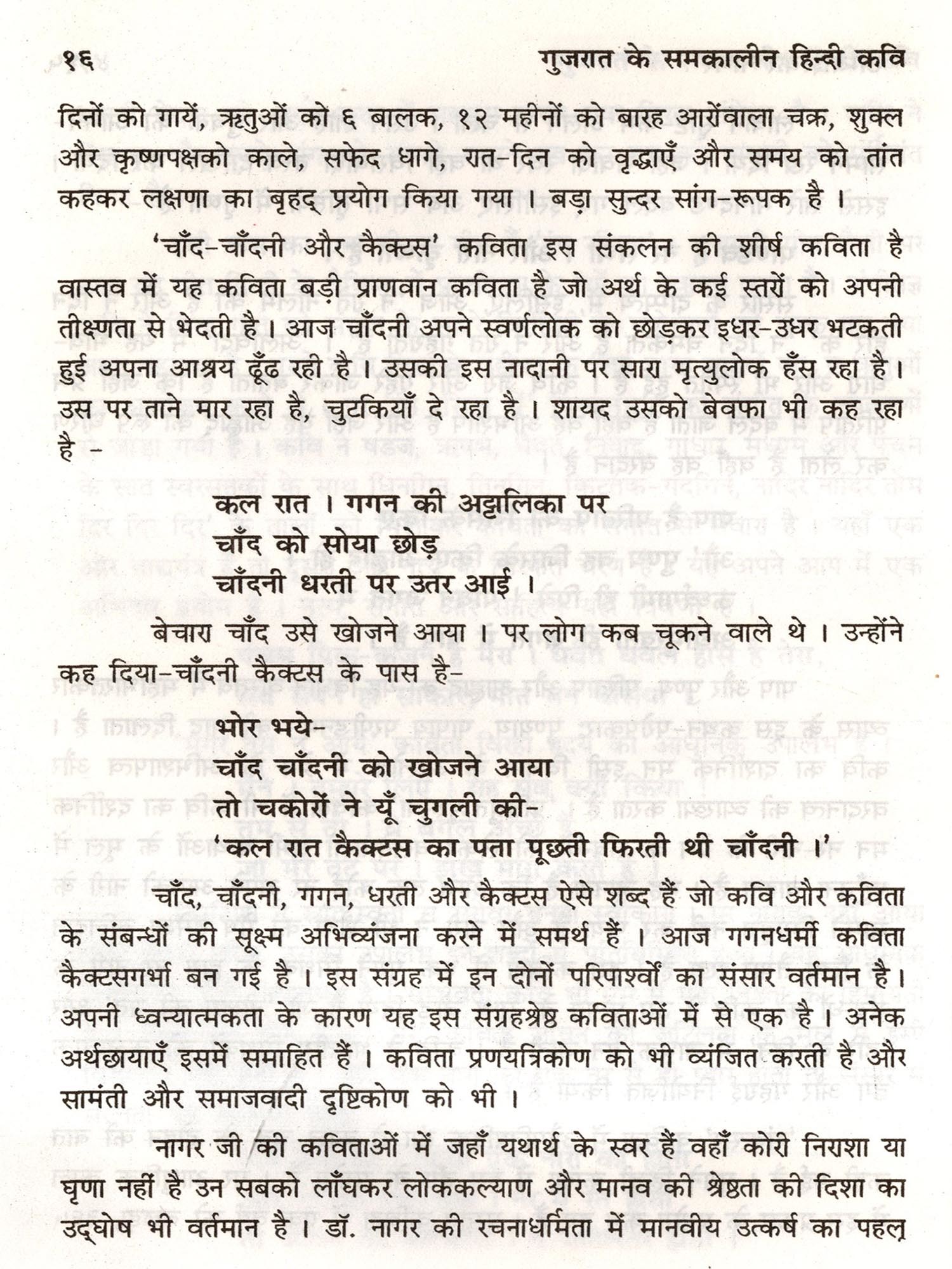 कुछ लोग ऐसा मानते हैं कि हिन्दीतर प्रदेशों में लिखा गया हिन्दी साहित्य, हिन्दीभाषी प्रदेशों में लिखे जा रहे साहित्य के समकक्ष नहीं है। ऐसा माननेवालो से मेरा विनम्र निवेदन है कि प्रसाद, पंत, निराला और महादेवी तो हिन्दीभाषी प्रदेश में भी एक-एक ही हुए हैं। वैसे कवि यदि हिन्दीतर प्रदेशों में न हों तो यह स्वाभाविक ही है। जहाँ तक गुजरात का सवाल है, इस प्रदेश में हिन्दी कविता की प्रशस्त परंपरा रही है। यहाँ स्तरीय कविता लिखी गई है, लिखी जा रही है और उसकी तटस्थ समीक्षा भी हो रही है। प्रस्तुत ग्रंथ इसका प्रत्यक्ष प्रमाण है।