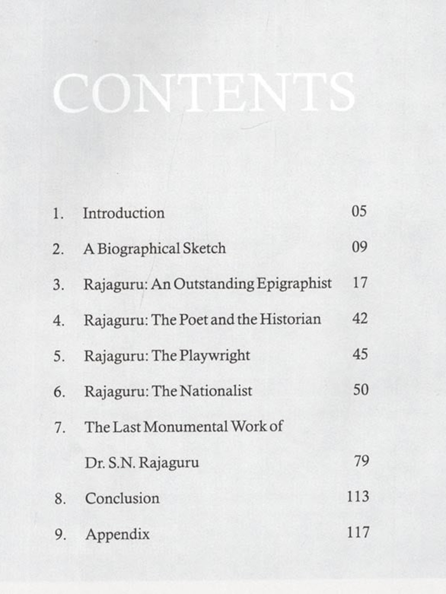 Sri S. N. Rajaguru was born in Paralakhemundi on 19th August, 1903. His father was Pandit Harekrushna Rajaguru and mother was Sunamani Devi. When he was young, he could read the writings of Hunter on Odisha. He was interested in studying the inscriptions found in the temples of Mukhalingam, Simhachalam. In 1950, he joined in Odisha State Museum where he remained in charge of the Epigraphy section. As the Curator of Odisha State Museum, he made a commendable contribution for publishing five volumes of "Inscriptions of Orissa". Before the publication of the volumes on the inscriptions, he was interested in carrying out research on the dynasty of Gangas which resulted in the publication of "The Gangas of Kalinga" in two volumes in 1932. These two volumes show his keen interest and deep research in examining the original history of a noted dynasty ie the Gangas. After retirement, he joined in Sri Jagannath Sanskrit University, Puri to decipher mainly the inscriptions found in the Nrusimha temple, Markandesvar temple, Patalesvara temple and other monuments inside the Jagannath temple complex. After a long period of research, the monumental work "Inscriptions of the Temple of Purn and Origin of Sri Purusottama Jagannath" was published in two volumes by Sri Jagannath Sanskrit Vishvavidyalaya in 1992 and 2003 respectively. Before the publication of its 2nd volume he had passed away in 1997. By deciphering the inscriptions here, he could bring into light certain new facts. Along with the study of the inscriptions, he focused on Purushottama Kshetra, builder of Nrusimha temple, the impact of Srivaishnavism, Jayadeva, Mathas of Puri and car festival of Lord Jagannath. On the historical writings of Dr. S.N.Rajaguru, no extensive work has yet been done by the scholars.