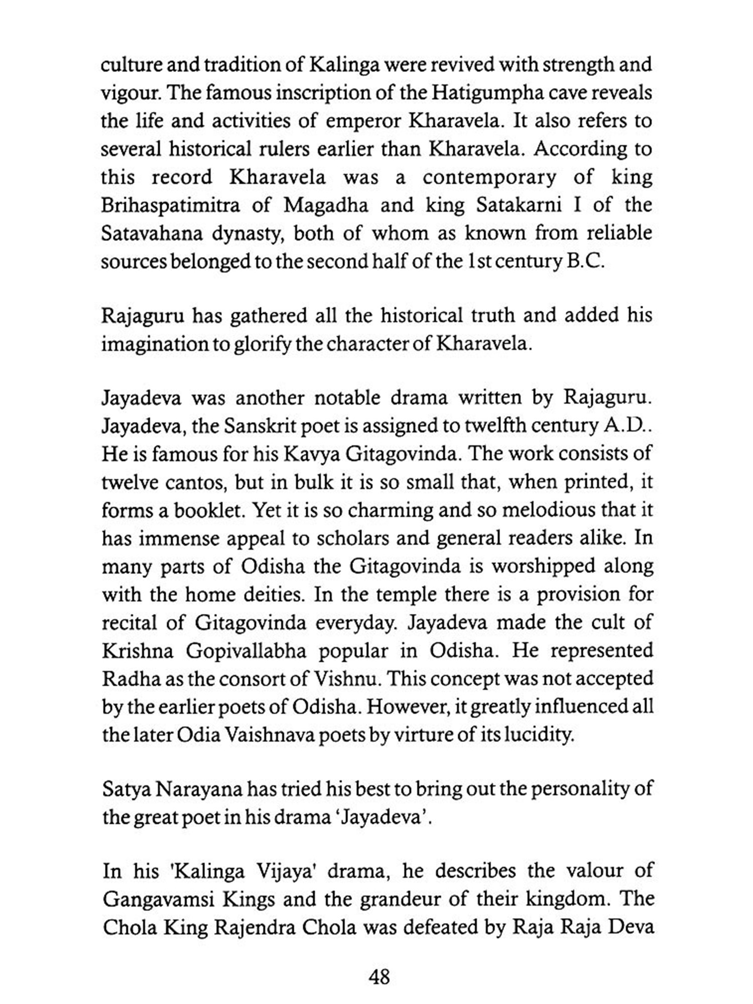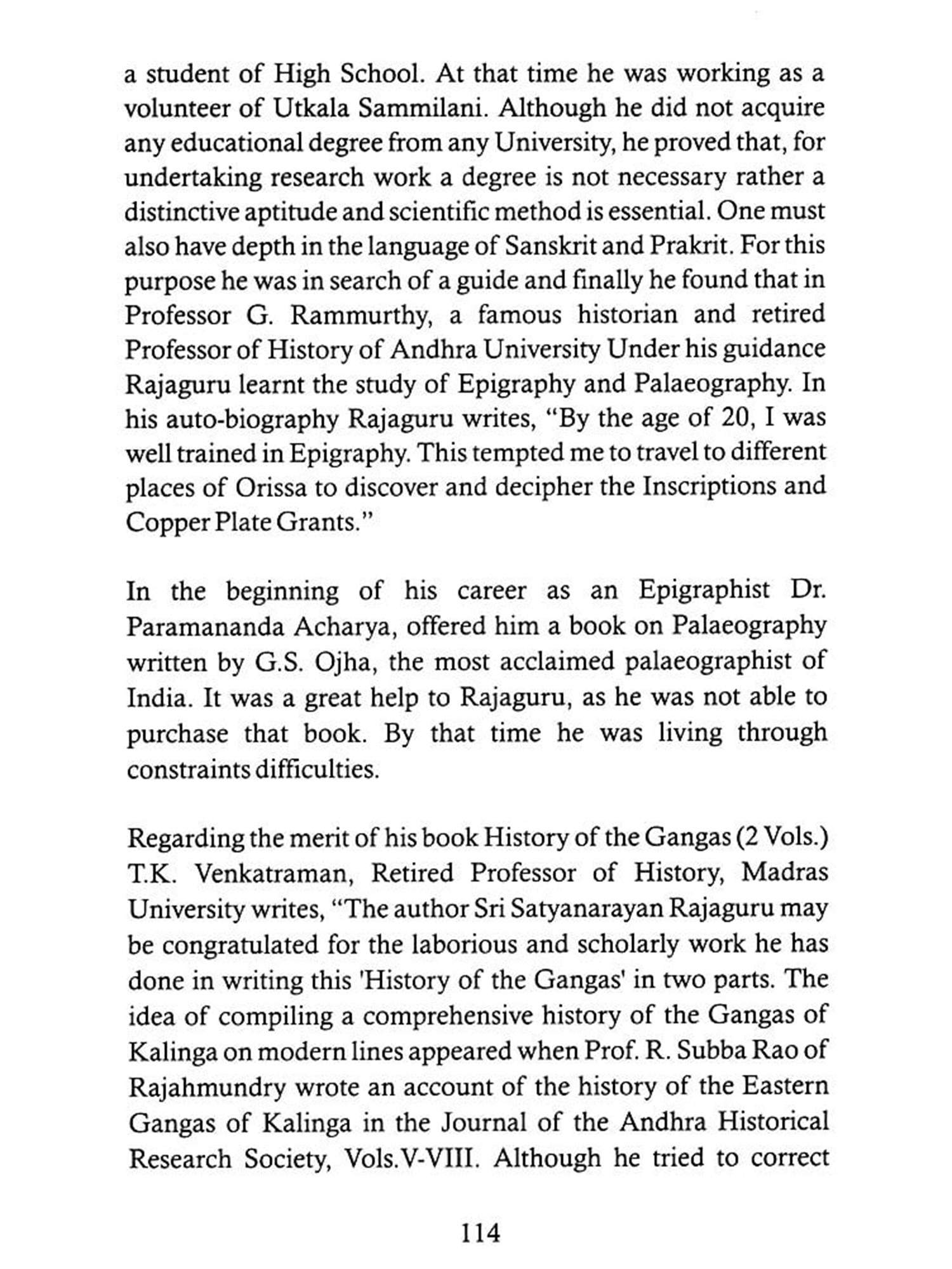 Among the historians who had enriched the history of Odisha through their pioneering works, particularly in the post-independence era, Satya Narayana Rajaguru occupies a prominent place. Basically he was an epigraphist, but his vast area of interest covered different aspects of Odishan history. He had gone deep to the original source materials to find out the unknown past. His interpretation on some intricate issues in history has been based on solid foundation. He had tried to solve the controversial problems linked with the history of Odisha. In Odia language, he had written historical plays, research articles and traditional history books. In Sanskrit and Telugu languages, he had also published research articles. He had reached at the pinnacle of glory when he was awarded Padma Shri by the Government of India in 1974.