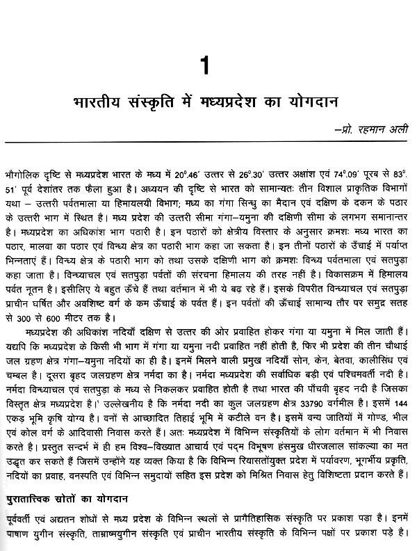 भारत के मध्यभाग में स्थित मध्यप्रदेश में प्राचीन मंदिरों, देवी-देवताओं की असंख्य प्रतिमाओं, उत्कीर्ण अभिलेखों, विविध राजवंशों के सिक्कों, अभिलिखित मृण्मुद्रांकों के अतिरिक्त महाजनपद काल से लेकर मध्यकाल तक के प्रचुर पुरावशेष विद्यमान हैं। प्राचीन स्मारकों, प्राचीन दुर्गों किलों के अनेक भौतिक-साक्ष्य दृष्टिगत होते हैं। पर्यटन तथा लोक-कला, लोक-संस्कृति, लोकनृत्य, लोक-साहित्य इत्यादि का भी भारतीय संस्कृति में अप्रतिम योगदान है।