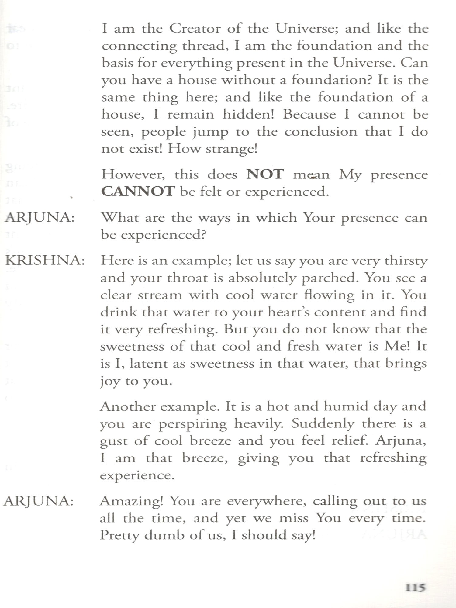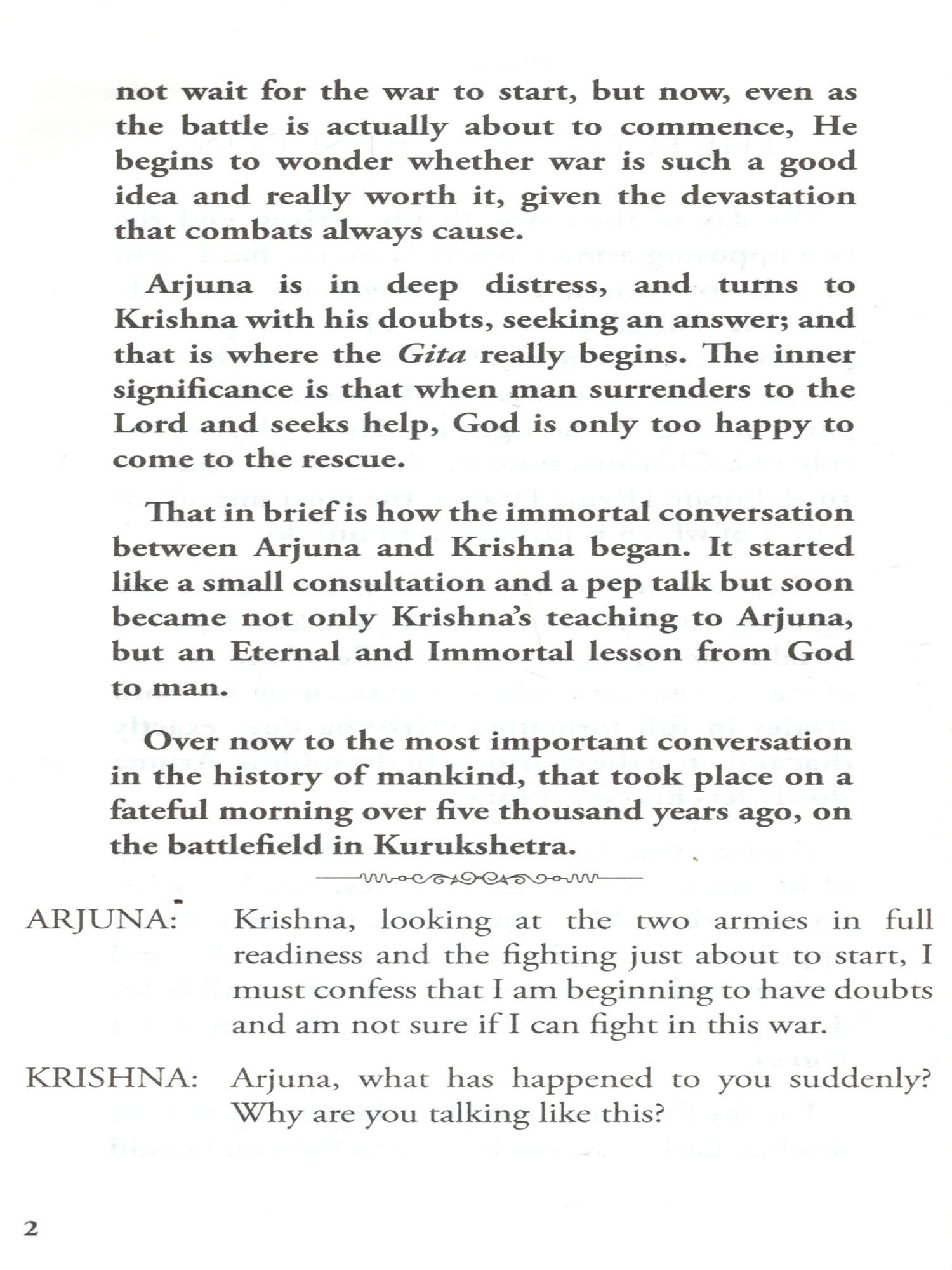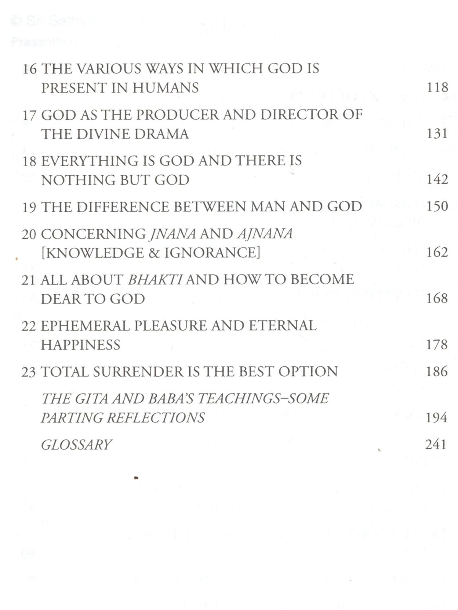 There are indeed a few important differences where this book is concerned. The first is that the Gita is presented as a SIMPLE conversation between God and man, and in the language of the day. It is almost like the conversation we might have with God freely raising our doubts and so on, if He were to appear before us. Many might wonder whether taking such a liberty would not diminish the sanctity of the original Gita, held in great reverence by millions for thousands of years; there is some merit in such an argument. However, after listening to countless discourses of Bhagavan Sri Sathya Sai Baba, I have come to the conclusion that the ESSENCE of the Gita is more important to humanity today than ever before in human history. As a result, I strongly believe that every effort must be made to get across that message in as simple and effective a manner as possible, which is why I have taken a huge liberty in presenting the Gita the way I have done; I sincerely hope that the result is worth the risk I have taken.