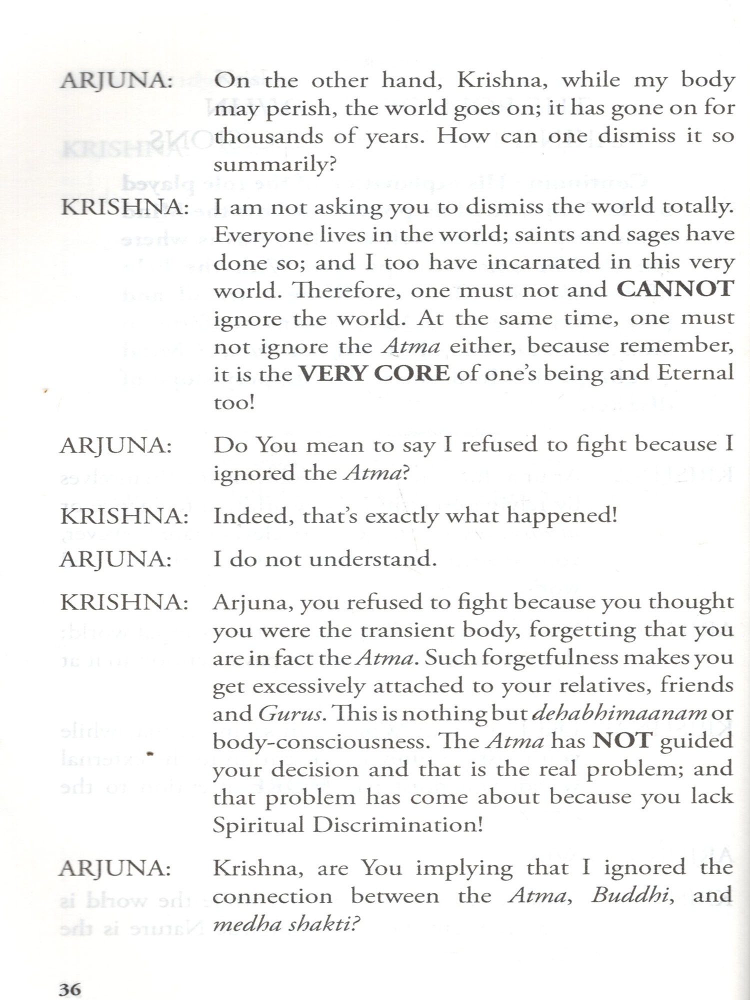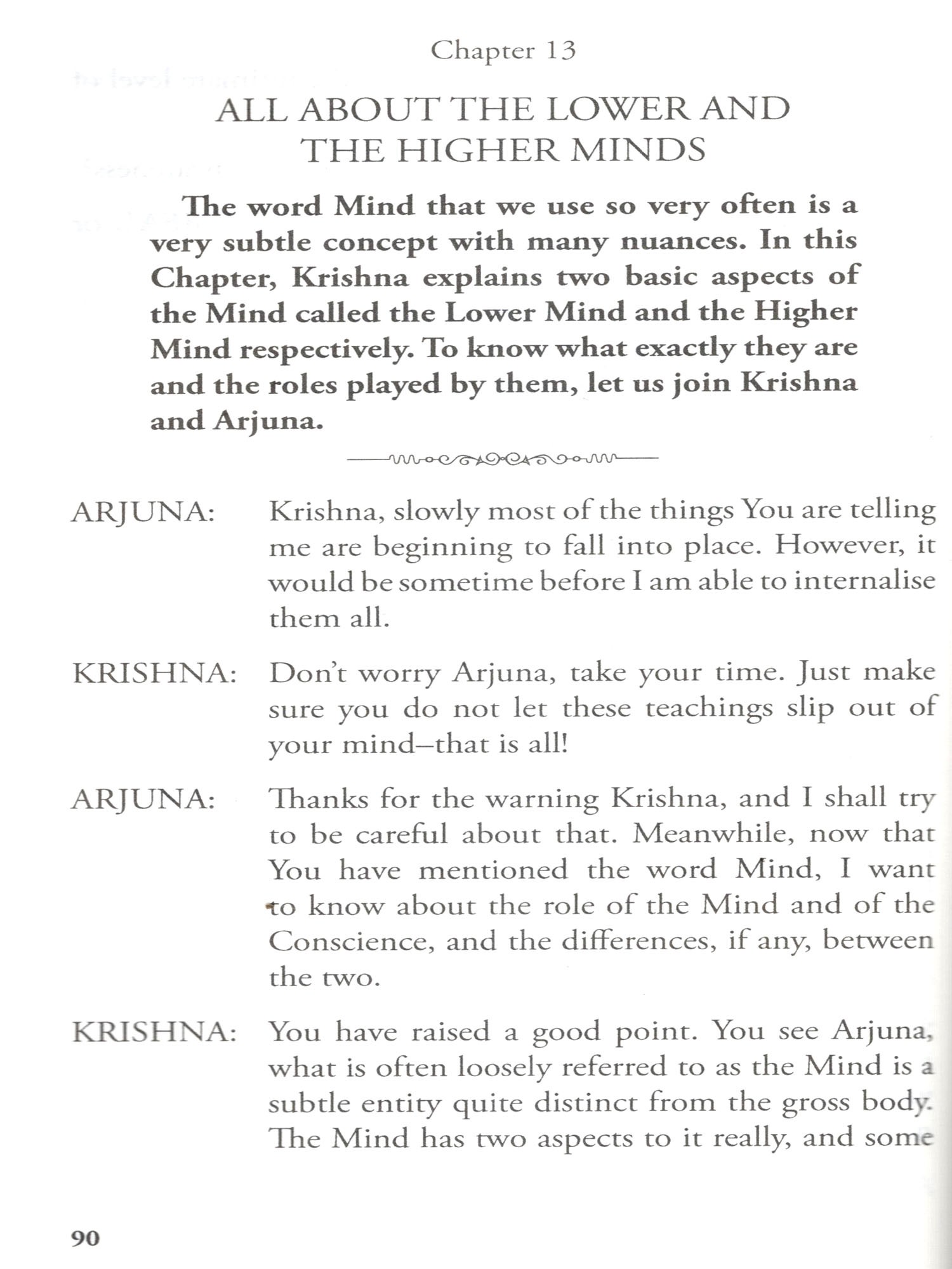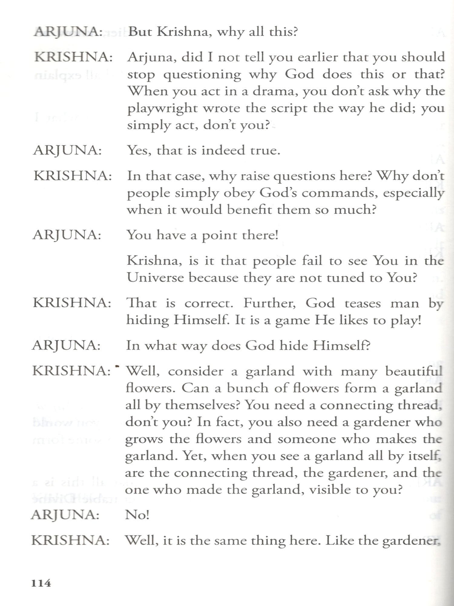 There are indeed a few important differences where this book is concerned. The first is that the Gita is presented as a SIMPLE conversation between God and man, and in the language of the day. It is almost like the conversation we might have with God freely raising our doubts and so on, if He were to appear before us. Many might wonder whether taking such a liberty would not diminish the sanctity of the original Gita, held in great reverence by millions for thousands of years; there is some merit in such an argument. However, after listening to countless discourses of Bhagavan Sri Sathya Sai Baba, I have come to the conclusion that the ESSENCE of the Gita is more important to humanity today than ever before in human history. As a result, I strongly believe that every effort must be made to get across that message in as simple and effective a manner as possible, which is why I have taken a huge liberty in presenting the Gita the way I have done; I sincerely hope that the result is worth the risk I have taken.