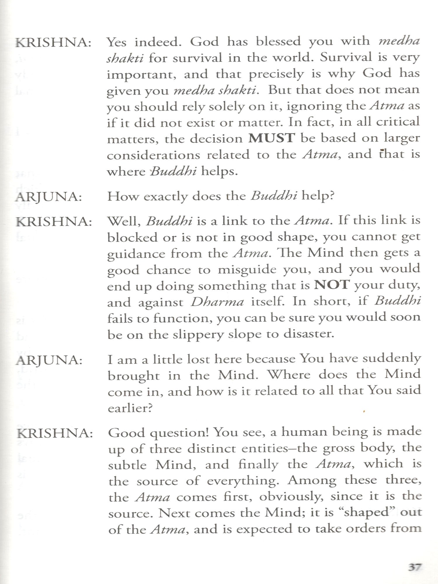 To some, this might appear like a tall claim; however, I request you to suspend your disbelief until you have gone through the book thoroughly, and also read the detailed reflections I offer at the end, after the dialogue between Krishna and Arjuna comes to a close. You would then appreciate [I hope!] how the Message of the Gita is Universal, Timeless, and exactly what we need to tackle the huge and massive problems humanity faces today, all the way from global terrorism to climate change, with many other complex issues thrown in between. Hopefully, you would also get some idea of how, over the ages, saints, seers and noble souls in all lands, each in their own particular way, have intuitively cognised the Divine Nature of the Individual Soul and given expression to it via Love and Compassion, bringing cheer to the miserable and hope to those feeling abandoned. If, as Sage Aurobindo once dreamt, the Pure Love that resides in every Heart can get connected, and humanity as a whole rises in a huge Tsunami of Pure Love, all our problems would, without any doubt, get swept away! It is to bring home this crucial fact that I have adopted a novel approach in preparing and offering this book.