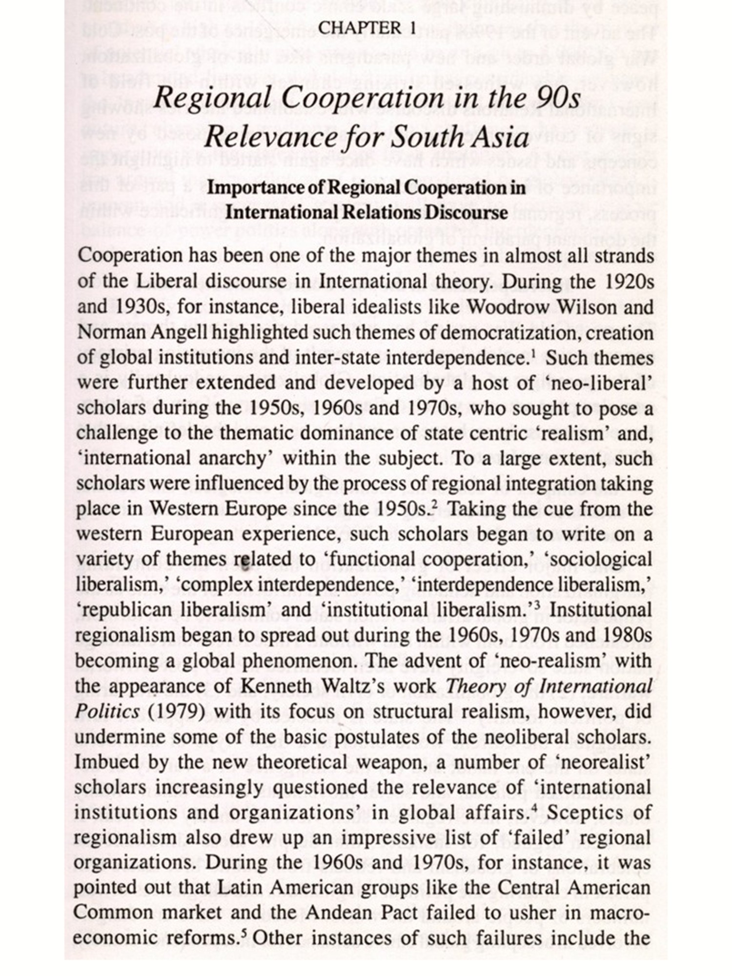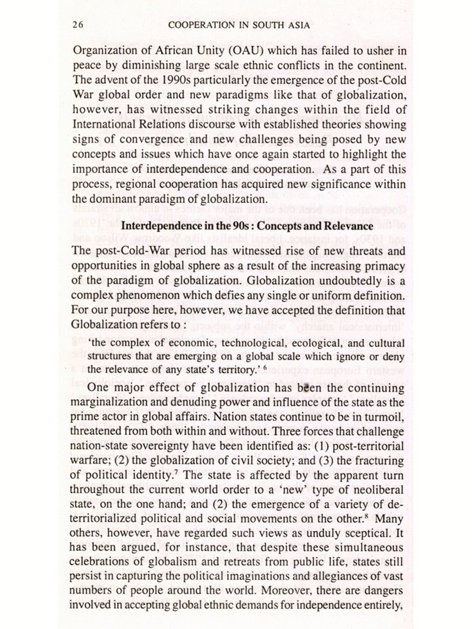 Accepting this definition the region of South Asia can be characterized as one with the longest history and as a coherent political, economic and even administrative unity. All the countries belonging to this region and erstwhile parts of the Indian subcontinent are geographically compact. South Asia also constitutes a coherent environmental region with a conjoint ecological cycle and a common river, ocean and mountain system. The region indeed enjoys an extremely rich common historical tradition and legacy as well as cultural and socio-economic commonalities. According to one scholar, the best way to characterize the region is by accepting it as a 'security complex', which he defines following Barry Buzan and G. Rizvi (1985) as: