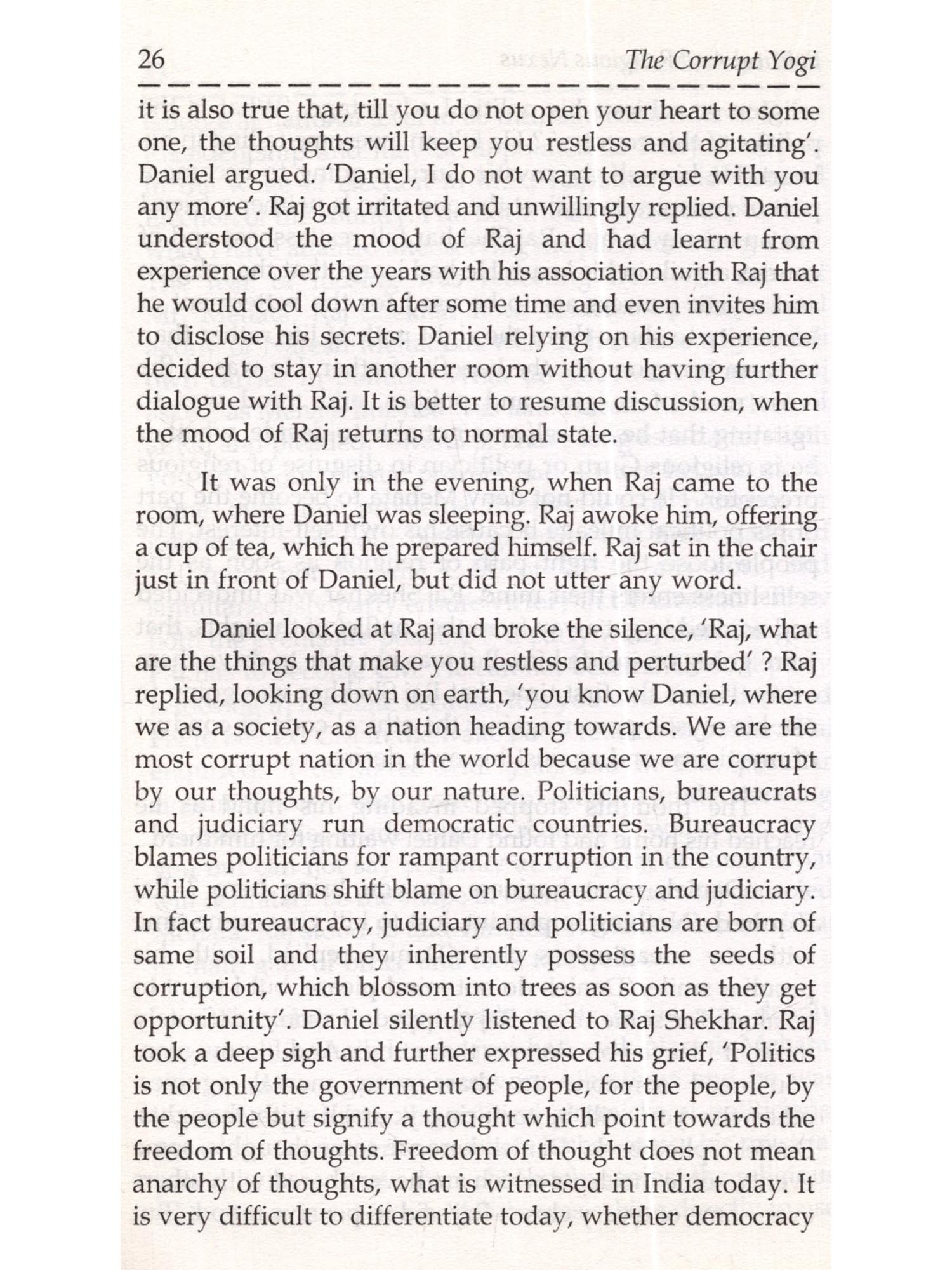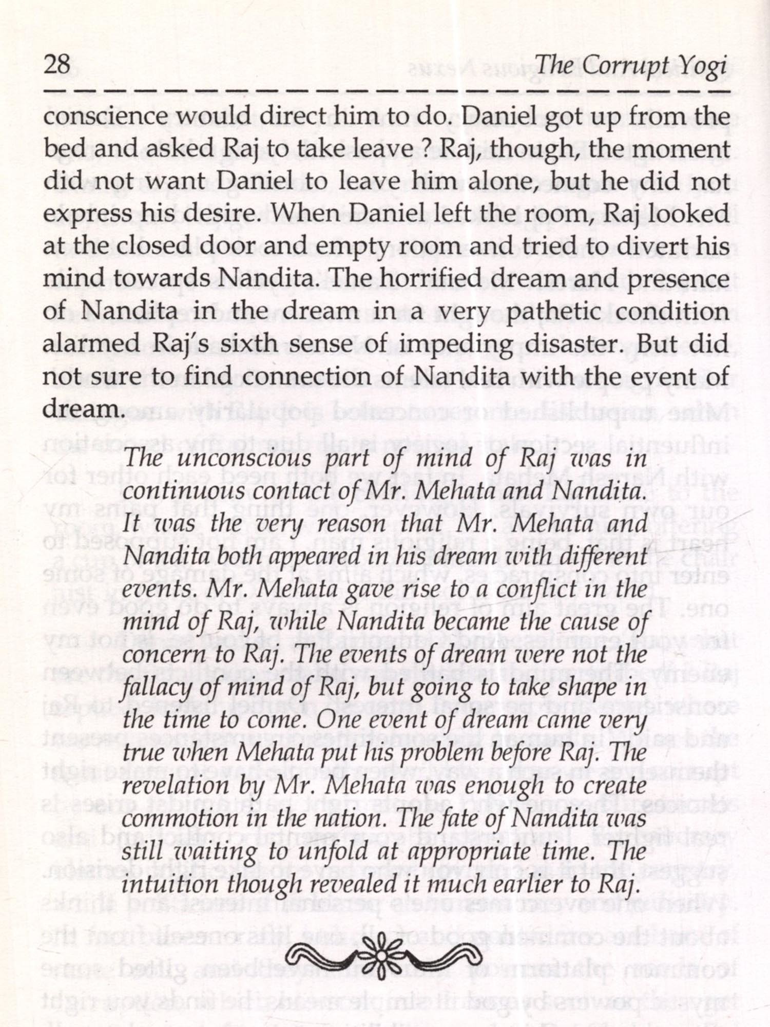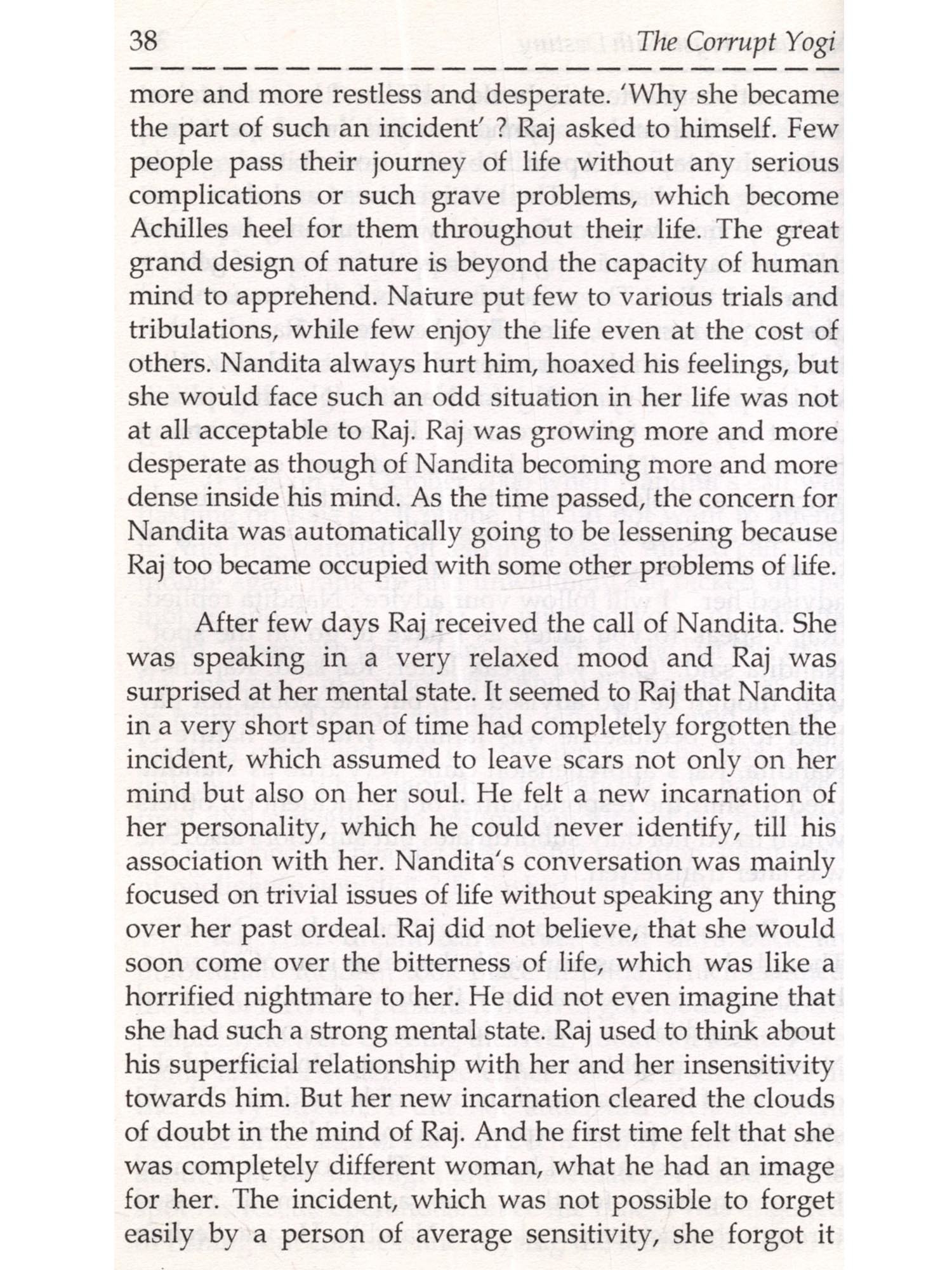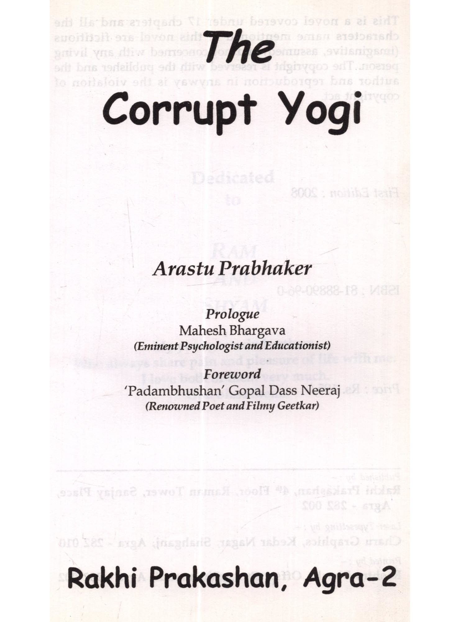 I had gone over the complete manuscript of The Corrupt Yogi and found it absolutely different from the other books published in India in recent times. It is the bok, which tells about the story of a common man who stands just besides us in the society. The beautifully narrated fiction is near to reality of life and speaks itself the importance of time. The concept of shadow reading is an old technique of occultism in India, which has been revised to memory through the book. The other important feature of the book is the encounter of death with the mystic man, which shows the beginning of new life, or new era of his life is to begun soon, though his ignorance did not recognize it at the time. The conflict of a soul dwindling between senses and spirit has beautifully expressed as well as presented. The book is at par in its contents, mystery and spirituality with few notable fictions of Paulo Coehlo. Dr. Prabhaker has already written a book Marriage and Prostitution, which too has made rapid strides in India. Apart from literary faculties, he is well known astrologer of India and has written many research-oriented books on astrology. Perhaps it was the reason that spirituality has find expression through a fiction. The Corrupt Yogi is a mind-blowing fiction and renders its utility to genre of all ages. I wish him all the success.