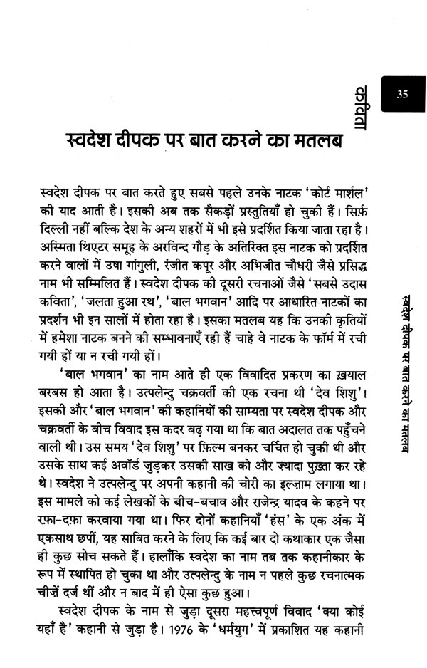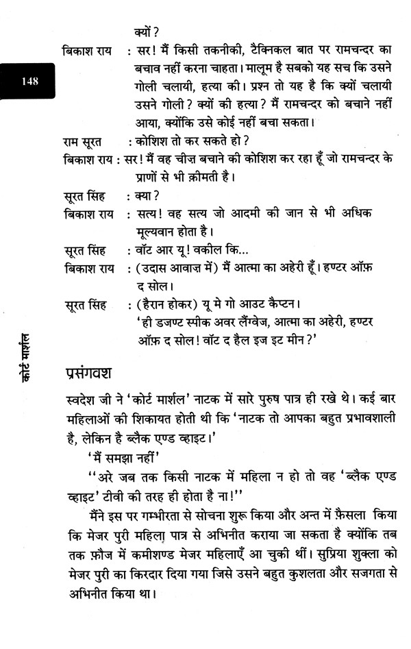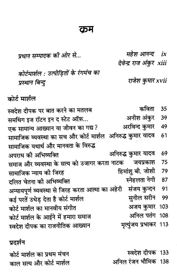 कोर्ट मार्शल' राजेश कुमार द्वारा सम्पादित है। इसमें कई रचनाकारों के लेख शामिल हैं। 'कोर्ट मार्शल' नाटक स्वदेश दीपक द्वारा लिखा गया है। ऐसा माना जाता रहा है कि भारतीय सेना में जातिवाद नहीं है। इस मान्यता को ख़ारिज करता है यह नाटक। स्वदेश दीपक ने भारतीय सेना में व्याप्त जातिवाद की जकड़न को व्यापक ढंग से दिखाया है। सेना में जातिवादी मानसिकता के लोगों की कमी नहीं है। बी.डी. कपूर और कैप्टन वर्मा जैसे जातिवादी लोगों की वजह से सेना की बदनामी होती है। रामचन्दर को उसकी जाति को लेकर उसपर गन्दी टिप्पणी की जाती है। परिणामस्वरूप वह बाग़ी हो जाता है। वह अपने अधिकारी पर गोली चलाता है। कैप्टन वर्मा की मृत्यु हो जाती है और कैप्टन कपूर बच जाते हैं। यह घटना नाटक के केन्द्र में है। अर्थात् स्वदेश दीपक का 'कोर्ट मार्शल' जो वंचितों-उत्पीड़ितों का प्रस्थान बिन्दु था, वही अब अपने महत्तम रूप में आ गया है।