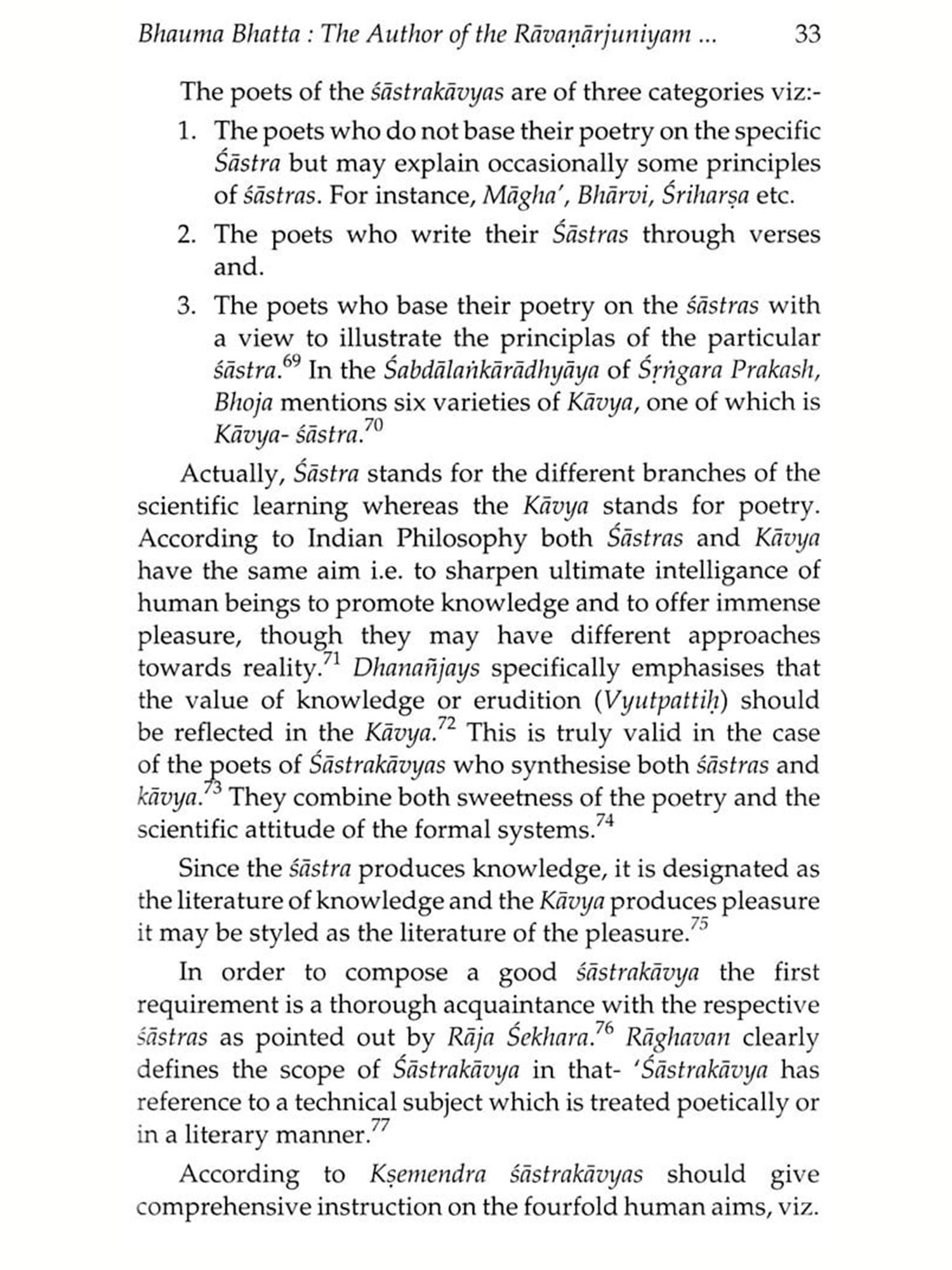 In Kasmir's most congenial and favourable environment, many scholars achieved miraculous intellectual heights and contributed their best share to different fields of Sanskrit Literature. Their invaluable contribution enriched Sanskrit literature to a commandable extent. The Science of poeties was propounded there which later on spread over to other parts of our country. In other branches too, the contribution of Kasmirian scholars excels both in quantity and quality.¹ The scholars like Vasugupta. (founder of Kasmir Saiva-Philosophy), Mammața (great rhetorician), kalhana (a great historien), Abhinavagupta, (a versatile genius), Ksmendra (a profile writer), Ratnakara, Anandavardhana, Billhana etc. (the poets of high merit) produced the literature of an immense value. All their works dealing with diverse subjects such as religion, philosophy, romance, satire, dramaturgy, history, lexicons, grammar, sociology, etc. constituted a rich legacy in sanskrit literature. It is beyond doubt that there is hardly any branch of Sanskrit literature which remains untouched by the Kasmirian scholars. Thus the Kasmirian scholars played a significant role in the development of Sanskrit literature.