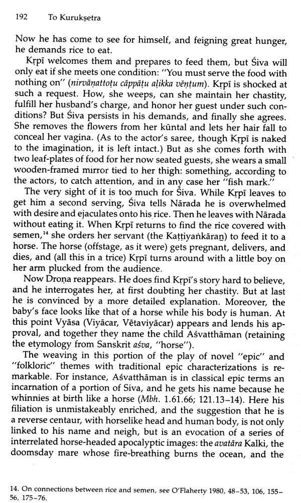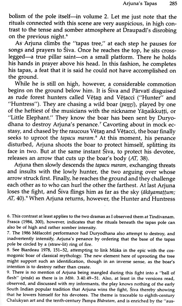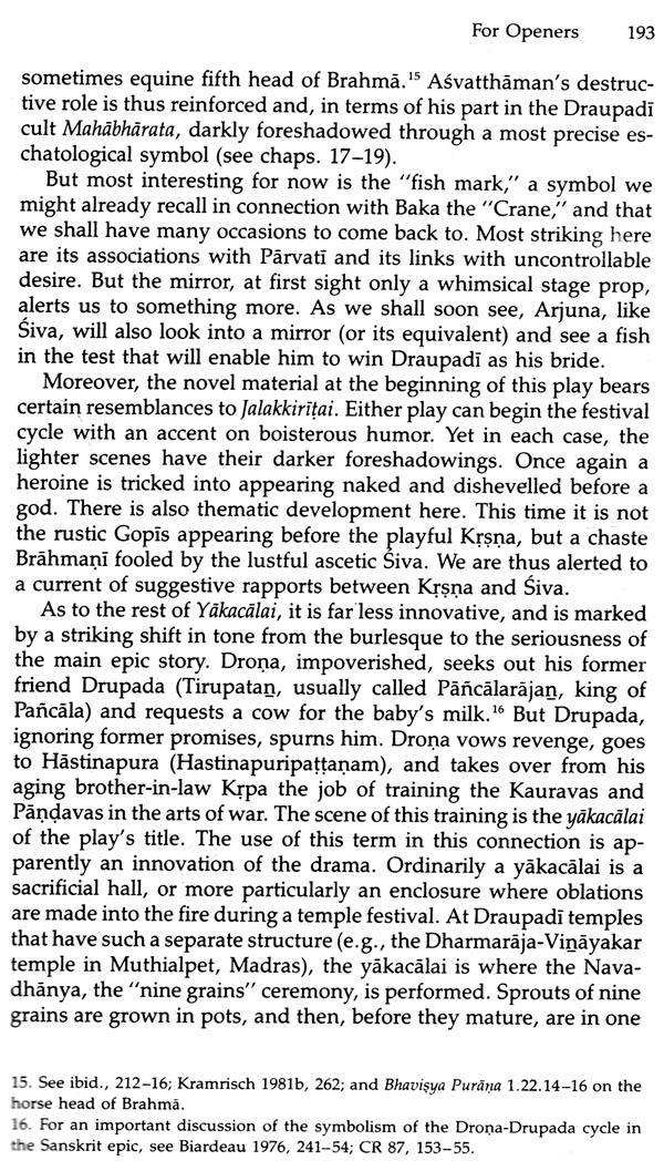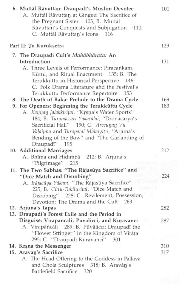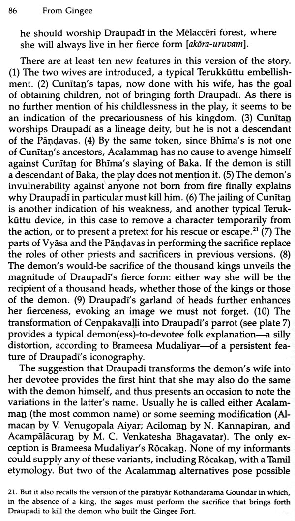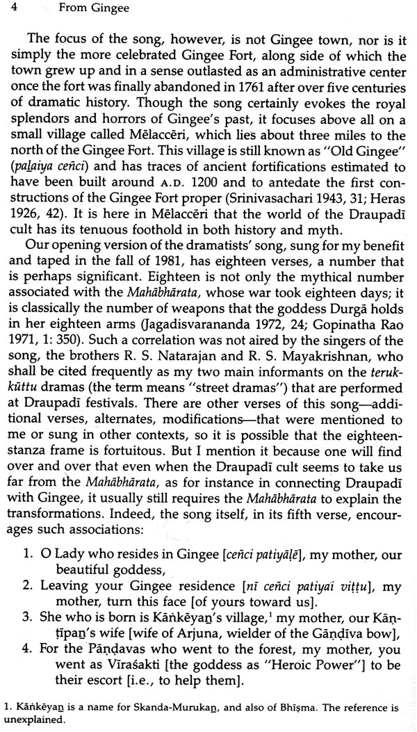 Much material was gathered toward that end at Tindivanam. But over the years, the more I studied the Tindivanam temple and its annual festival, the more I found that I needed to know about other Draupadi temples and their festivals. For one thing, the different :!_merant performers-epic reciters and actors-who came to Tin-i'vanam from year to year not only varied in their own repertoires, t volunteered information on differing practices at other temples and festivals where they had worked. Above all, the more I listened at Tindivanam, the more I heard of connections between Draupadi and Gingee, the region's medieval capital, whose fortified moun-tains could be pointed out on the western horizon from Tindivan-am's rooftops, about twenty miles away. It thus had become evi-dent by 1981 that Gingee's secrets must be plumbed for what they would reveal about the Draupadi cult as a whole: its regional foot-hold, its forgotten history, and the relation between the cult's Gin-gee mythology and its mythology of the Mahabliiirata. And from one angle, that is the subject of this book, which limits itself wherever possible to the Draupadi cult's mythology. But the completion of the larger study must still transpire over two more volumes, a decision also arrived at only after another run of false starts that sought out various ways, all of which eventually proved impossible, to bring the whole under one cover.