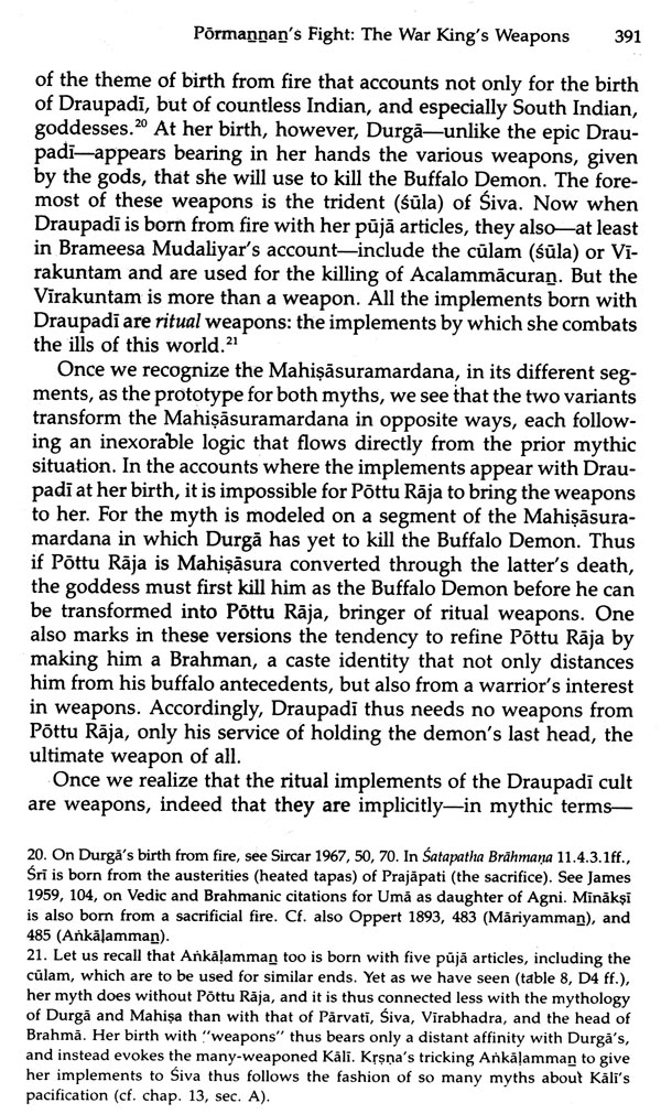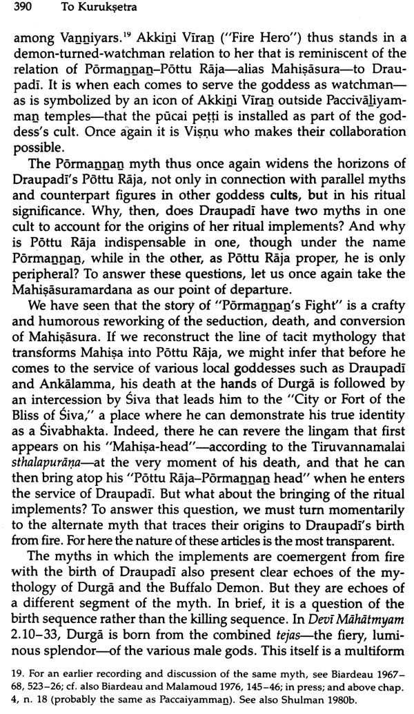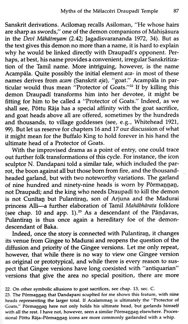 And more generally, it is an attempt to study some at the more far-ranging themes and issues of Hindu mythology through the dynamics of this ongoing relation. As regards the goddess, this Preface need not say much. Numerous studies have begun to make her familiar, and I will cite many of them. Insofar as this work points toward an integrated study of the Hindu goddess (which is itself a desideratum), it does so by correlating Draupadi's mythology with the following primary linkages: the "pan-Indian" Devi Mahatmyam, or "Glorification of the Goddess," the classical Sanskrit text that first synthesizes early material on the goddess, most notably in her forms as Durga, Slayer of the Buffalo Demon, and Kali; the Sanskritic-Brahmanical royal ritual of Dasara, which is equally "pan-Indian," and, with its buf-falo sacrifice, correlated with the Devi Mithatmyam; the springtime festivals to local village and regional goddesses, which recapitulate aspects of Dasara; and the cults of caste and lineage goddesses, which share so much common ground with village and regional cults. In addition, Draupadi's Tamil milieu links her mythology with the goddess myths of the great South Indian Brahmanical temples, most notably those of Minaksi of Madurai, Kamaksi of Kanchipuram, and the buffalo-slaying and androgyne myths of the goddess of Tiruvannamalai. The last two sites are well within the Gingee region.