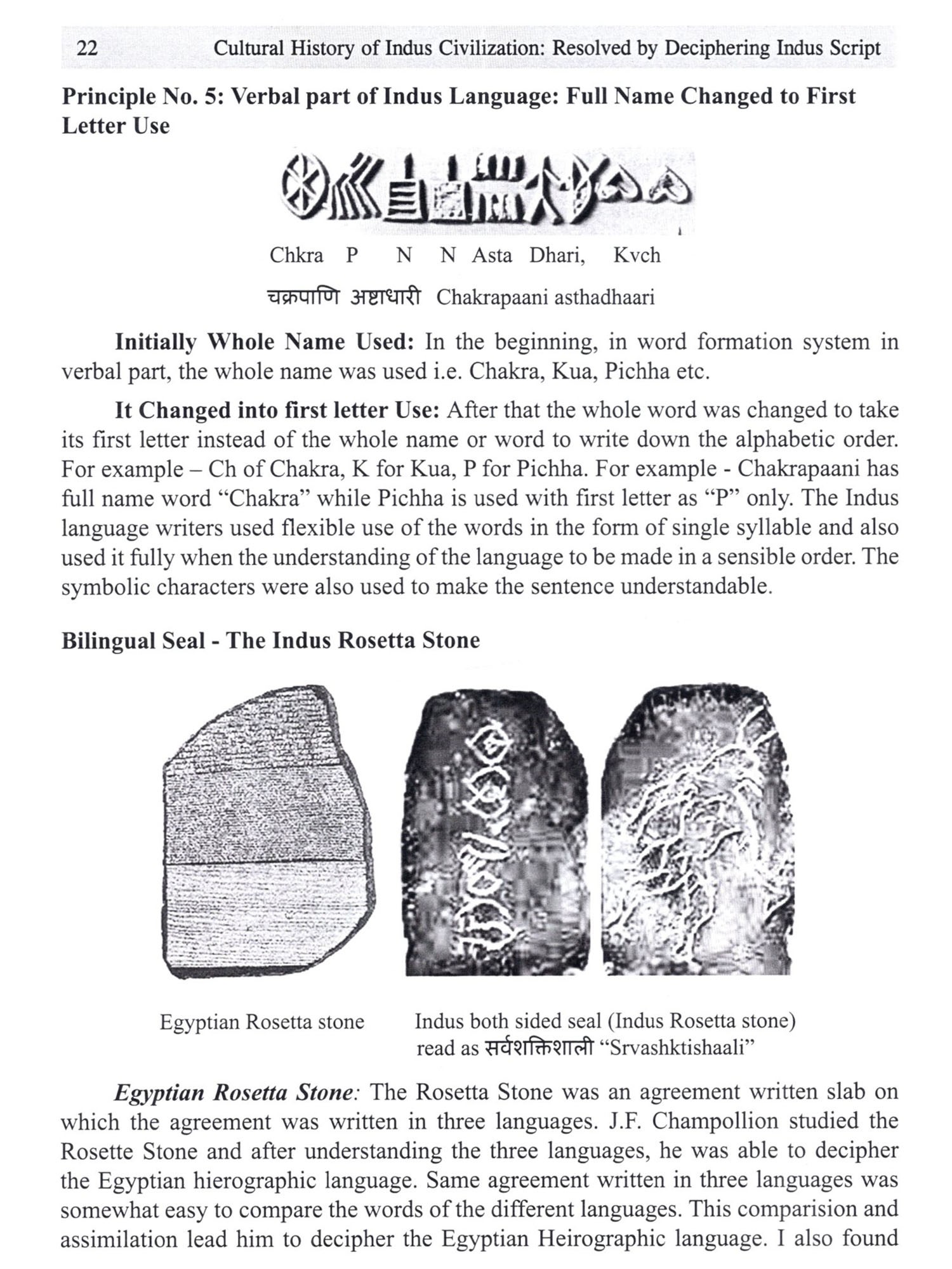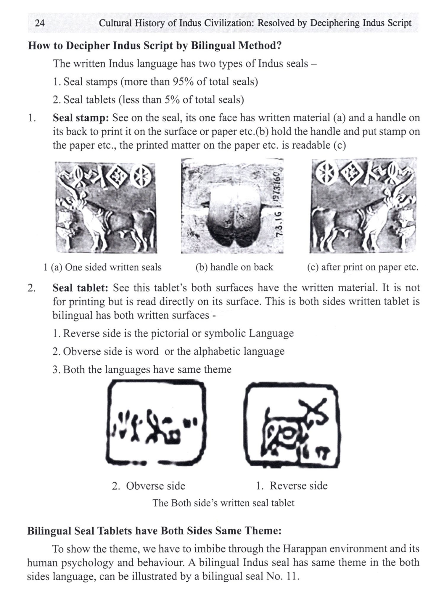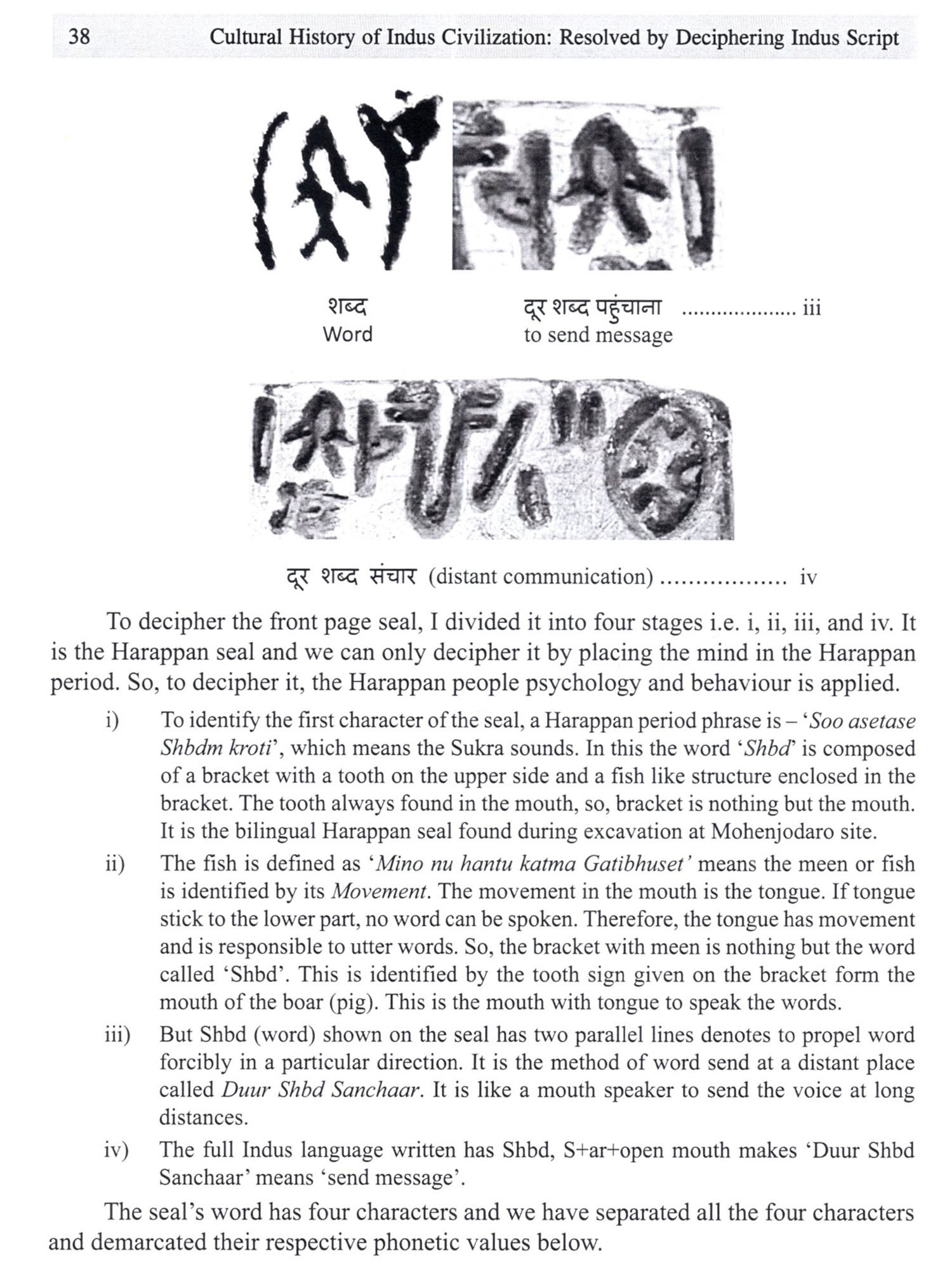 The book deals with the origin of the cultures in the Indus Valley Civilization region. The Indus seals found during excavation at different Harappan sites are deciphered, and the historical background is proved. The seals from Harappa and Mohenjodaro contain inscriptions detailing the history of the Rama dynasty. Chanhudaro has Shiva's lifelong brave activities written on the seals. Dholavira is Krishna's Dvarika (capital city), and the signboard found during excavation is deciphered as "Chakradhar Chakravati Chakrin," which means king Chakradhar, the Krishna. Rakhigarhi was called Rakshigarhi, the capital of Raksas, and the Kairos ruled on the Rakhigarhi. Various cultures governed the Indus cities during different periods. The author presents a new perspective in this book, focusing on the use of words from various languages in the central region of the Harappans, along with their phonetic values. Through this approach, he attempts to decipher the script, which merits recognition for introducing a fresh methodology to the topic.