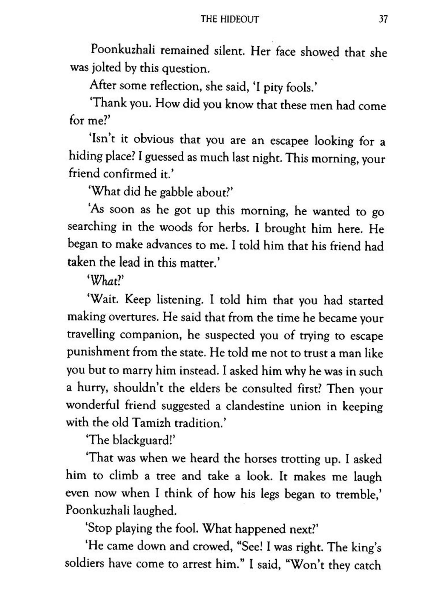 The gallant, quick-witted Vallavaraiyan Vandiyatevan is en route to the war-ravaged island of llankai at the behest of the captivating Chozha princess Kundavai Devi. Aided by the free-spirited boatwoman Poonkuzhali, our ingenious hero wends his way across land and sea in search of 'Ponniyin Selvan' the beloved Chozha prince Arulmozhi Varman.