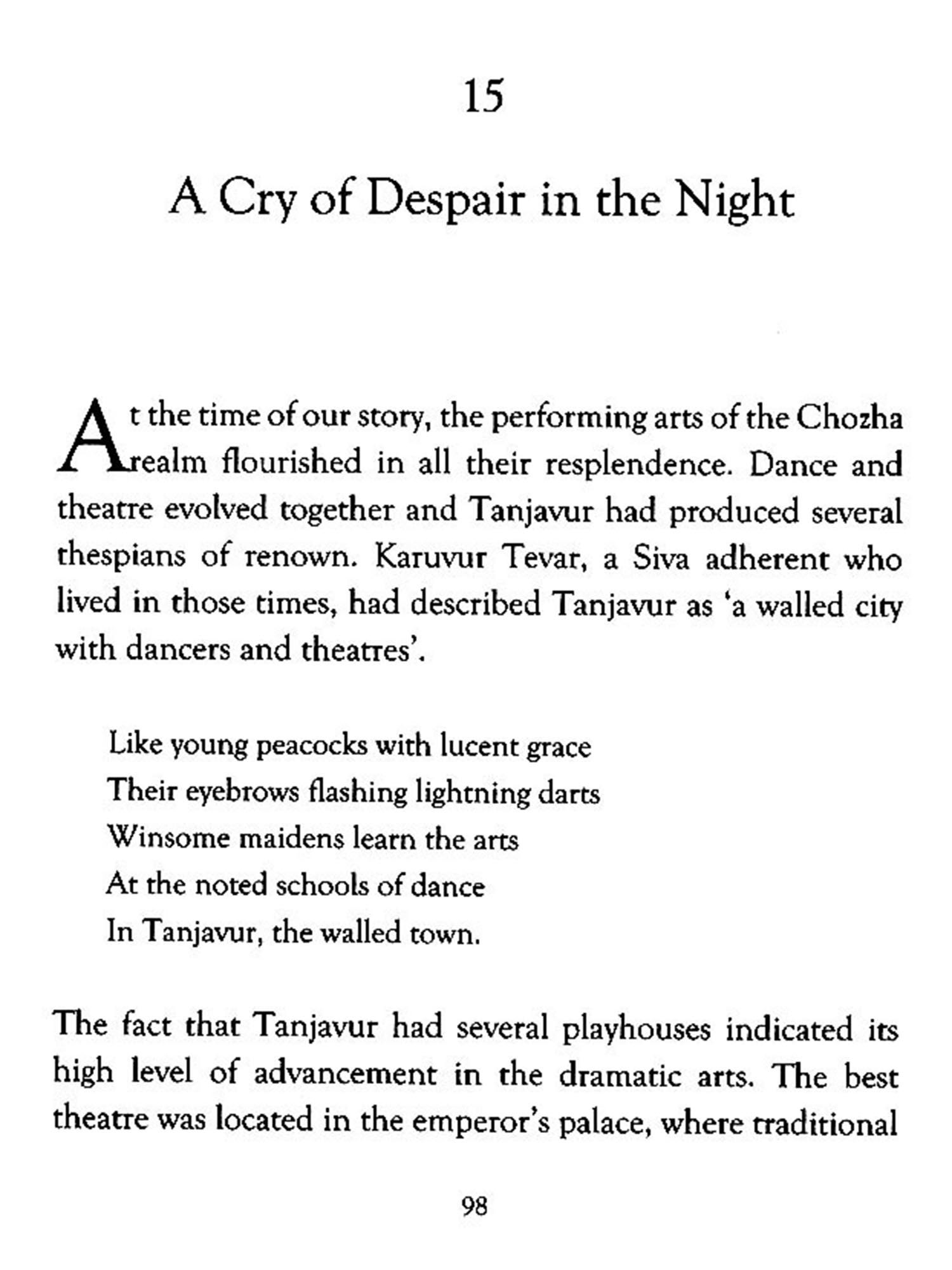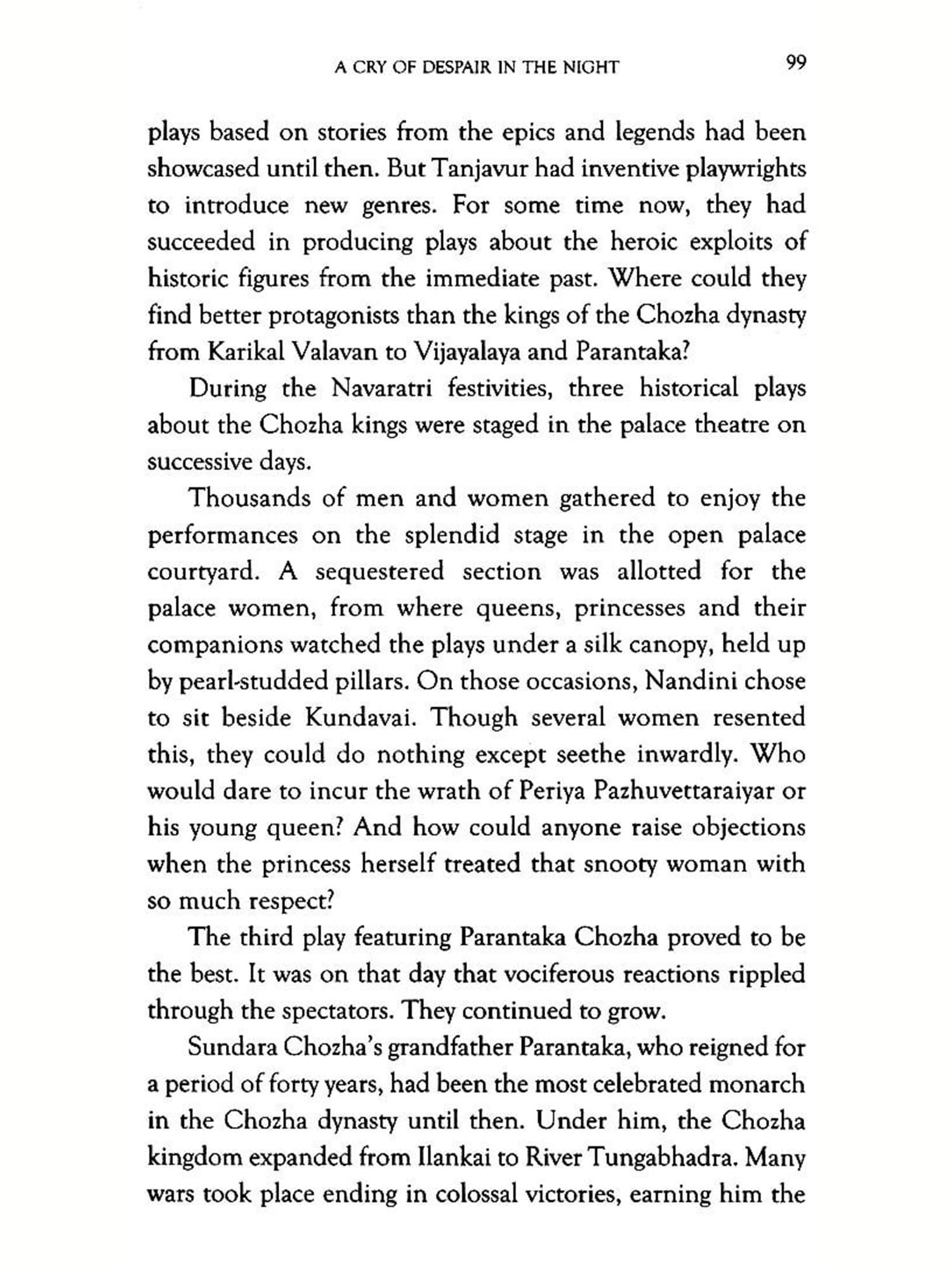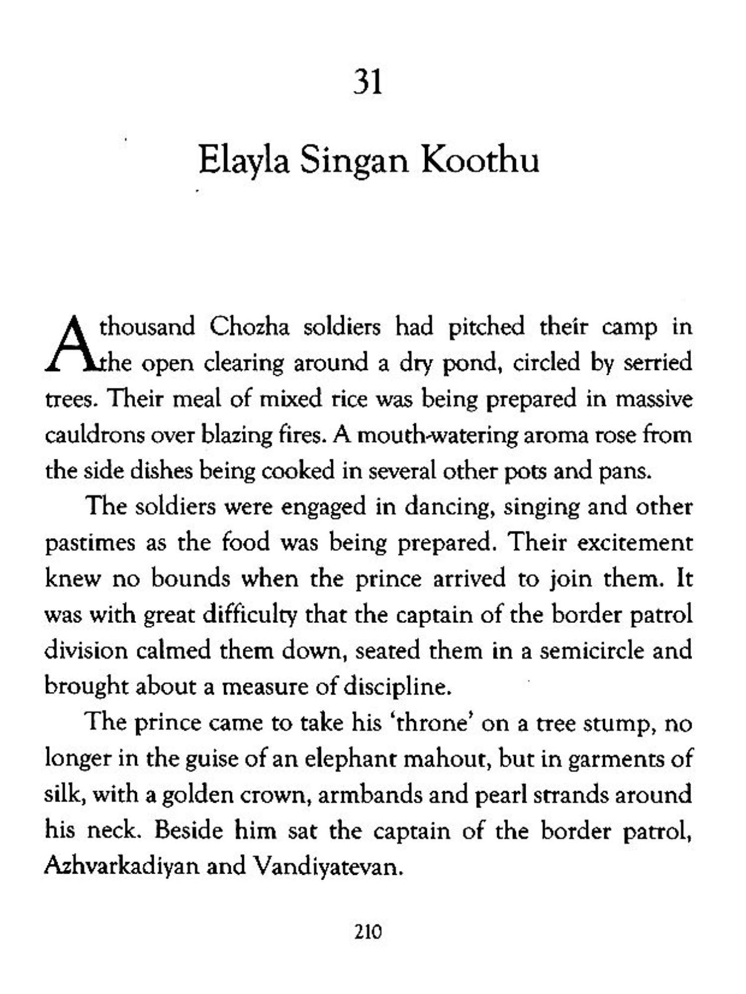 Back home in the Tamil country, the diabolical plot to take over the throne of the Chozha empire gathers momentum. At its centre stands the wife of the senior Pazhuvettaraiyar, the beguiling and dangerous Nandini, who will stop at nothing to bring down the Chozhas. Will the Chozha princes, assisted by the valiant Vandiyatevan, manage to outsmart such formidable foes?