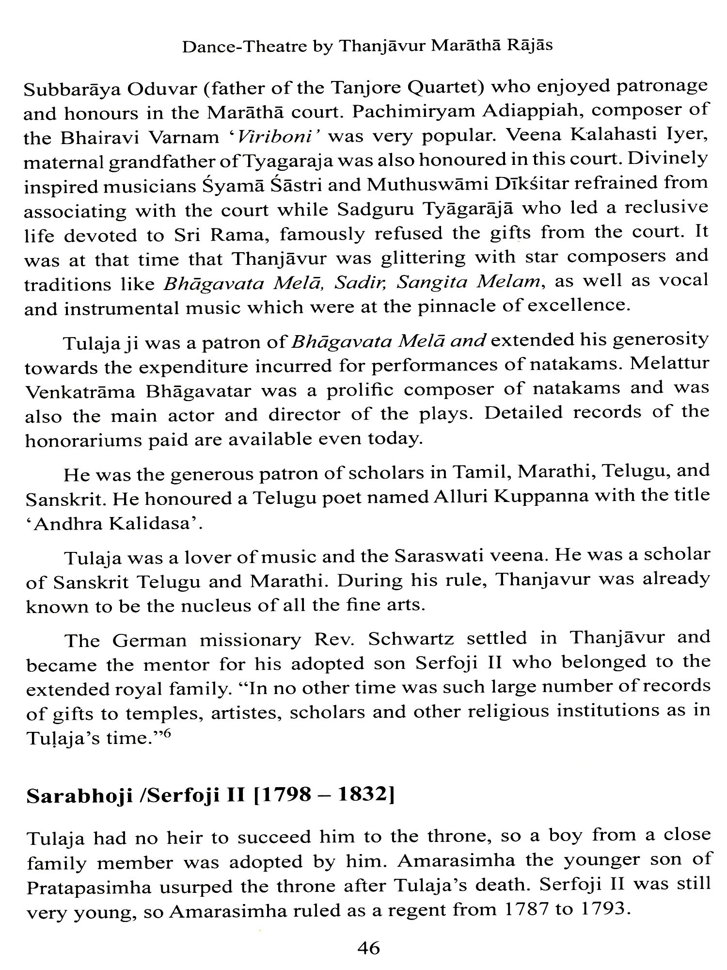 The Maratha kings were natives of Thanjavur, a branch of the family in Maharashtra, western India. Educated in southern music and dance culture which flourished here, they were polyglots fluent in Marathi, Telugu, Sanskrit and Tamil. They used this skill to create multi-lingual plays. The history of Thanjavur Maratha s, their immense contribution to this country's literature and arts goes unnoticed and neglected even today. An academic study of the plays has been neglected and almost forgotten save by a few scholars.