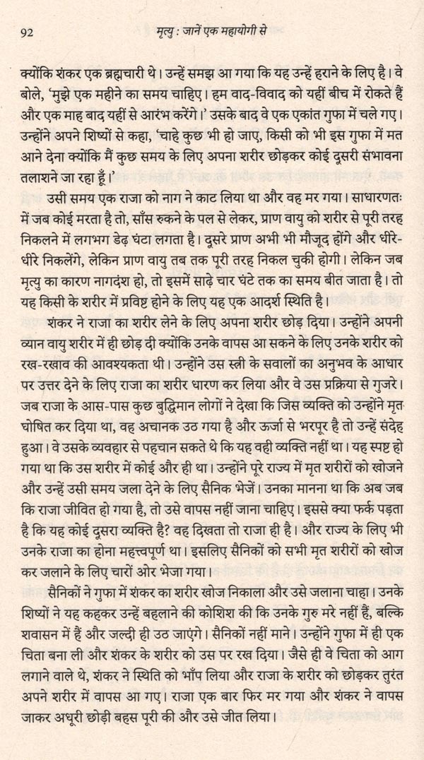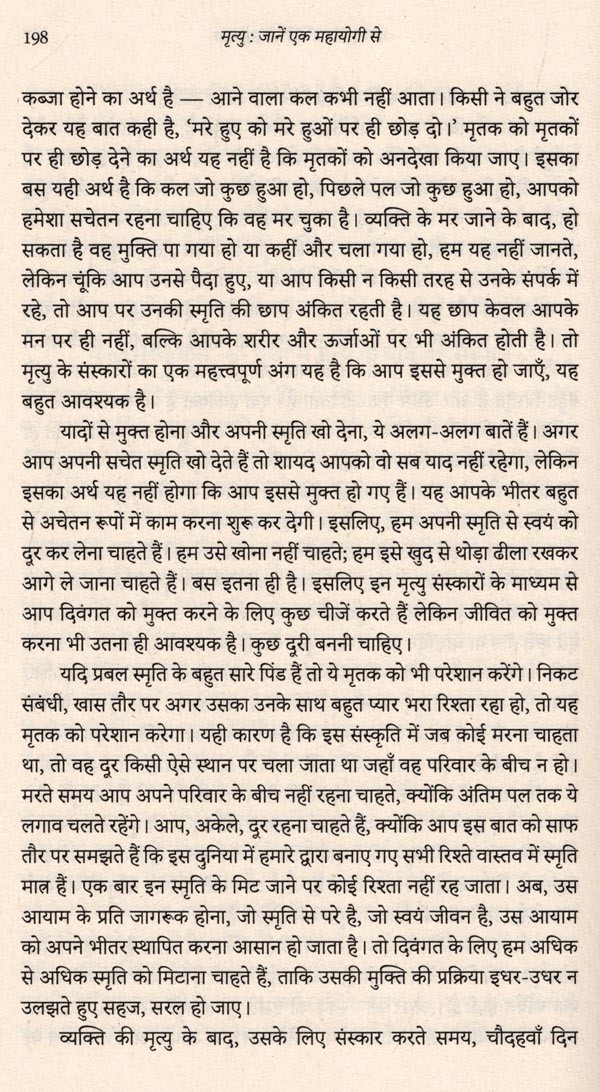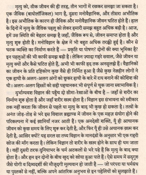 इस अनूठी पुस्तक में, सद्गुरु मृत्यु के अनकहे, अनजाने पहलुओं पर चर्चा करते हुए, अपने आंतरिक अनुभव से इसके कई रहस्यों को उजागर कर रहे हैं। व्यावहारिक स्तर पर अपनी अंतर्दृष्टि साझा करते हुए, वे हमें बताते हैं कि हम कैसे एक अच्छी मृत्यु की तैयारी कर सकते हैं, एक मरते इंसान के लिए हम सबसे अच्छी चीज़ क्या कर सकते हैं और मृत्यु के बाद मृतक की आगे की यात्ना को सुखद बनाने के लिए हम क्या-क्या कर सकते हैं।