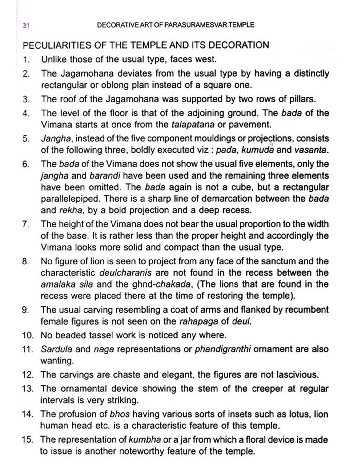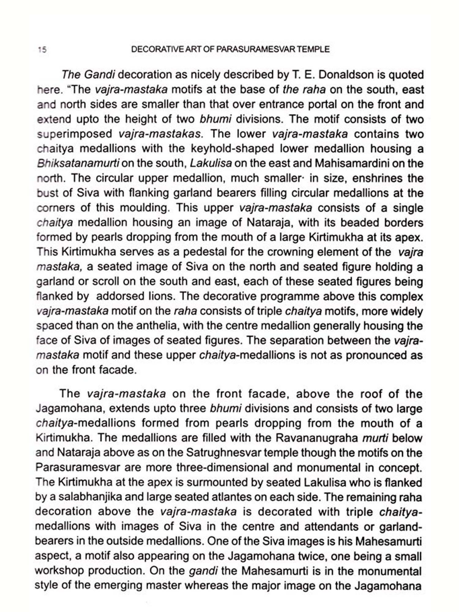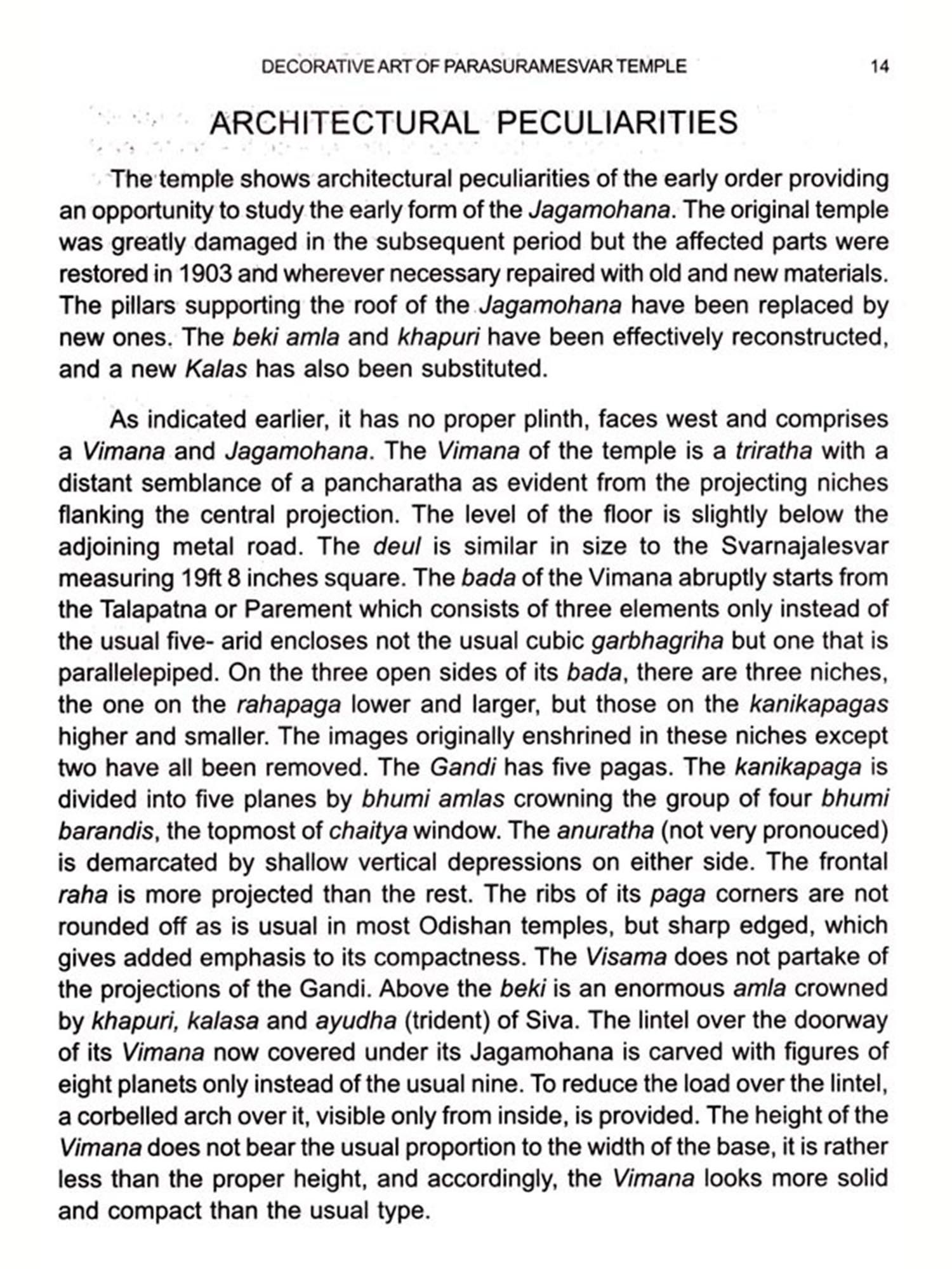 The present book is one of his last works prepared in thorough survey and documentation of the particular temple. The temple of Parasuramesvar, the most sumptuously decorated edifice of the early period, in good state of preservation, attracted the attention of Dr. Mohapatra for detailed study. In fact, the temple is marked for architectural treatment and sculptural arrangement embellished with different mythological scenes, sculptures and varieties of motifs. The plastic decoration of the exterior though unsophisticated in nature is superb and unchallenging; every piece of stone is of an informative nature. The interior, like other Odishan temples is simply plain though the exterior walls are intricately and profusely carved and decorated. One inexplicable feature of the temple is the character of the junction between the Jagamohana and the Deul-which implies that the two structures were built at different times. The Jagamohana appears to have been the subsequent addition as the sculptural style of the both are different. The carving of major images and the decorative arrangement are more advanced than that of the Deul. The discrepancy in style has prompted the scholars to speculate that the two structures are not contemporaneous to each other.