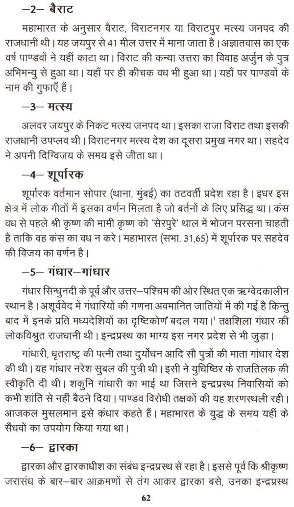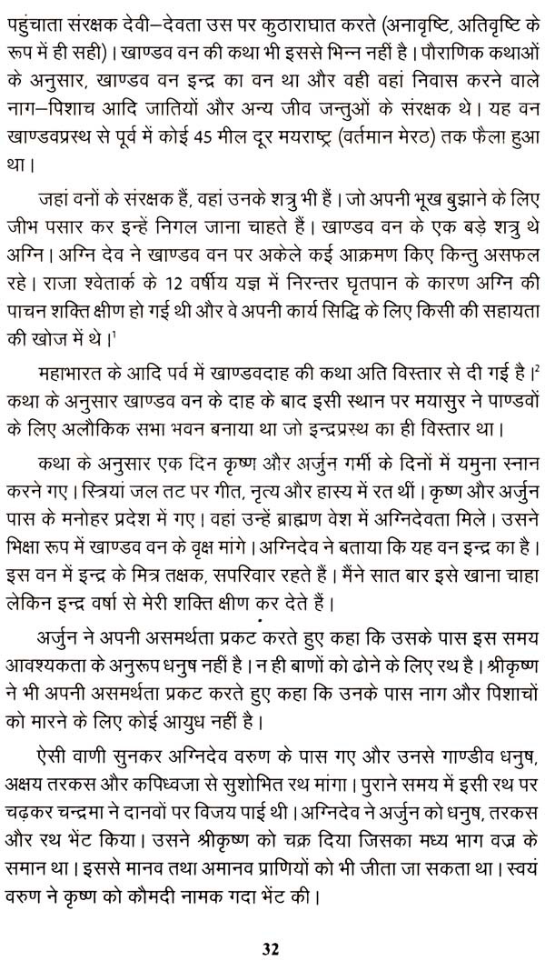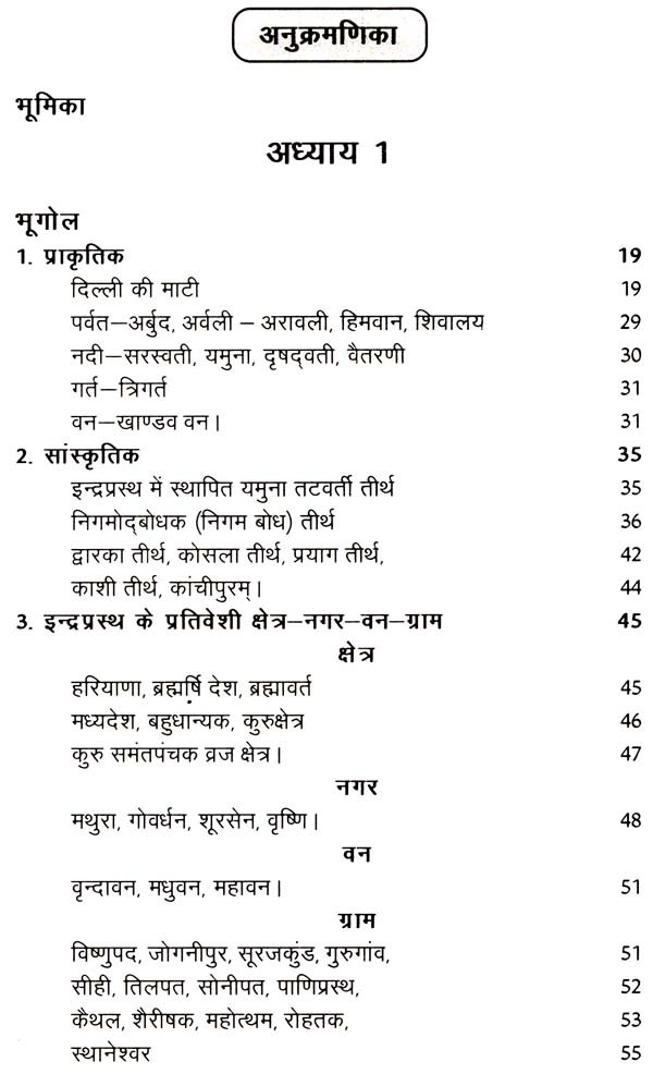 विषय प्रतिपादन की दृष्टि से वर्तमान ग्रंथ को दस अध्यायों में बांटा गया है। पहले अध्याय में दिल्ली के भूगोल पक्ष को प्राचीन और विशाल दृष्टिकोण से प्रस्तुत किया गया है। प्राकृतिक भूगोल में दिल्ली की माटी के निर्माण की कथा को पौराणिक तथा वैज्ञानिक दृष्टिकोण से प्रस्तुत किया गया है। इसी अध्याय में इन्द्रप्रस्थकालीन सांस्कृतिक महत्त्व के स्थानों का वर्णन किया गया है। इन्द्रप्रस्थ के प्रतिवेशी क्षेत्र, नगर, वन, ग्रामों के अतिरिक्त कुछ दूरस्थ क्षेत्रों का भी वर्णन है जिनका सीधा संबंध यहां की राजनीति और राजपरिवारों से रहा है।