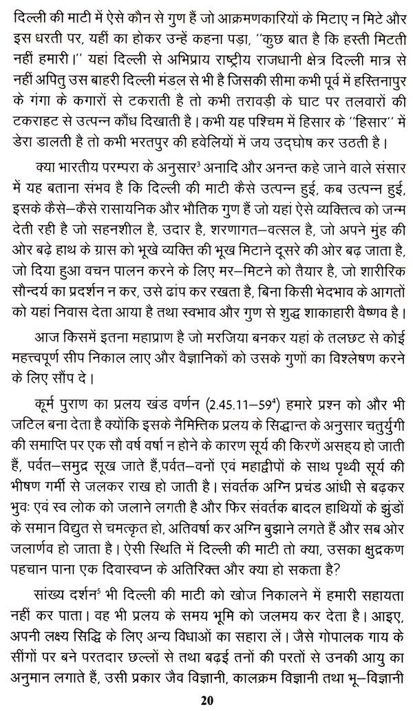 इस ग्रंथ का दो दृष्टियों से महत्व और भी बढ़ जाता है। एक यह कि देश स्वतंत्रता-प्राप्ति की स्वर्णजयन्ती मना रहा है। ऐसे समय में दिल्ली की सुदीर्घ, गौरवमय परम्परा को प्रस्तुत करने से देश के नागरिकों में एक नया स्वाभिमान जाग्रत होगा। दूसरे, बीसवीं शताब्दी समाप्त होने को है। लेखक ने गत 50 वर्षों से दिल्ली की घटनाओं को साक्षी के रूप में देखा है तथा इससे 50 वर्ष पहले की बातों को परिवार और मित्रजनों से स्वयं सुना है। इस तरह वर्तमान ग्रंथ में दिल्ली की एक सौ वर्ष की कहानी के अनेक अंश समा गए हैं। ग्रंथ में एक सामान्य नागरिक का चिन्तन है जो शोध की भाषा में बृहत् प्रतिदर्श (साम्पल) का प्रतिनिधि घटक है और इस घटक के जीवन में किसी वर्ग विशेष के प्रति लगाव-लपेट नहीं है।