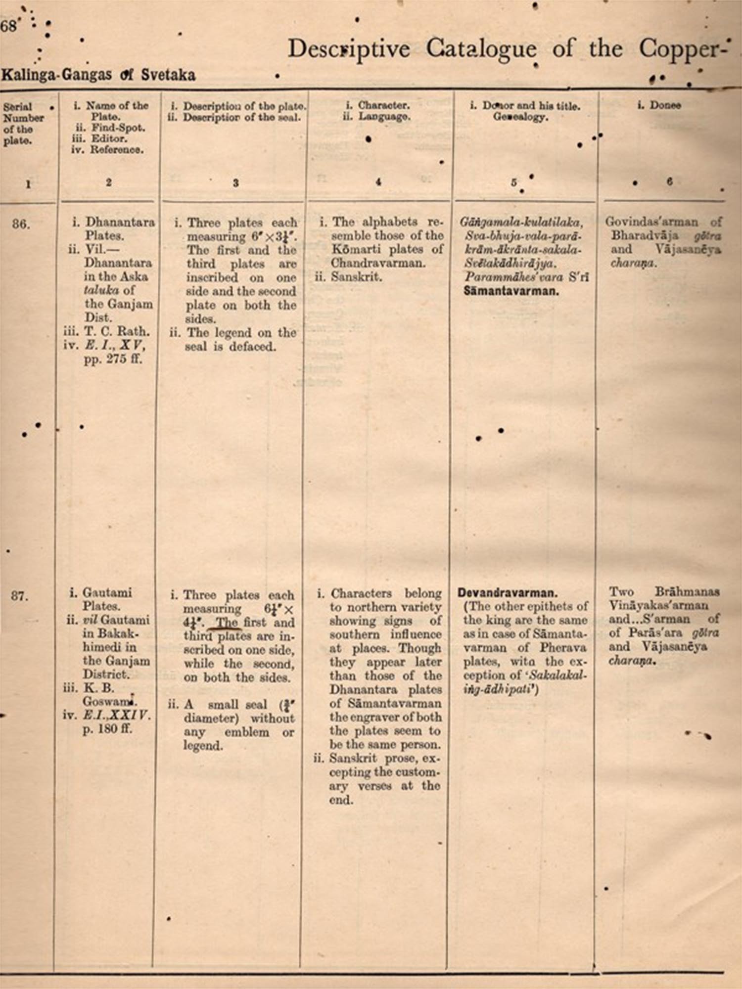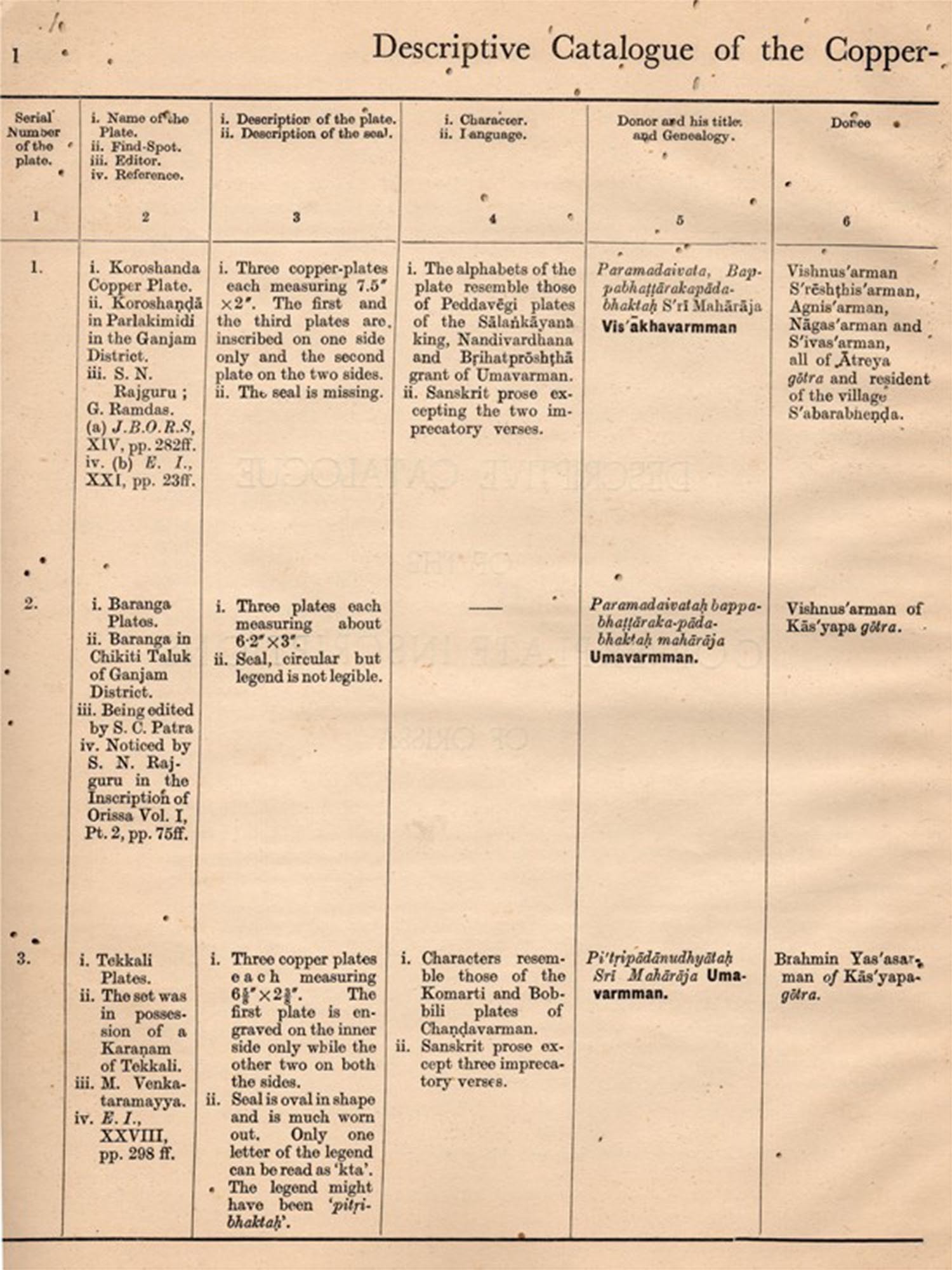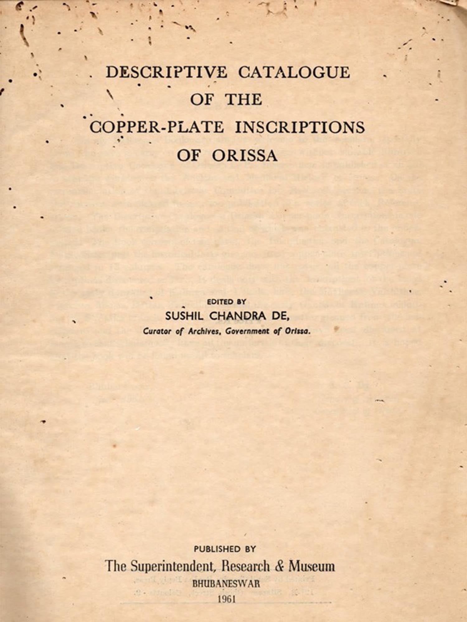 Handy Reference Books are always welcome to the scholars, specially those who have to carry on their researches at places without suitable libraries. The Descriptive Catalogue of Orissan C. P. Inscriptions is published as an aid to scholars working on the Ancient and Medieval History of Orissa. On the recommendation of the Advisory Committee for Research Section the State Government were pleased to sanction publication of a series of such Reference Books. The Descriptive Catalogue of Orissan Copper-plate Inscriptions is one of such books, the compilation and edition of which was entrusted to the under-signed. The Book consists of two parts, the Introduction and the Catalogue. In the latter part the historical facts gleaned from copper-plate inscriptions are arranged in 13 columns. The catalogue does not cover all the copper-plate inscriptions discovered so far. It deals only with the inscriptions of the kings of the early dynasties of Kalinga and Utkala, like, the Matharas, Väishithas, Vigrahas, Manas, Datta's, S'ailődbhavas and the early Ganga's of Kalinga including the S'vetaka branch. In the Introduction the matter gleaned from the inscriptions and the different theories relating to them have been discussed at length so that scholars may have all the materials at their disposal. It is hoped that the book will be found useful to scholars.