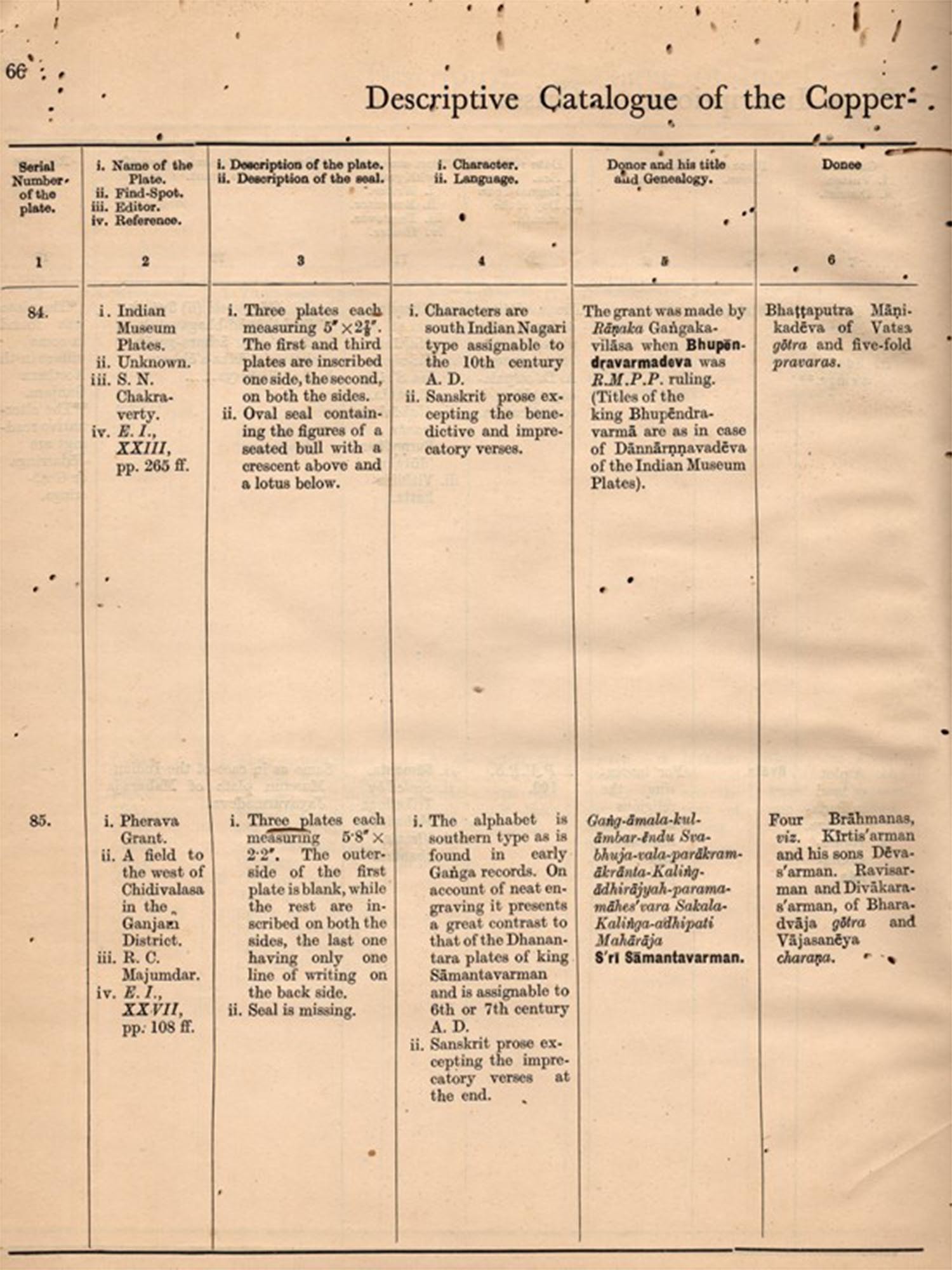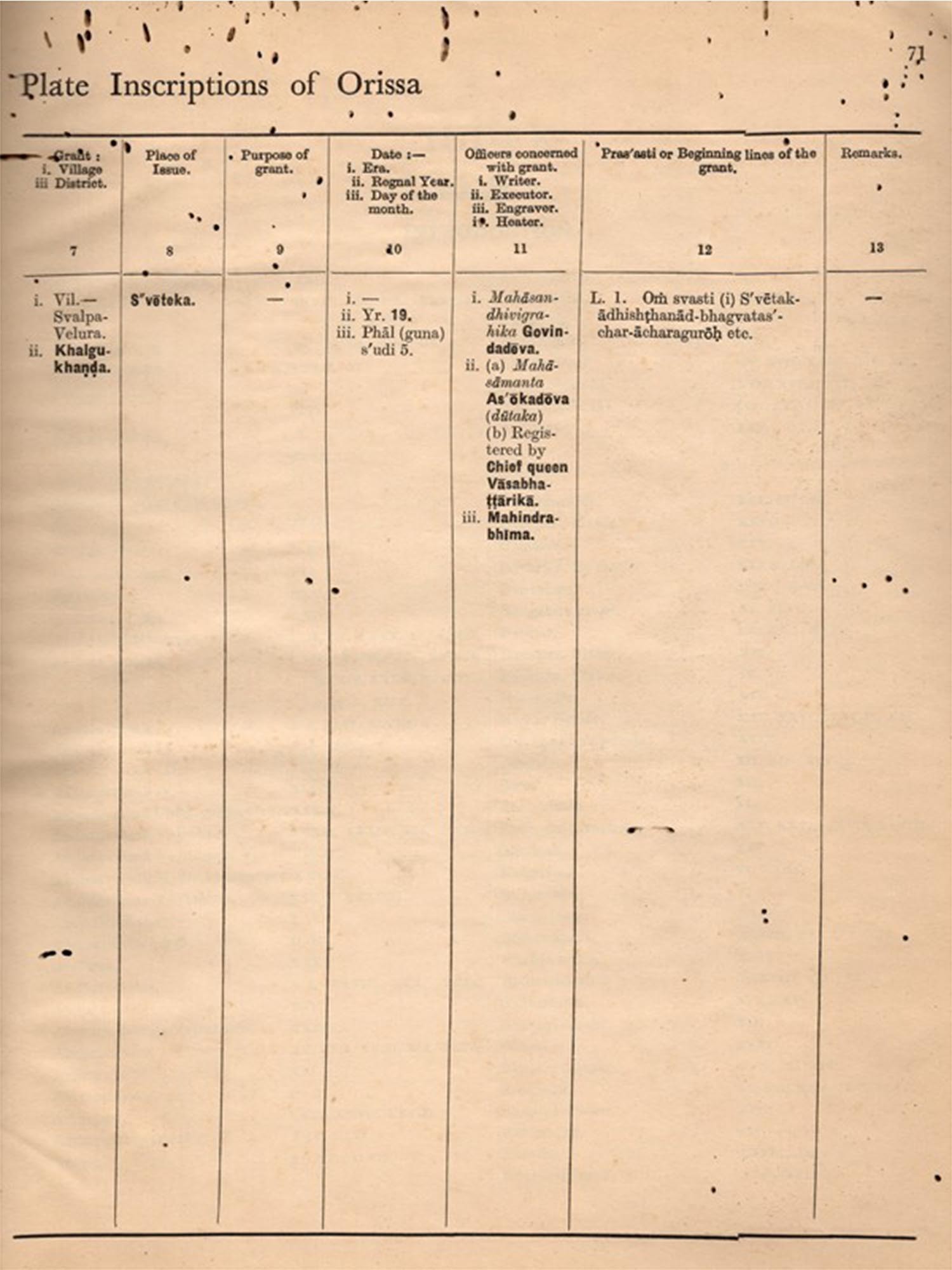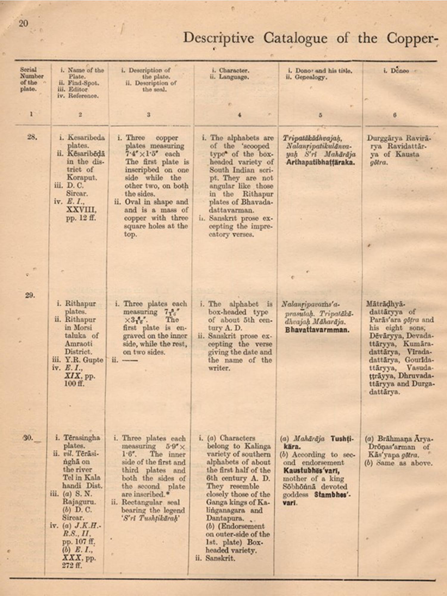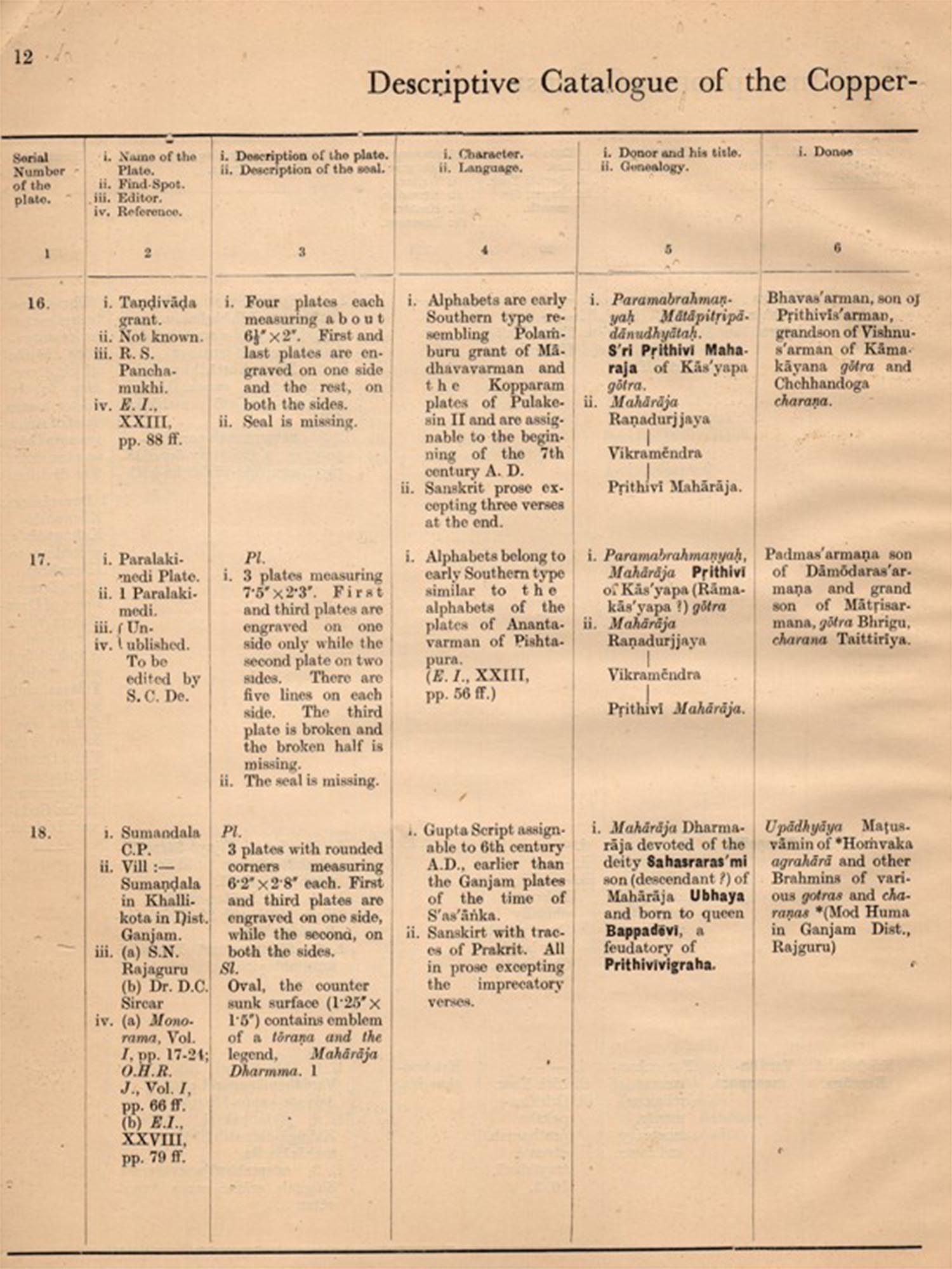 Handy Reference Books are always welcome to the scholars, specially those who have to carry on their researches at places without suitable libraries. The Descriptive Catalogue of Orissan C. P. Inscriptions is published as an aid to scholars working on the Ancient and Medieval History of Orissa. On the recommendation of the Advisory Committee for Research Section the State Government were pleased to sanction publication of a series of such Reference Books. The Descriptive Catalogue of Orissan Copper-plate Inscriptions is one of such books, the compilation and edition of which was entrusted to the under-signed. The Book consists of two parts, the Introduction and the Catalogue. In the latter part the historical facts gleaned from copper-plate inscriptions are arranged in 13 columns. The catalogue does not cover all the copper-plate inscriptions discovered so far. It deals only with the inscriptions of the kings of the early dynasties of Kalinga and Utkala, like, the Matharas, Väishithas, Vigrahas, Manas, Datta's, S'ailődbhavas and the early Ganga's of Kalinga including the S'vetaka branch. In the Introduction the matter gleaned from the inscriptions and the different theories relating to them have been discussed at length so that scholars may have all the materials at their disposal. It is hoped that the book will be found useful to scholars.