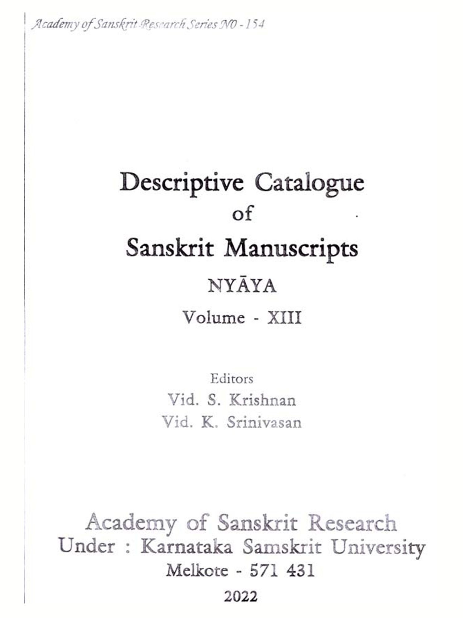 It is a great pleasure that Academy of Sanskrit Research. Melukote is going to publish descriptive catalogue of samskrit manuscript (volume no. XIII) which contains valuable information about the Nyaya texts. The ASR has got a rich collection of manuscripts on various subjects which are utilized by research scholars and traditional experts.