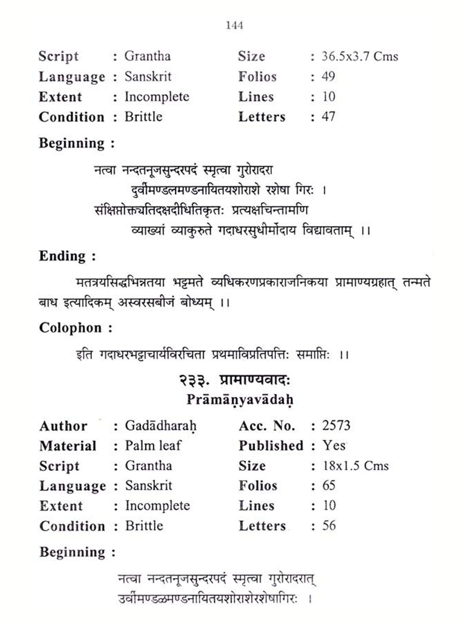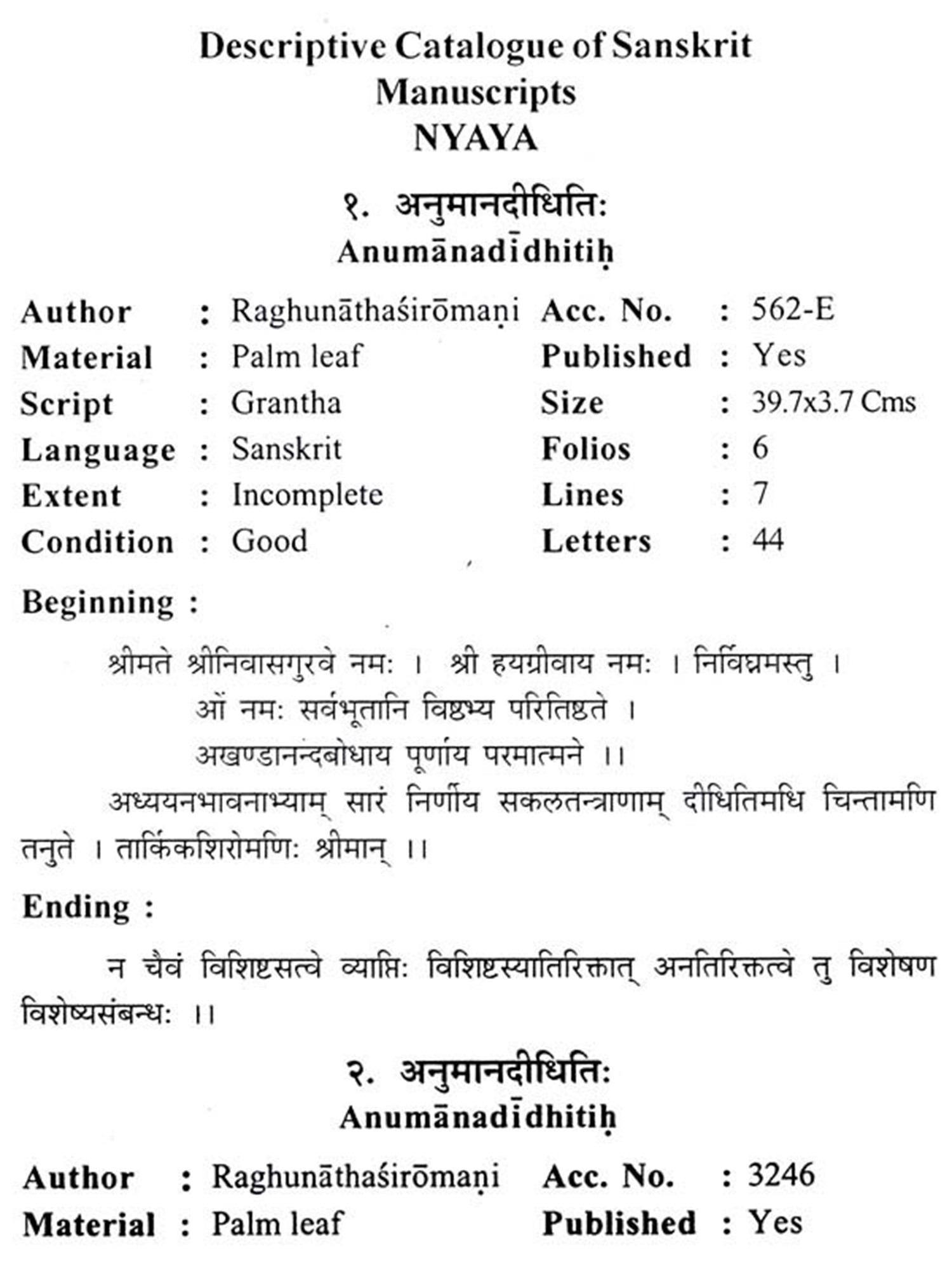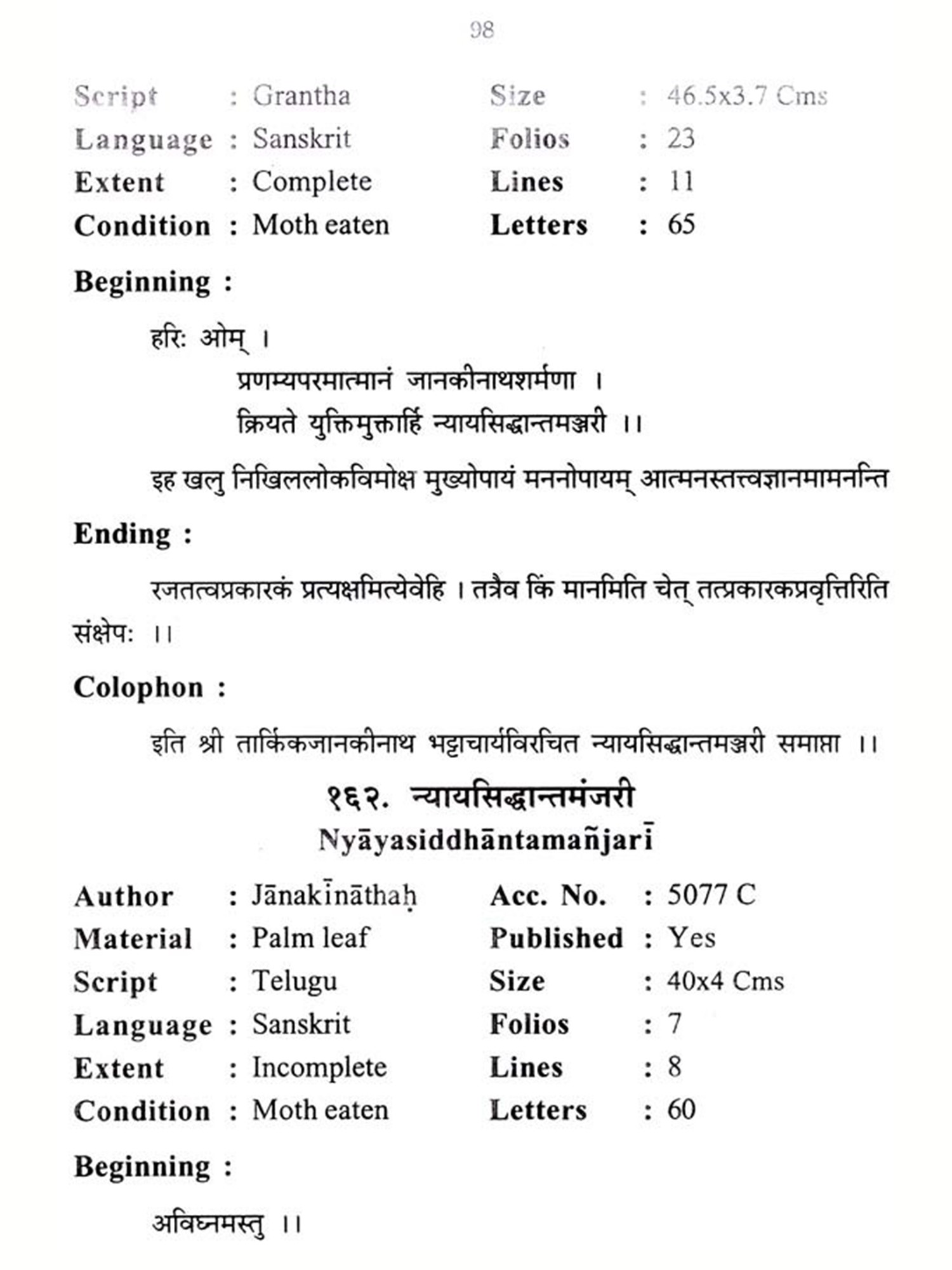 Descriptive catalogue of Nyaya manuscripts is very much needed in the present scenario, since there are numerous manuscripts which have a vast treasure of knowledge hidden in them require the attention of researchers to unearth for the benefit of knowledge seekers in the field of Indology. The system of Navya Nyaya which was prevalent and follwed by the scholars in the area of Nadiya of Bengal and Mithila of Bihar gradually spread towards south.