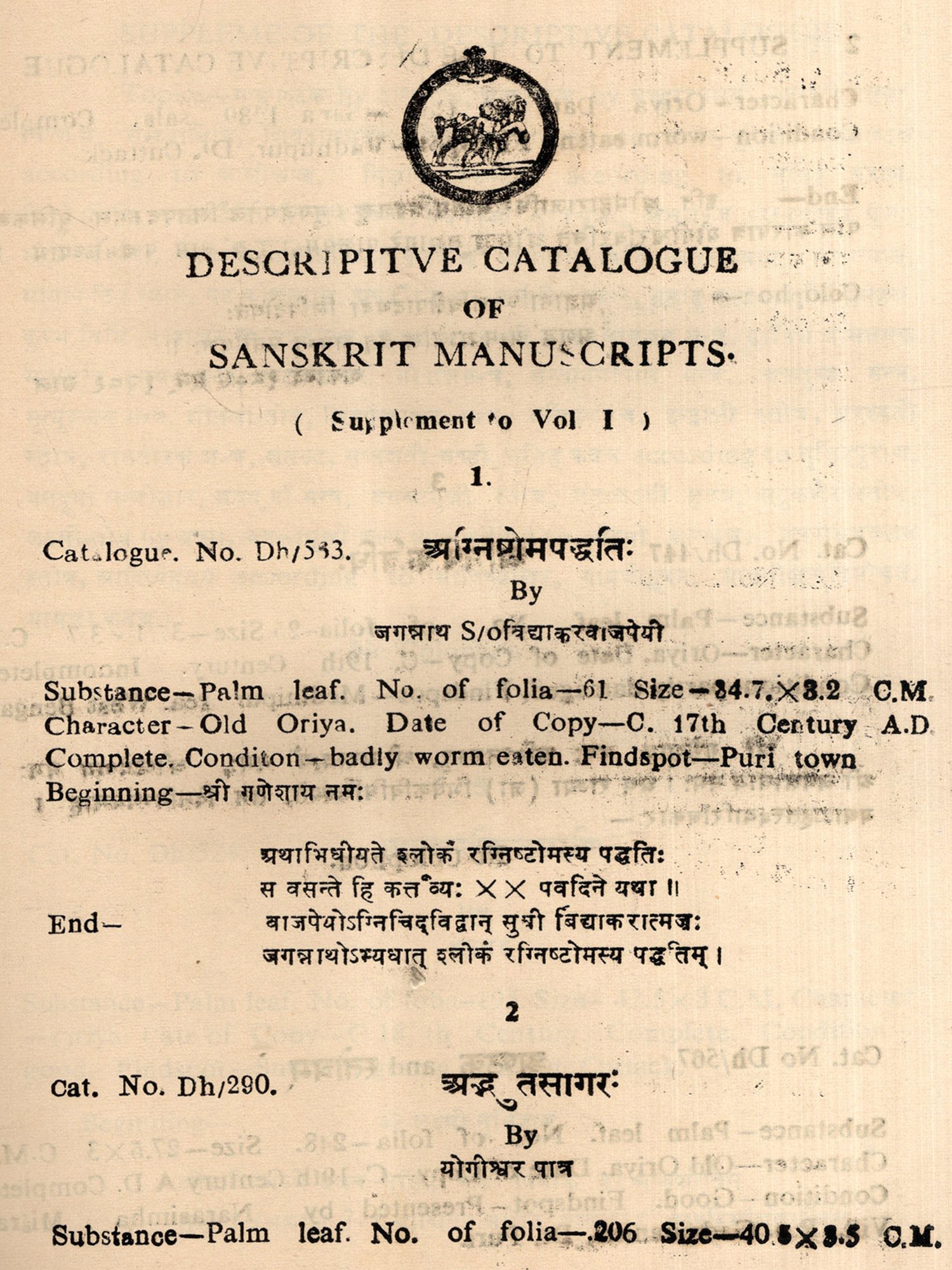 A Descriptive Catalogue of Sanskrit Manuscripts of Orissa in the Collection of the Orissa State Museum Bhubaneswar- Volume-1, Smrti Manuscripts (An Old and Rare Book)