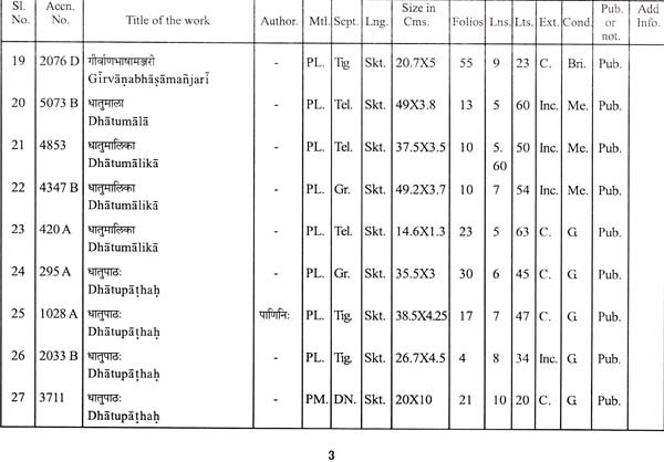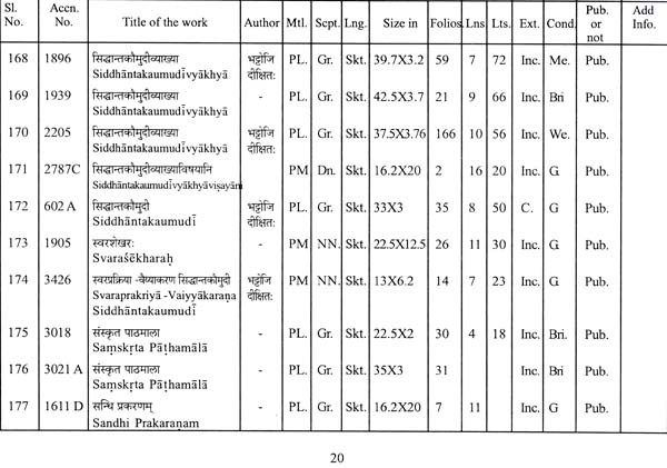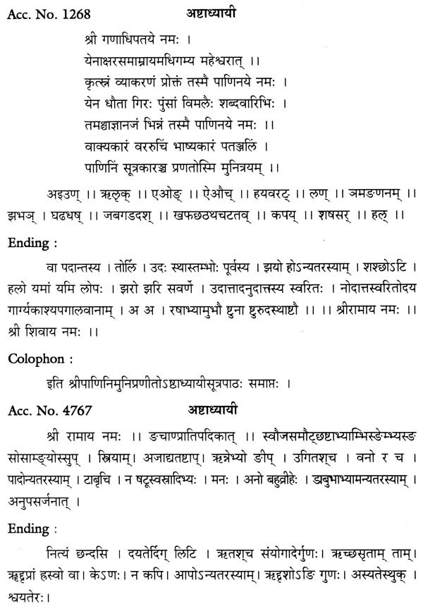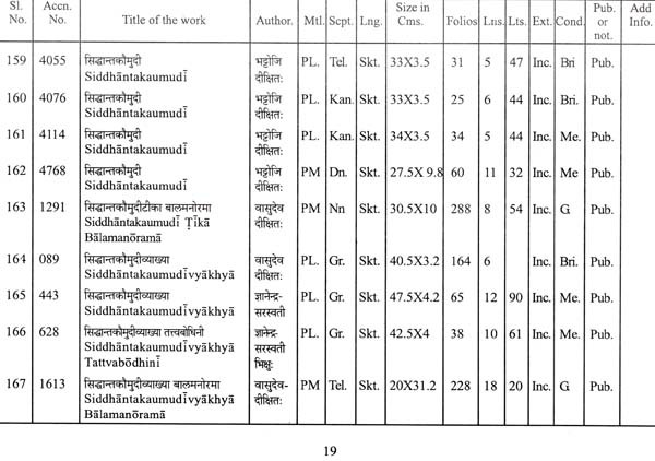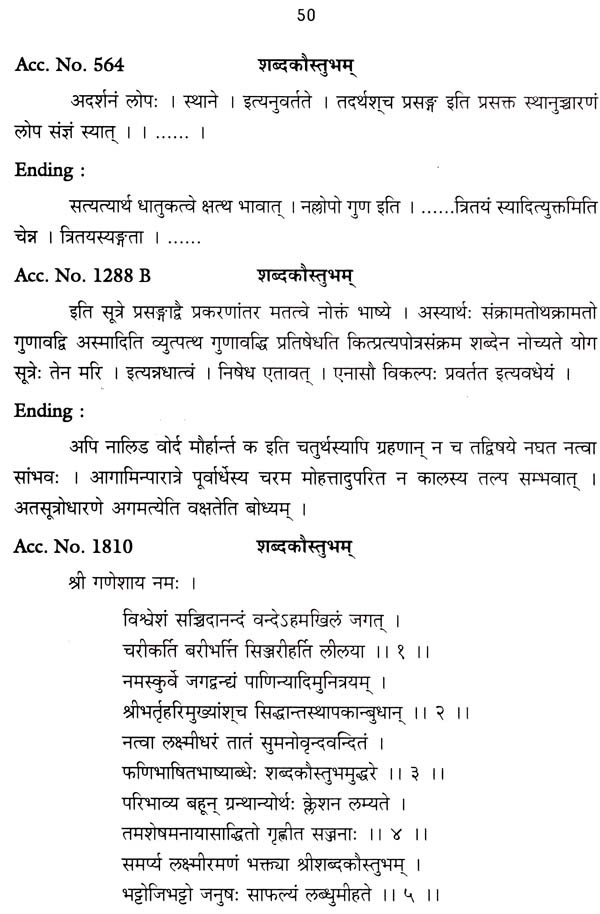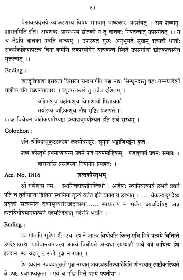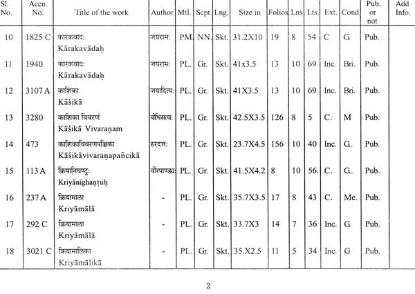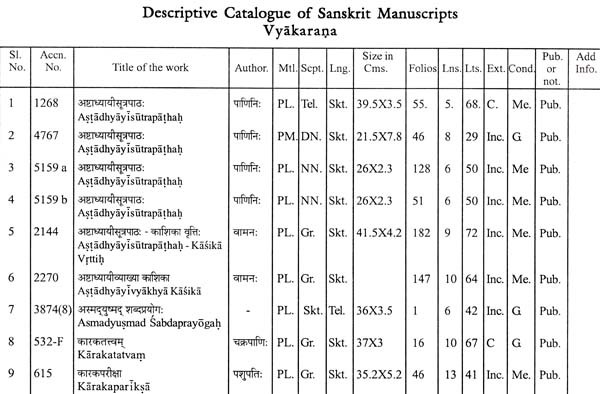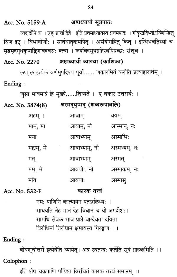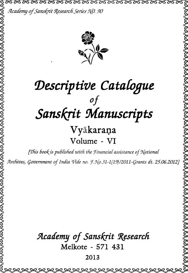 The Academy left no stone unturned in exploring for and collecting rare and valuable palm leaf manuscripts with the objective of studying the writings by erudite pandits of yore. The objective of the Academy is to share the knowledge and the manuscripts with scholars of today studying in the relevant disciplines. The volume has two parts. Part-A consists of a table with fourteen columns giving the title and author of the work both in English and Sanskrit along with other details. The codes used are elaborated elsewhere in the book. Part-B consists of the beginning, the ending and the colophon as they appear in each of the texts referred to in Part-A, in alphabetical order. The information in these pages will, we hope, prove useful to many students and research workers.