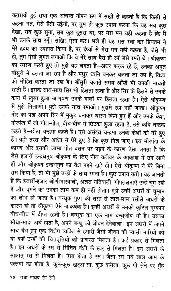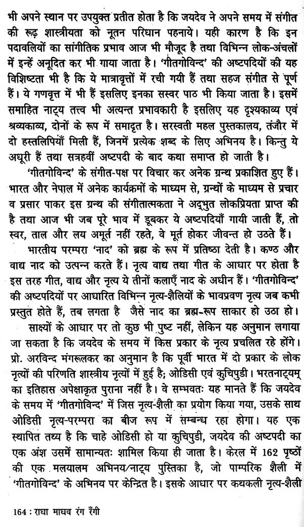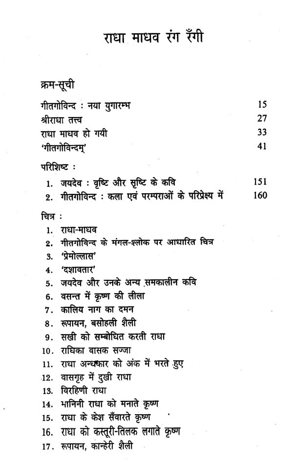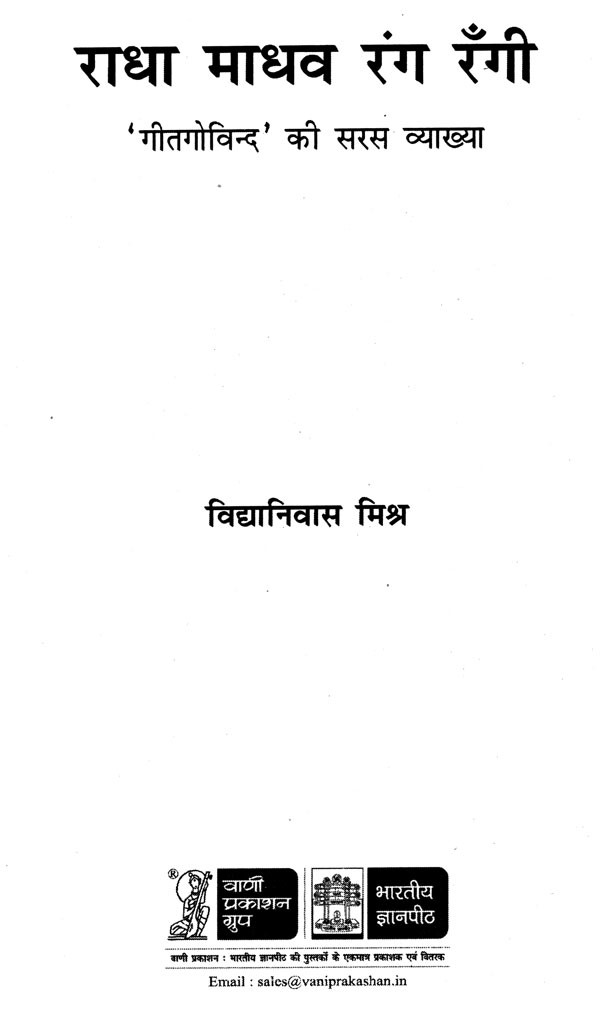 महाकवि जयदेव की कालजयी काव्यकृति 'गीतगोविन्द' भारत के सर्जनात्मक इतिहास की ऐसी महत्त्वपूर्ण घटना है जो निरन्तर प्रत्यक्ष अनुभव की जाती रही है; और आगे भी की जाती रहेगी। 'गीतगोविन्द' को देखने-सुनने और समझने की भी एक अविच्छिन्न परम्परा रही है, और यह परम्परा ही उसे एक जीवनरस-सृष्टि के रूप में परसे हुए है। इसी परम्परा में एक और नयी कड़ी है यह पुस्तक- राधा माधव रंग रेंगी। राधा माधव रंग रंगी मूर्धन्य साहित्यकार और चिन्तक पं. विद्यानिवास मिश्र द्वारा की गयी 'गीतगोविन्द' की सरस व्याख्या है। विभिन्न भाषाओं में हुई 'गीतगोविन्द' की टीकाओं और व्याख्याओं के बीच यह व्याख्या निस्सन्देह अद्भुत है, अद्वितीय है। इसमें जिस सूक्ष्मता से 'गीतगोविन्द' का विवेचन हुआ है, वह विलक्षण तो है ही, भावविभोर और मुग्ध कर लेने वाला भी है। दरअसल डॉ. विद्यानिवास मिश्र ने जयदेव की इस कृति को जिस स्तर पर जाना-पहचाना है, वह राधा और कृष्ण के स्वरूप पर अनोखा प्रकाश डालता है। पण्डित जी ने अपनी लालित्यपूर्ण सशक्त अभिव्यक्ति द्वारा इस काव्यकृति को नये अर्थ और नयी भंगिमाएँ दी हैं। कहना न होगा कि उनके शब्द 'गीतगोविन्द' के सार को जिस ढंग से पहचानते हैं, वह जयदेव की अप्रतिम काव्यात्मक अनुभूति के साथ ही स्वयं पण्डित जी की गहरी चेतना का भी साक्षी है। साहित्य के सुधी अध्येताओं के लिए एक ऐसी अनूठी पुस्तक जिसे पढ़ना एक प्रीतिकर उपलब्धि होगी...