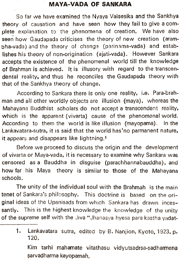 The author has tried to trace the development of these two words in the vedanta and other Indian philosophies. There is a striking similarity between the theory of the Mahayana Buddhism and the philoiophy of Sankara regarding the concept of Maya.