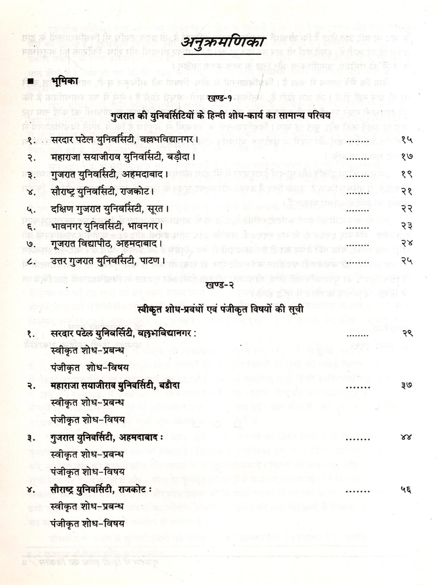 स्वतंत्रता के पश्चात् भारत सरकार ने उच्च शिक्षण को प्रोत्साहन दिया। परिणाम स्वरूप प्रत्येक प्रदेश में अनेक नये विश्वविद्यालय स्थापित हुए। भारतीय संविधान ने हिन्दी को राजभाषा के रूप में मान्यता प्रदान की, जिसके कारण प्रायः सभी विश्वविद्यालयों में हिन्दी का पठन-पाठन होने लगा। राजभाषा होने के कारण विदेशों के सैकड़ों विश्वविद्यालयों में हिन्दी पढ़ाई जाने लगी। हाल ही में भारत सरकार ने वर्धा में अन्तर्राष्ट्रीय विश्वविद्यालय की भी स्थापना कर दी है। हिन्दी के इन बढ़ते चरणों को देखकर यह आवश्यक प्रतीत होता है कि भारत के प्रत्येक विश्वविद्यालय द्वारा किये गये हिन्दी भाषा साहित्य संबन्धी शोधकार्य का सर्वेक्षण किया-कराया जाय और उसे सुसंपादित रूप में प्रस्तुत किया जाय। इसी उद्देश्य से गुजरात के आठ विश्वविद्यालयों के द्वारा सन् १९६४ ई. से सन् १९९७ ई. तक के स्वीकृत शोध प्रबन्धों और पंजीकृत विषयों की यह सूची गुजरात की हिन्दी साहित्य अकादमी के द्वारा प्रकाशित की जा रही है।