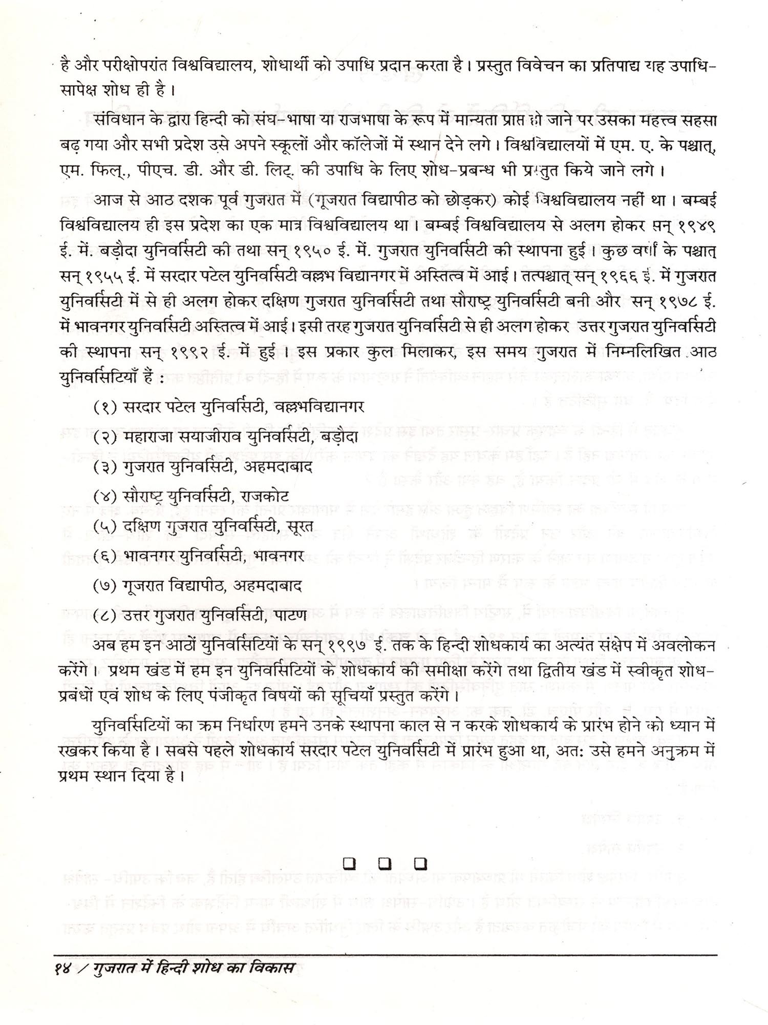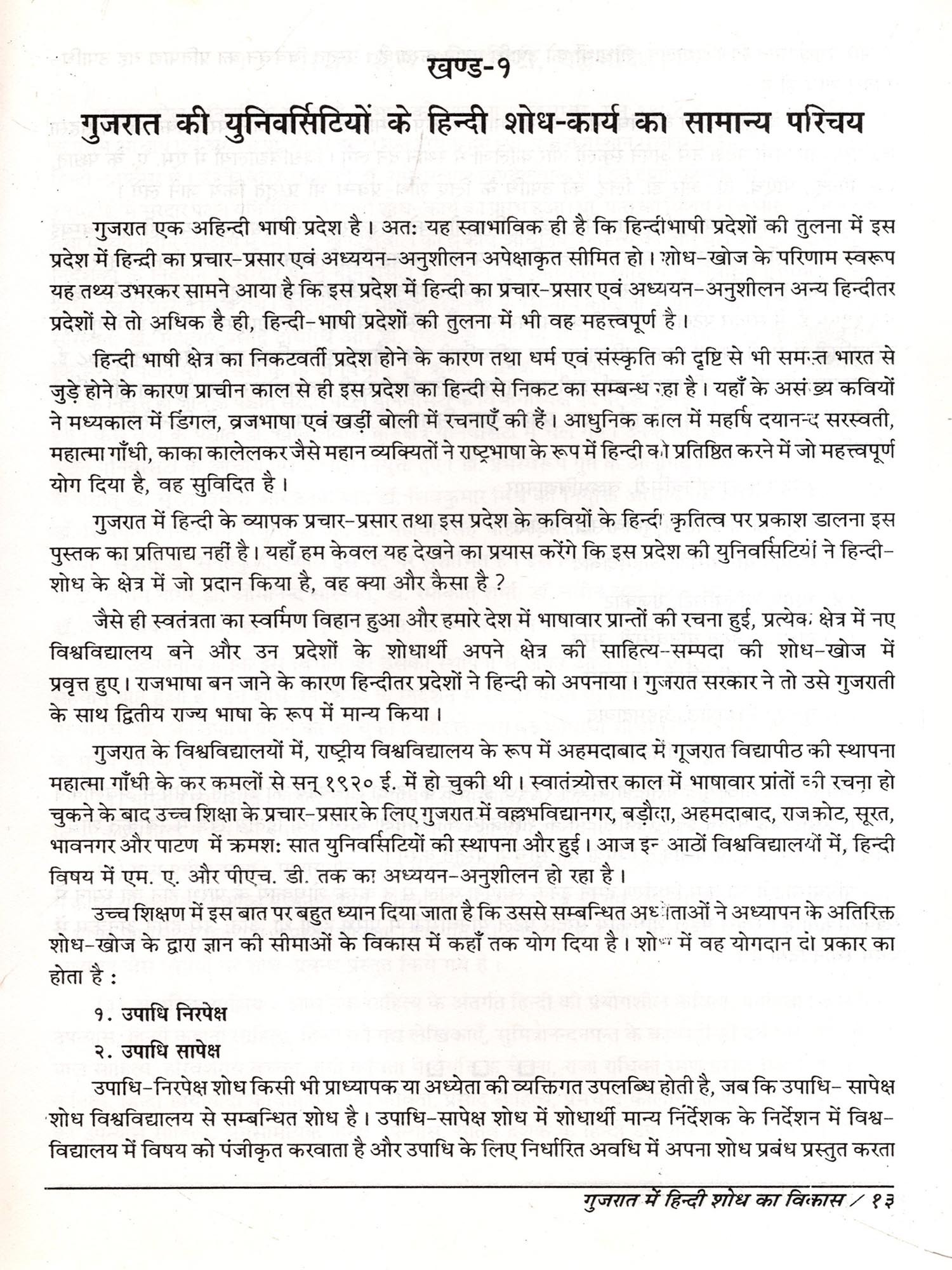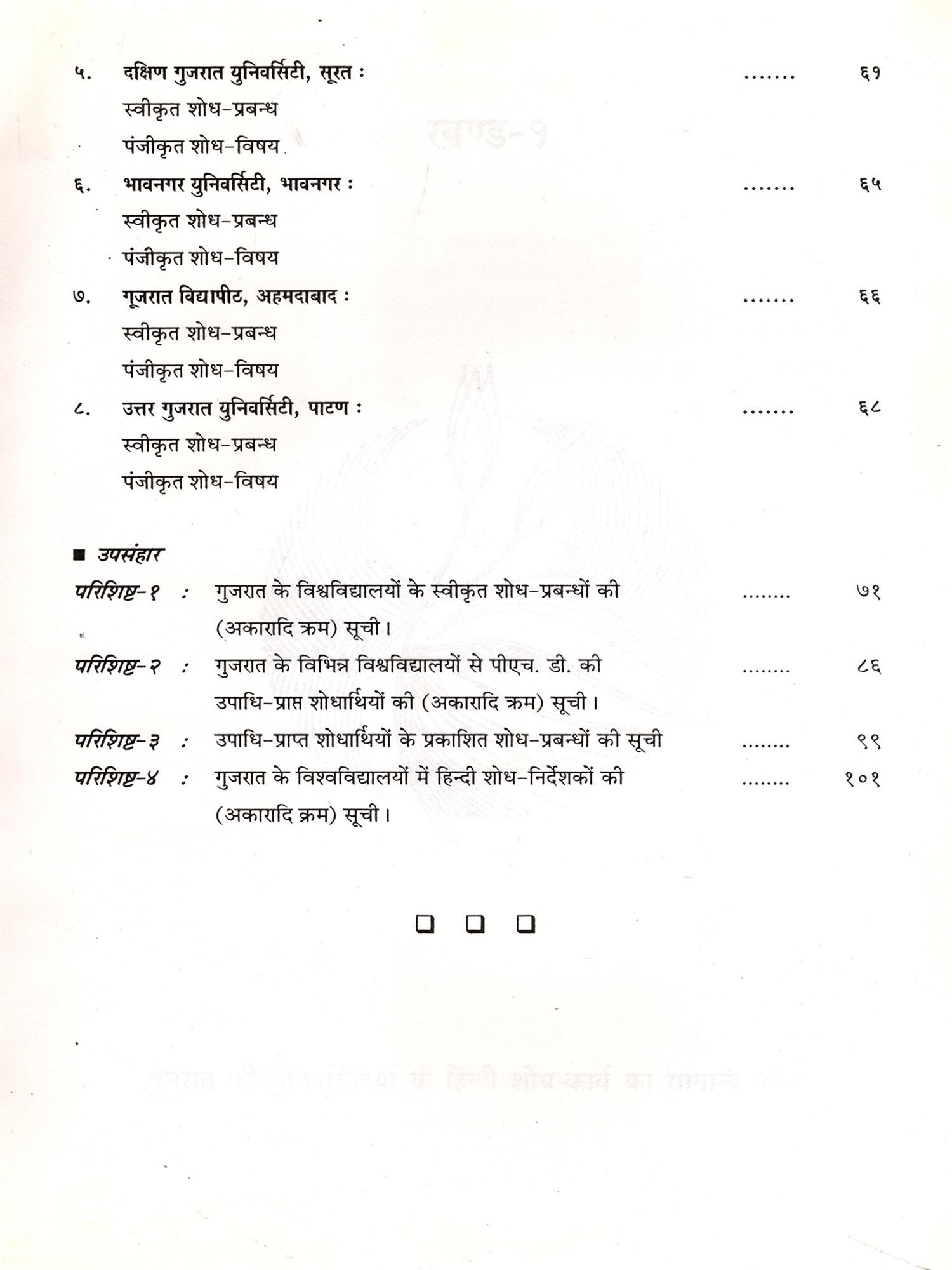 गुजरात में हिन्दी विषय में पीएच. डी. उपाधियों का प्रारंभ सन् १९६४ ई. से हुआ था। अतः सन् १९६४ १. से सन् १९८० ई. तक के स्वीकृत शोध-प्रबन्धों एवं पंजीकृत विषयों की सूची की पहली किश्त उपर्युक्त पत्रिका में पहलीबार प्रकाशित हुई। तत्पश्चात् सन् १९८४ ई. तक की संशोधित सूची हिन्दी साहित्य परिषद्, अहमदाबाद के द्वारा सन् १९८५ ई. में प्रकाशित मेरे अभिनन्दन ग्रंथ में छपी। इसके ठीक दस वर्ष बाद सन् १९९४ ई. तक की तीसरी सूची डॉ. रामकुमार गुप्त के अभिनन्दन ग्रंन्ध में प्रकाशित हुई। और अन्त में, सन् १९६४ ई. से लेकर सन् १९९७ ई. तक की यह संपूर्ण सूची अब आपके कर कमलों में है। जैसाकि पहले कहा जा चुका है इस शोध-सूची को तैयार करने का उद्देश्य हिन्दी शोध के विषयों में होने वाले पुनरावर्तन और शोध के गिरते स्तर को रोकना है। निर्देशक यदि शोधार्थी और शोध-विषय का चयन ठोक-बजाकर करे, सुयोग्य छात्र को उसकी रुचि और क्षमता के अनुकूल विषय दे। विषय की रूप-रेखा और सन्दर्भ ग्रन्थों को सूची छात्र को तैयार करवा दे और शोध के मूलभूत सिद्धान्तों से छात्र को अवगत कर देने के पश्चात ही उसे सामग्री संकलन और लेखन की अनुमति दे और शोध प्रबन्ध को अक्षरशः पढ़कर हो परीक्षण के लिए और अग्रसारित करे। इसी तरह परीक्षक भी शोध-प्रबन्ध का परीक्षण आद्योपांत पढ़कर करे तथा मौखिकी में रियायत न बरते, तो शोध का स्तर अपने आप उच्च से उच्चतर हो सकता है।